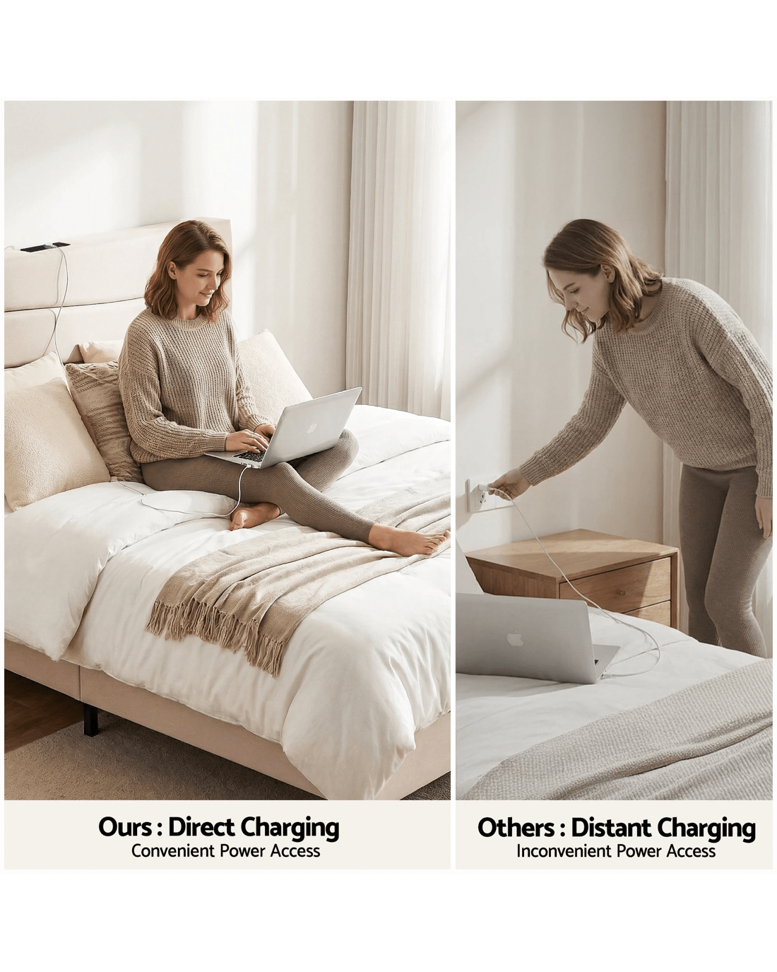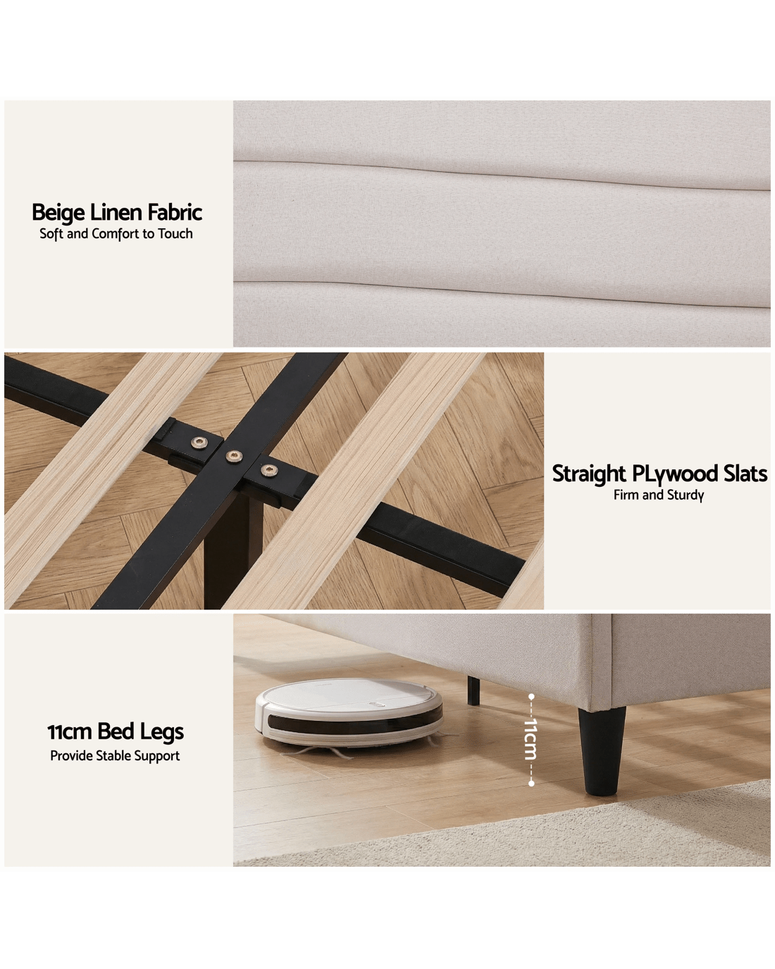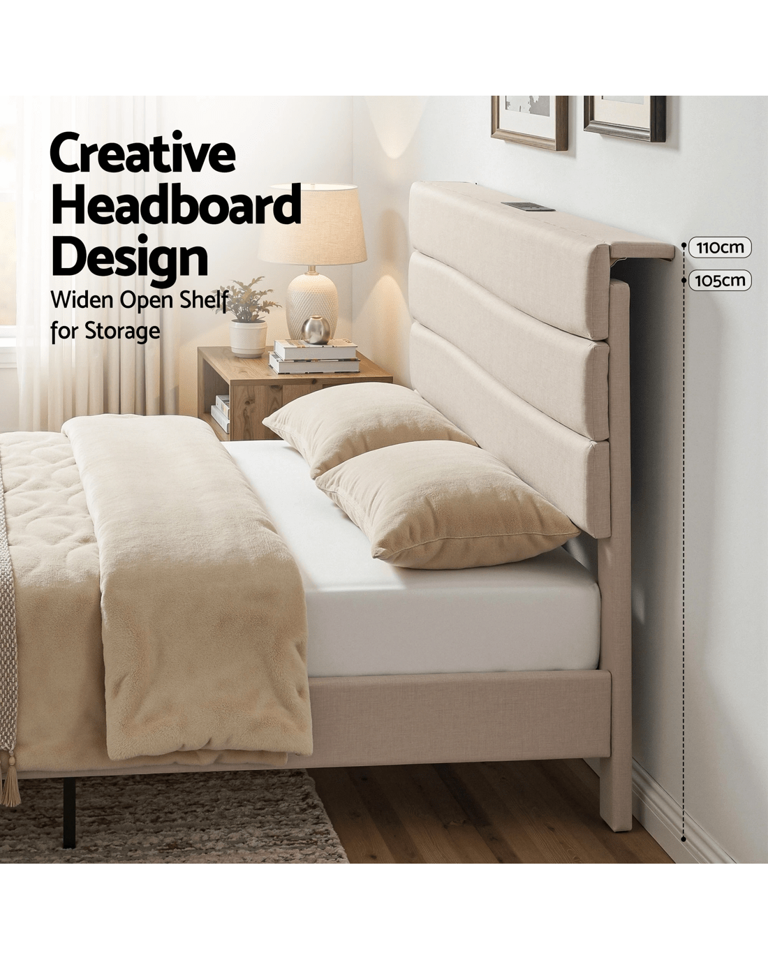 The Artiss Queen Bed Frame combines functionality with modern design. Its adjustable headboard features a built-in storage shelf and charging station (2 sockets + USB + Type-C ports), offering convenient power access. Crafted with sturdy pine wood and plywood slats, this platform bed base supports 300kg. The beige linen geometric headboard and 11cm elevated legs provide style and underbed space. Easy assembly included.