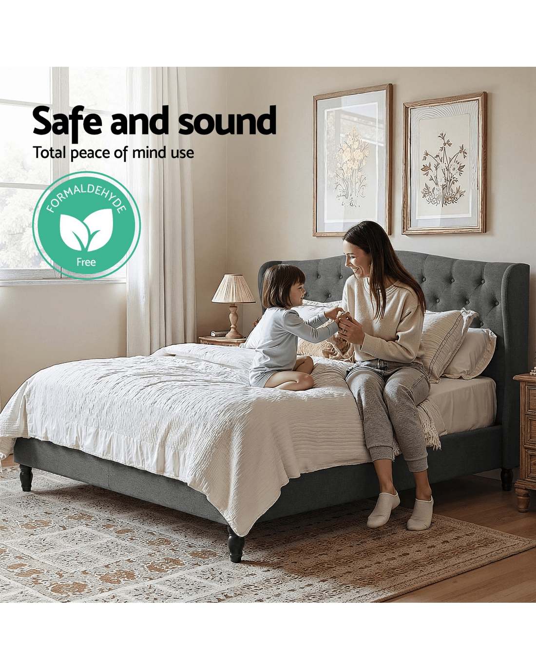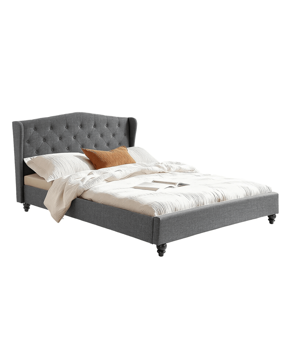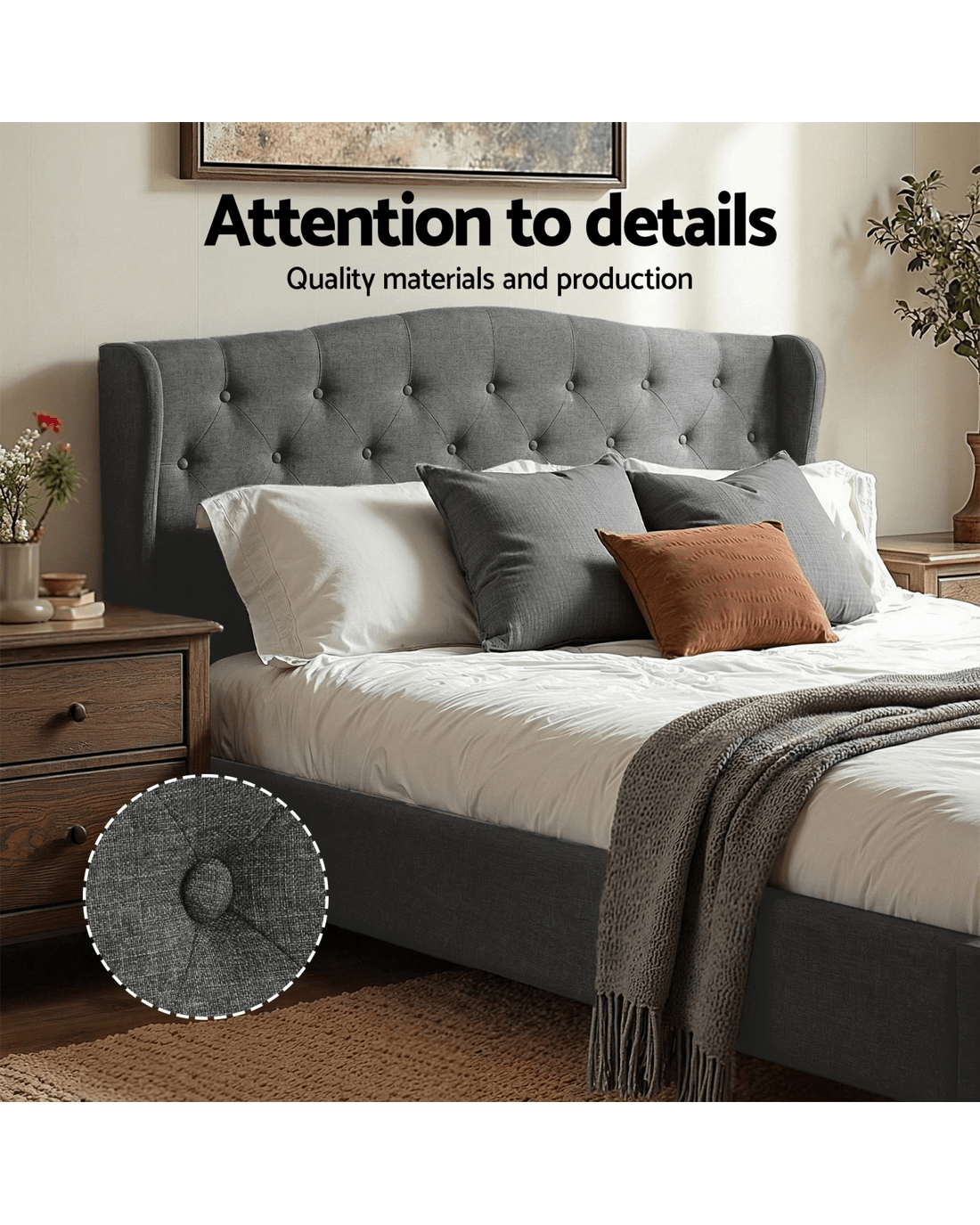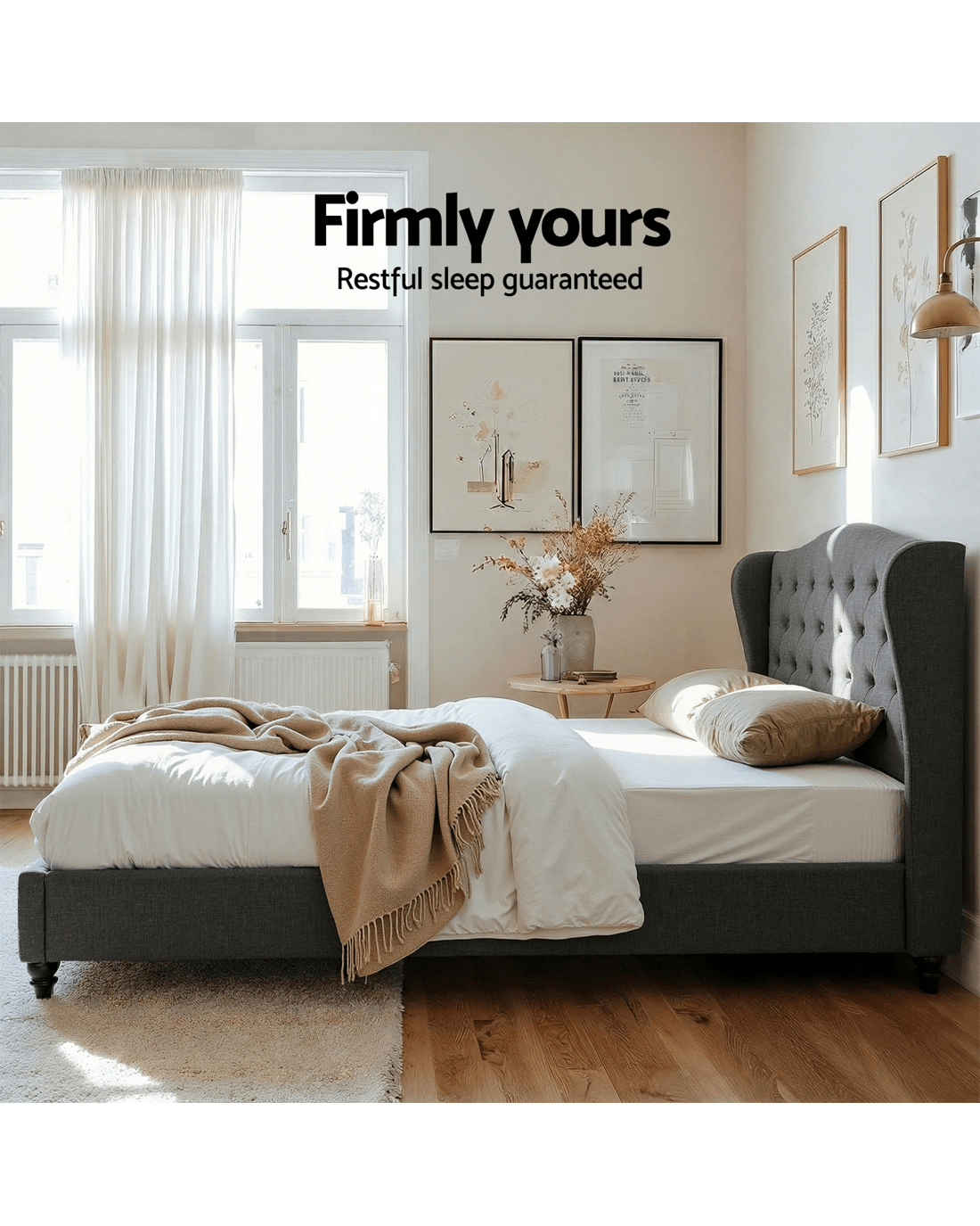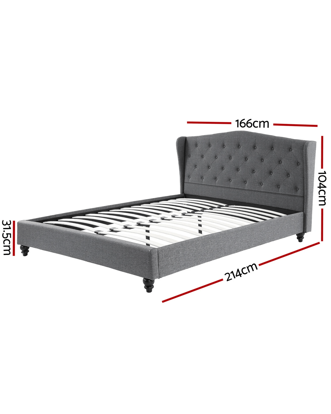 This Artiss Queen Bed Frame combines a wingback headboard with grey linen upholstery and high-density foam padding. Features a sturdy steel frame with reinforced bars, heavy-duty connectors, and a wooden slat base. Includes adjustable centre support. Fits standard Queen mattresses (203x153cm). Modern design for bedrooms. Overall dimensions: 214x166x104cm.