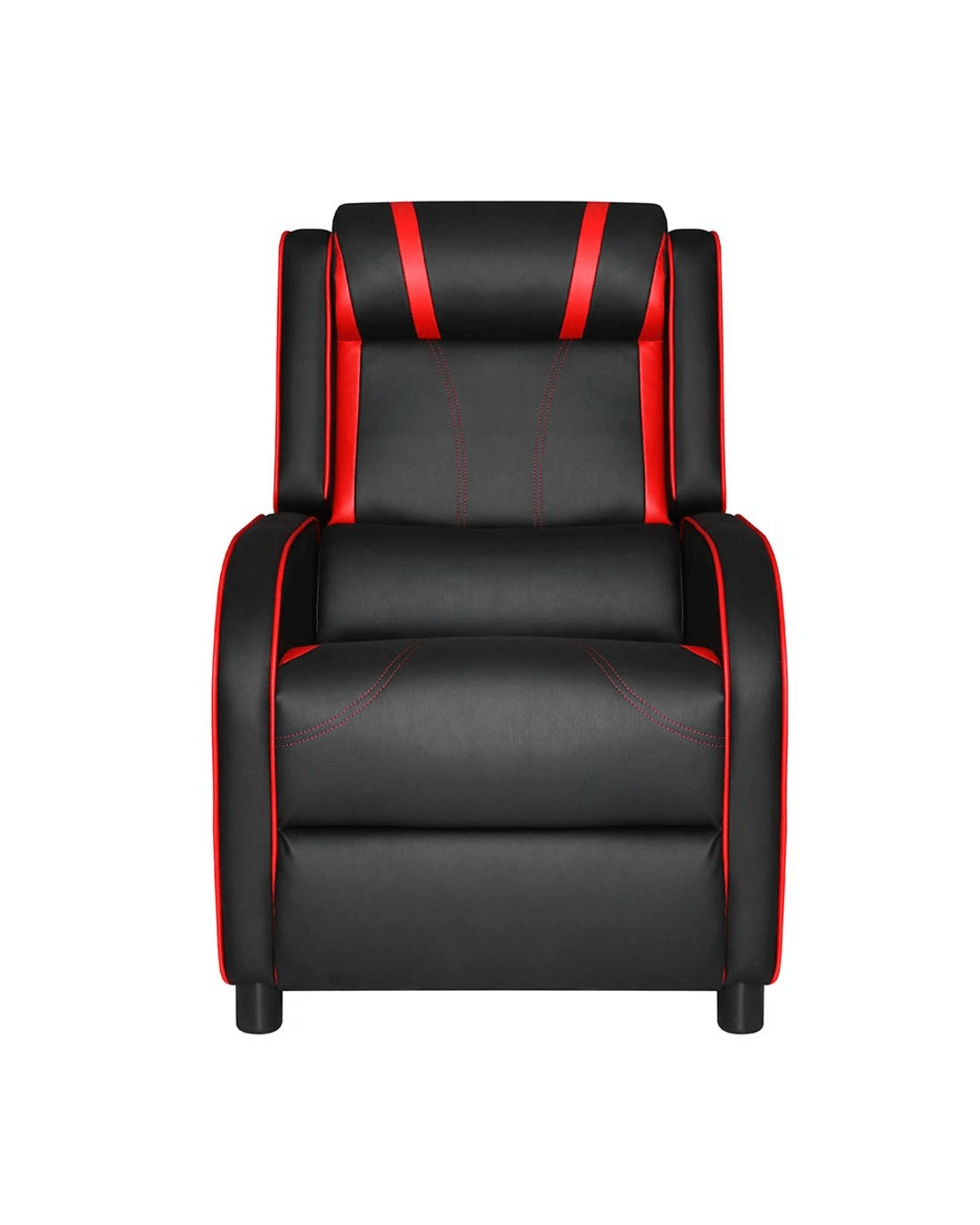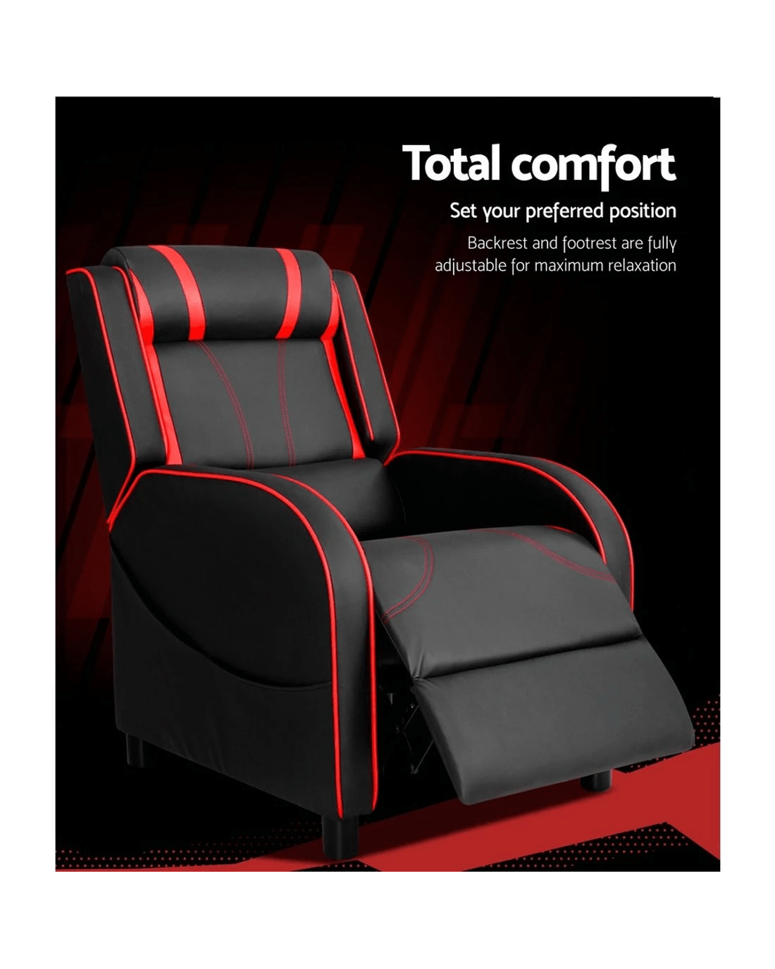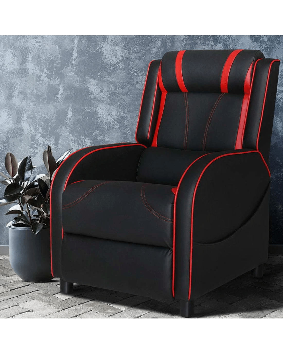 Enjoy gaming in cinema-style comfort with our Artiss Gaming Recliner Chair. Richly padded in high-resilience foam and upholstered in sporty black and red PU leather, the chair certainly looks and feels like it belongs in gold class. In the upright position, the recliner is a comfortable armchair. Or you can easily adjust the backrest and footrest to recline to your preferred angle. The backrest is wide and spacious with cushioned lumbar support and headrest to allow for full head and back support so that no matter the tilt, you have total-body comfort. Being larger and softer than the more common racer-style gaming chairs, the gaming recliner chair is much more suited to longer gaming sessions. And we all know how fast time flies when playing games. So, complete your home gaming arena with our gaming recliner chair for the perfect gaming experience.