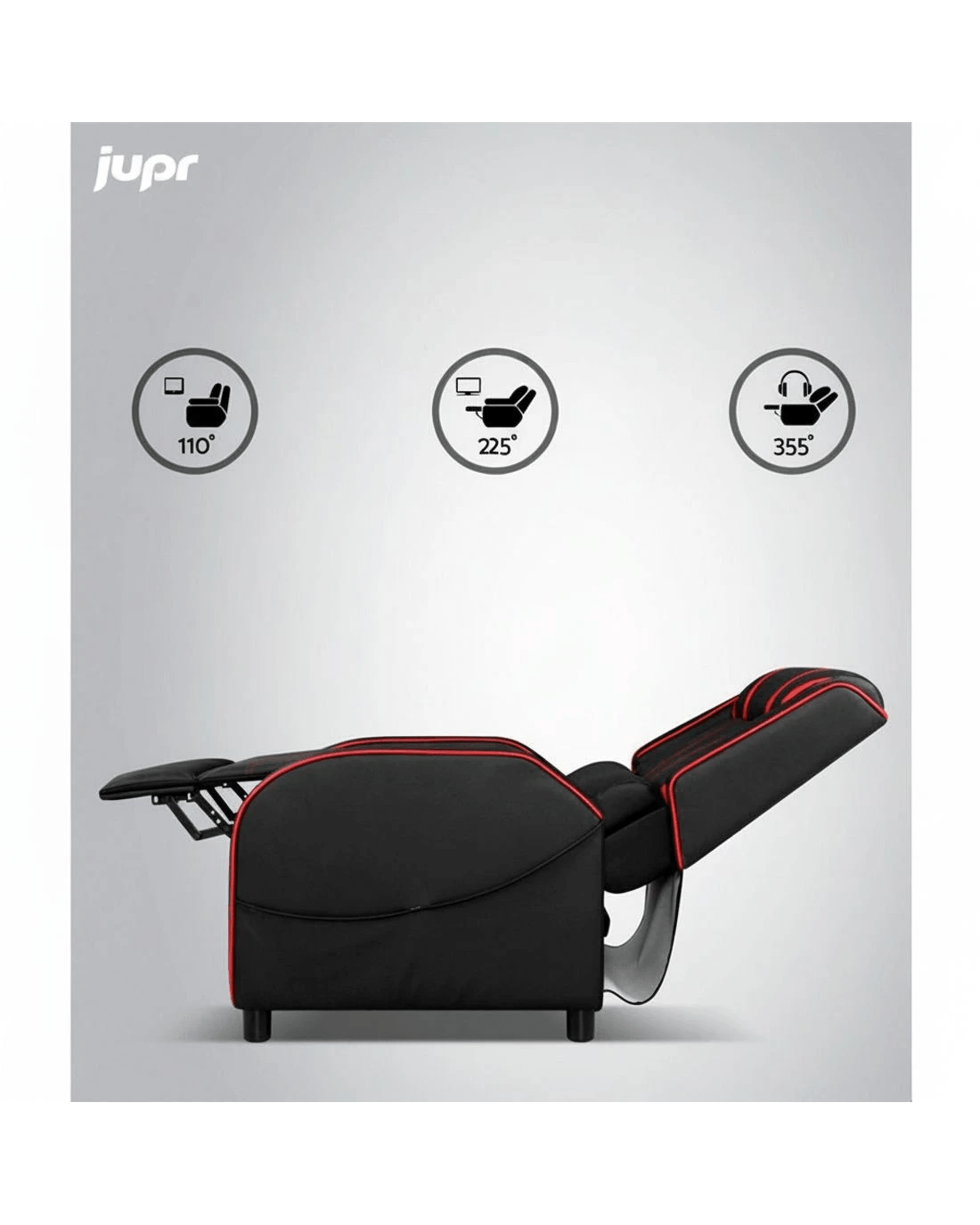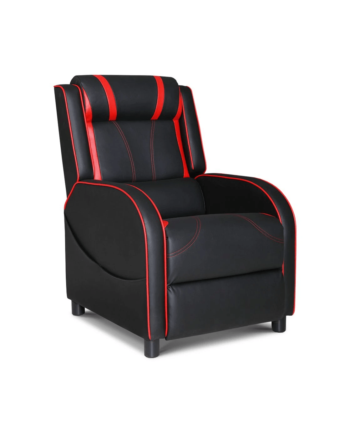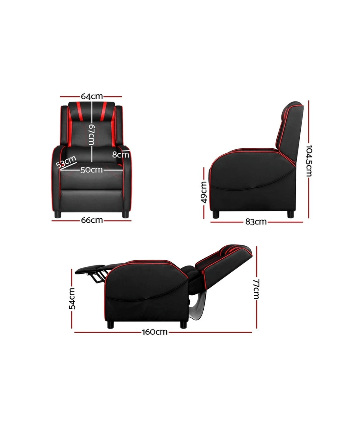 Enjoy gaming in cinema-style comfort with our Artiss Gaming Recliner Chair. Richly padded in high-resilience foam and upholstered in sporty black and red PU leather, the chair certainly looks and feels like it belongs in gold class. In the upright position, the recliner is a comfortable armchair. Or you can easily adjust the backrest and footrest to recline to your preferred angle. The backrest is wide and spacious with cushioned lumbar support and headrest to allow for full head and back support so that no matter the tilt, you have total-body comfort. Being larger and softer than the more common racer-style gaming chairs, the gaming recliner chair is much more suited to longer gaming sessions. And we all know how fast time flies when playing games. So, complete your home gaming arena with our gaming recliner chair for the perfect gaming experience.