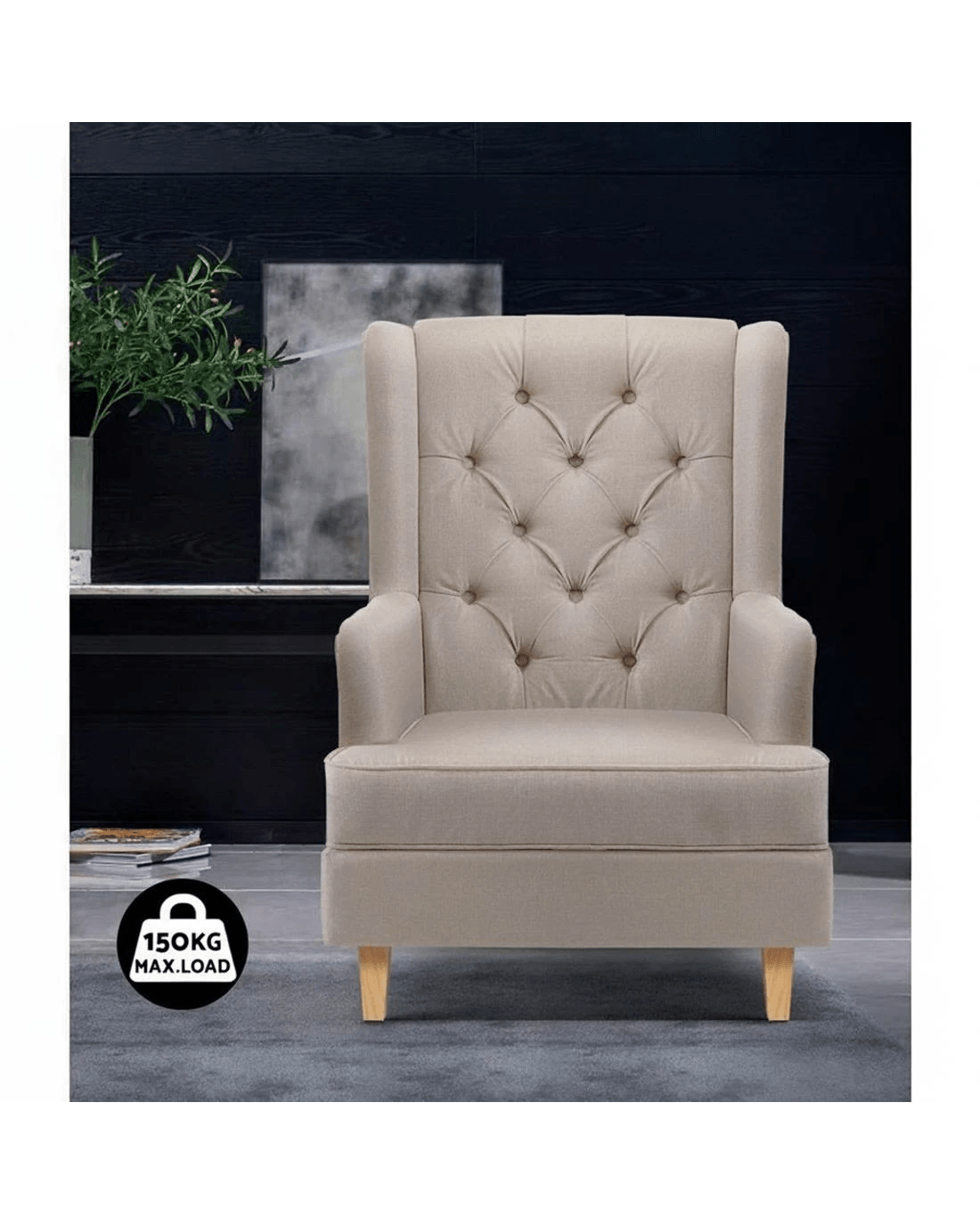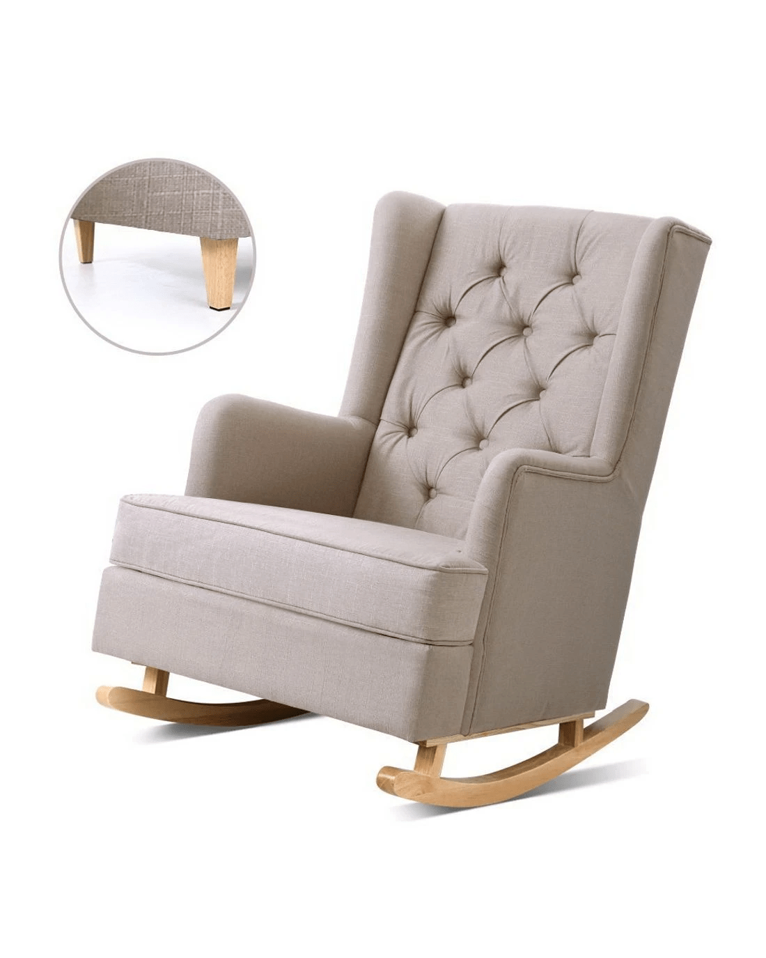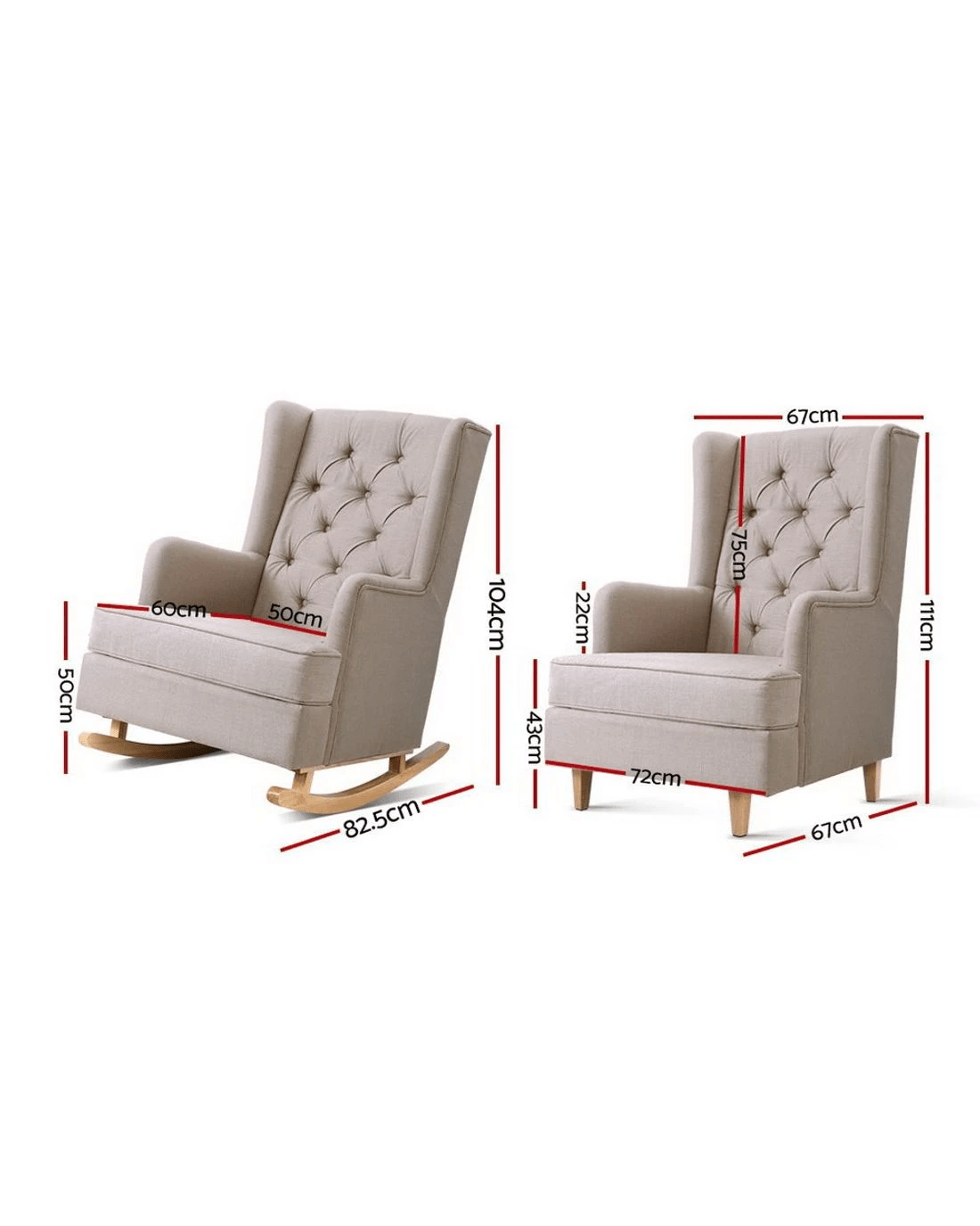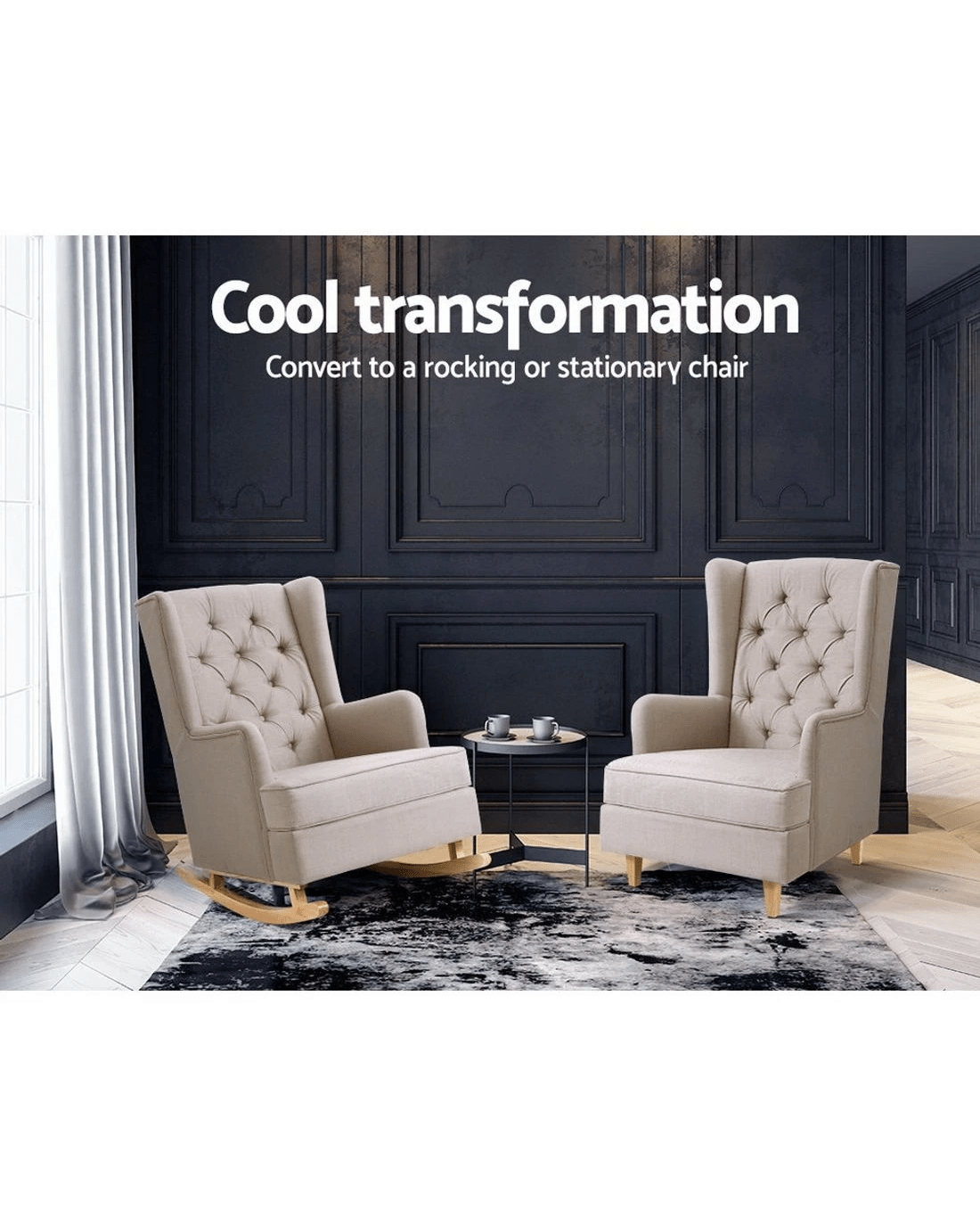 Be swayed. Rock on and relax with our Artiss Gaia Rocking Chair. It comes with two sets of removable legs so that you can use it as a rocking chair or a stationary chair. The gentle swaying of the rocking chair would be perfect for reading, listening to music, taking a much-needed nap, or even rocking your baby to sleep. Or simply swap the legs over and you have a classic accent chair. The iconic design and the tufted wingback exude elegance and timeless appeal. This makes the chair suitable for any décor, from your living room to your nursery. The extra thick foam padding and wide back ensure ultimate comfort with exceptional support. The armchair feet are fitted with pads to keep your floors pristine from scratches and damage. Together with a reinforced wooden frame and quality faux linen fabric upholstery, our armchair is guaranteed to stand up to durable use for many years to come.
