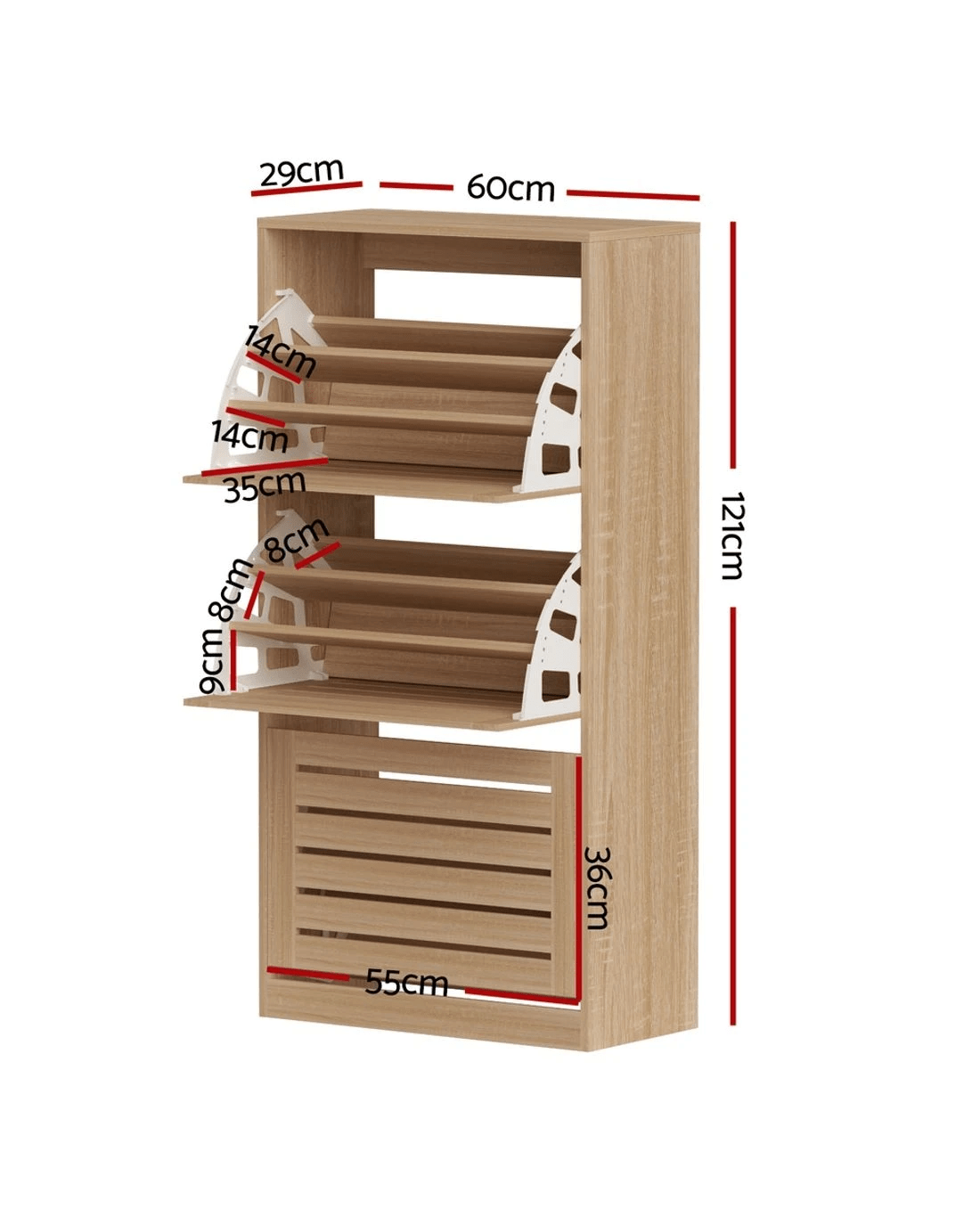 Artiss Shoe cabinet blends rack storage with cabinet convenience, featuring 3 flip-up drawers and 3 adjustable shelves behind slatted ventilation doors. This space-smart entry organiser holds 21-45 pairs (men's/ladies'/kids' sizes) across tiered racks. Built from tough particleboard with 40kg top strength and push-open ease. Comes with wall attachment for safe install - brilliant for hallway shoe storage with 30kg drawer limits.