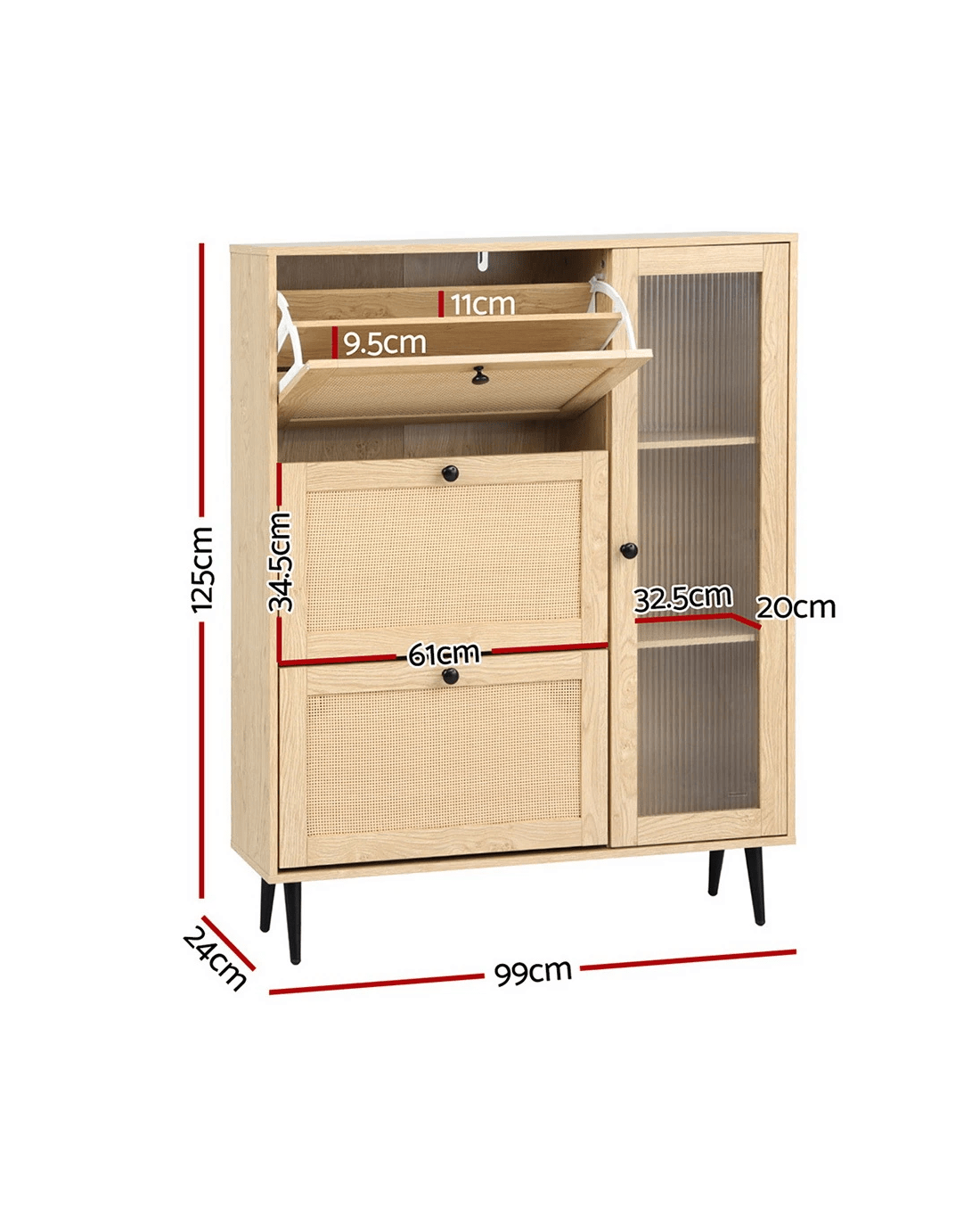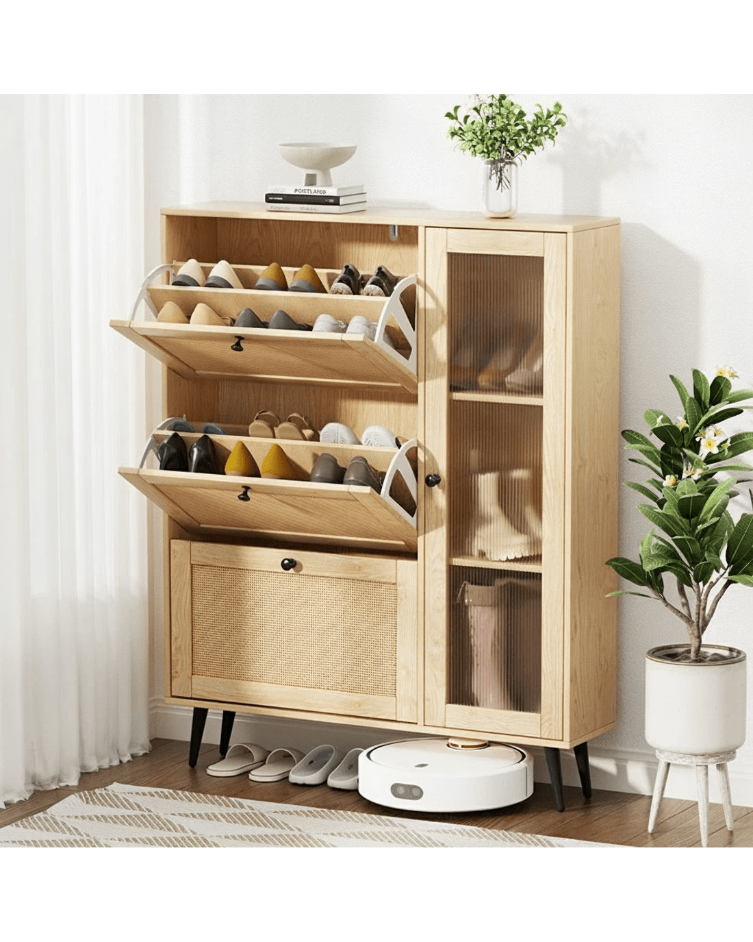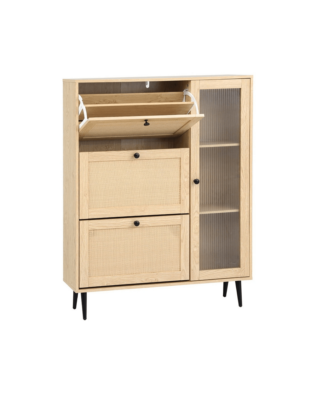 Keep your shoes organised and your space stylish with the Artiss Shoe Rack. Featuring 3 flip-out drawers and 3 shelves with a chic fluted glass door, this shoe rack combines functionality with a modern design. The faux rattan front door adds a touch of texture, while the sturdy particle board with paper veneer ensures durability.