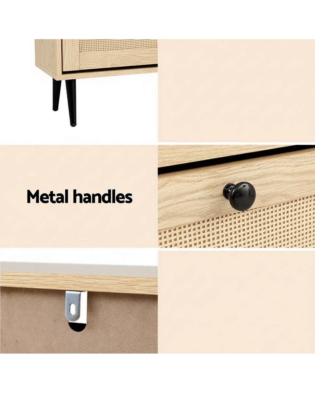 Frame material: Particle board, faux rattan, glass