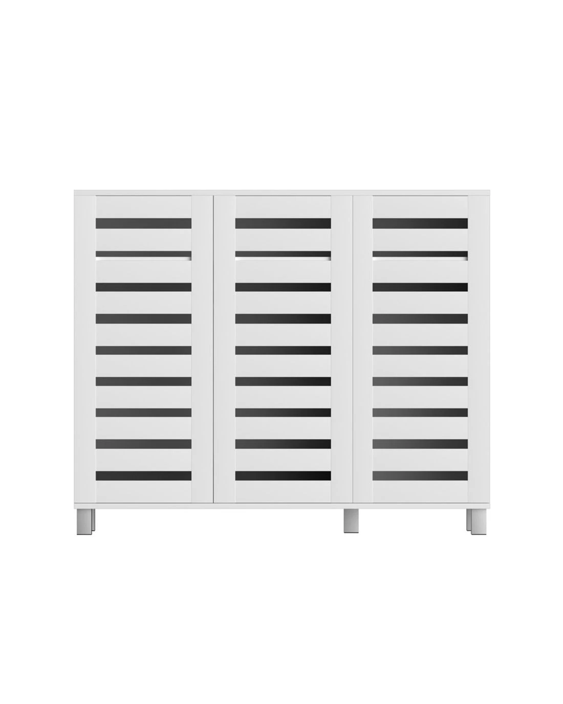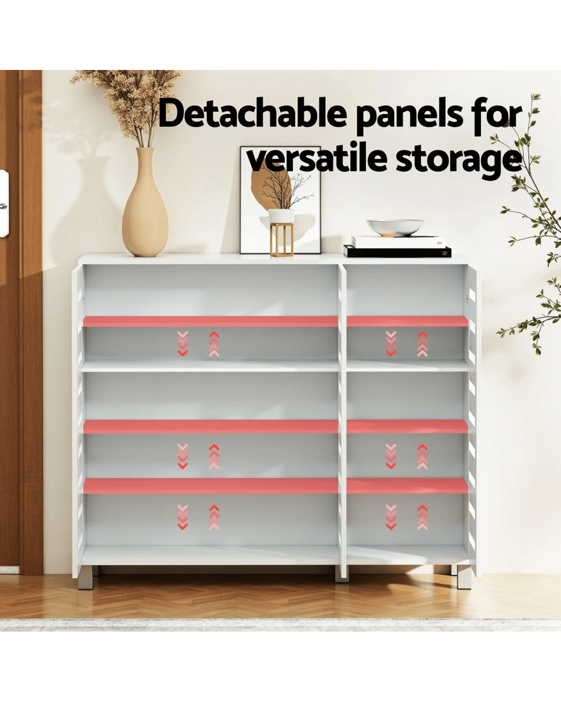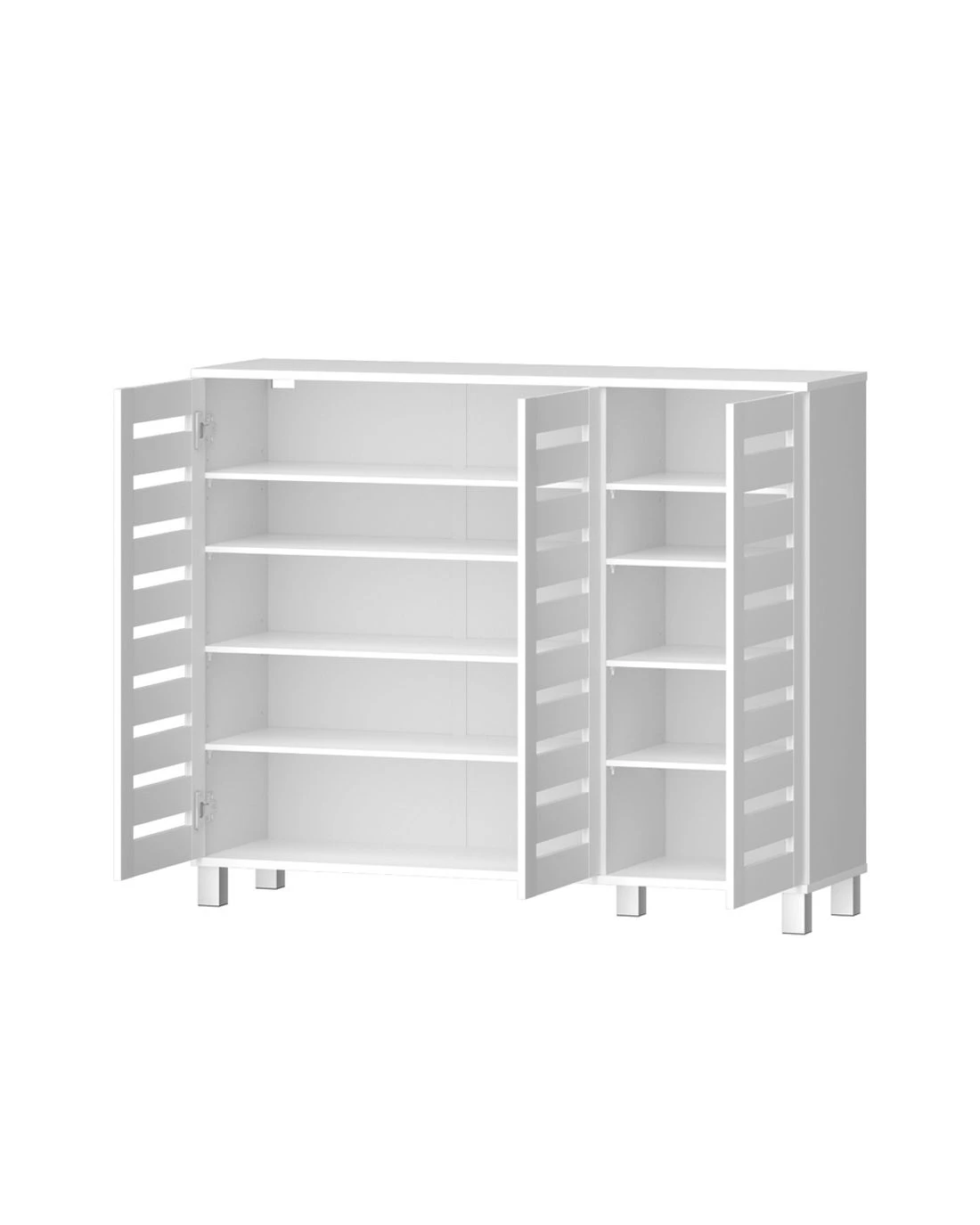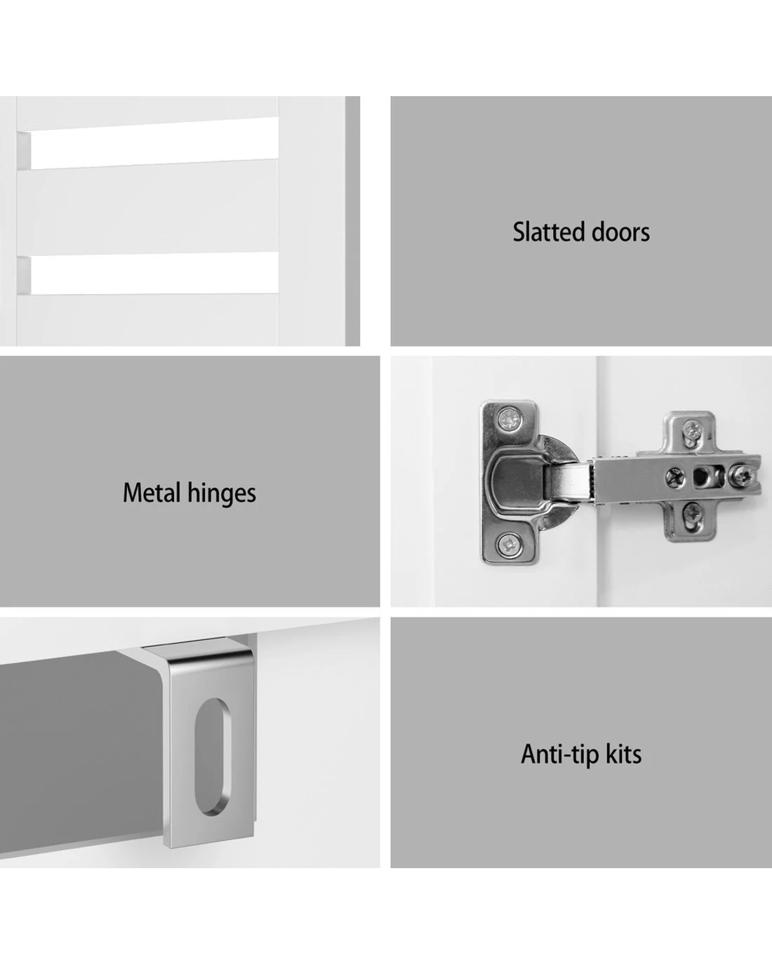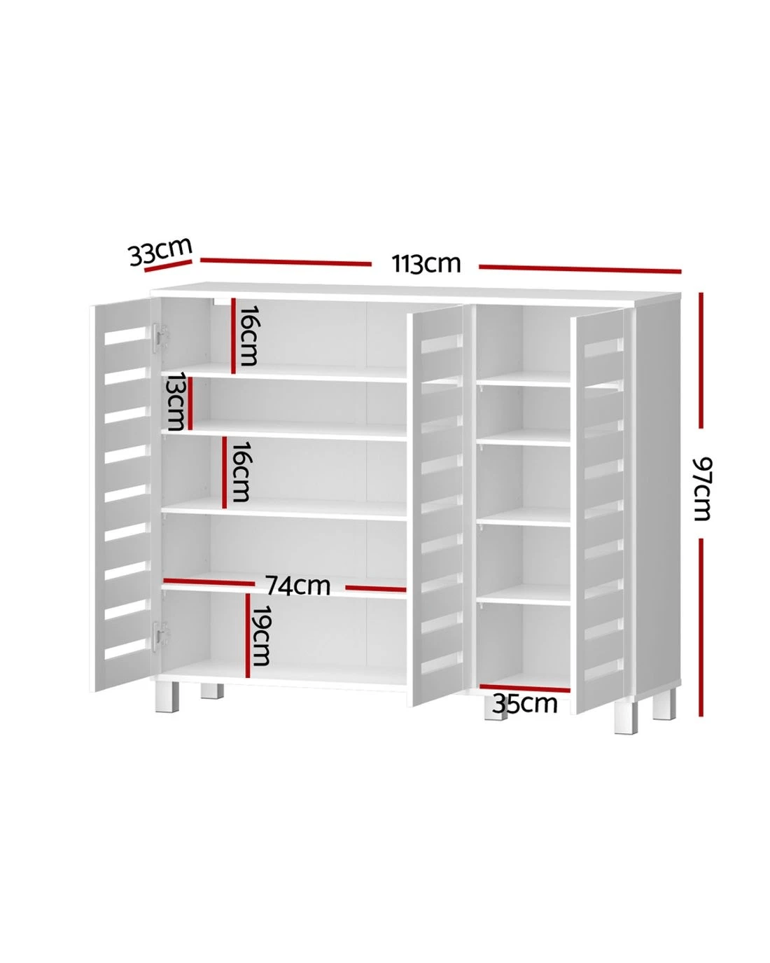 Compact 5-tier shoe cabinet with ventilated slatted doors (114 x 33 x 97 cm) provides practical storage for hallways or laundry spaces. Crafted from engineered wood with a hard-wearing melamine surface, this Artiss organiser features 3 adjustable shelves, push-to-open access, and wall-mount hardware. Strengthened metal hinges support daily use, while slatted airflow design helps reduce enclosed odours. Cabinet-style storage maintains tidy spaces without protruding hardware.