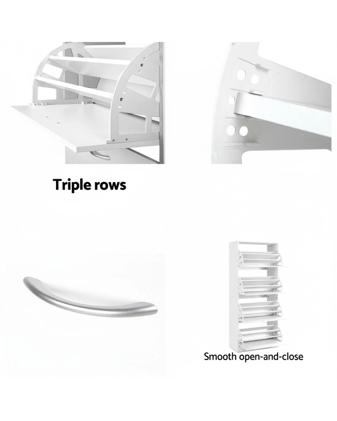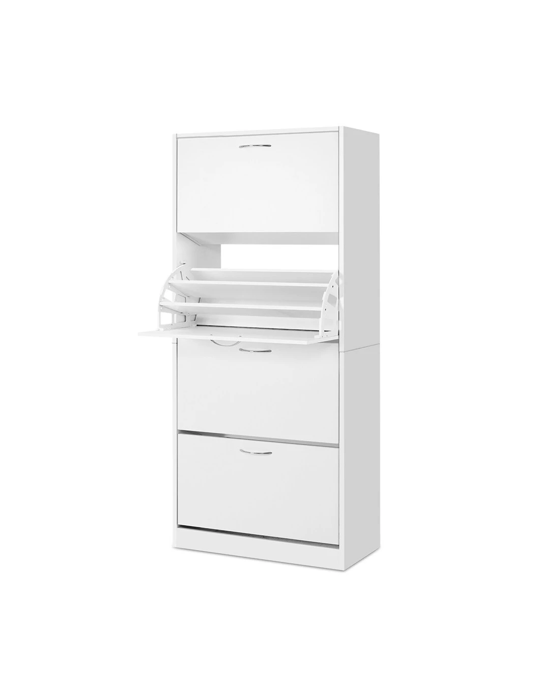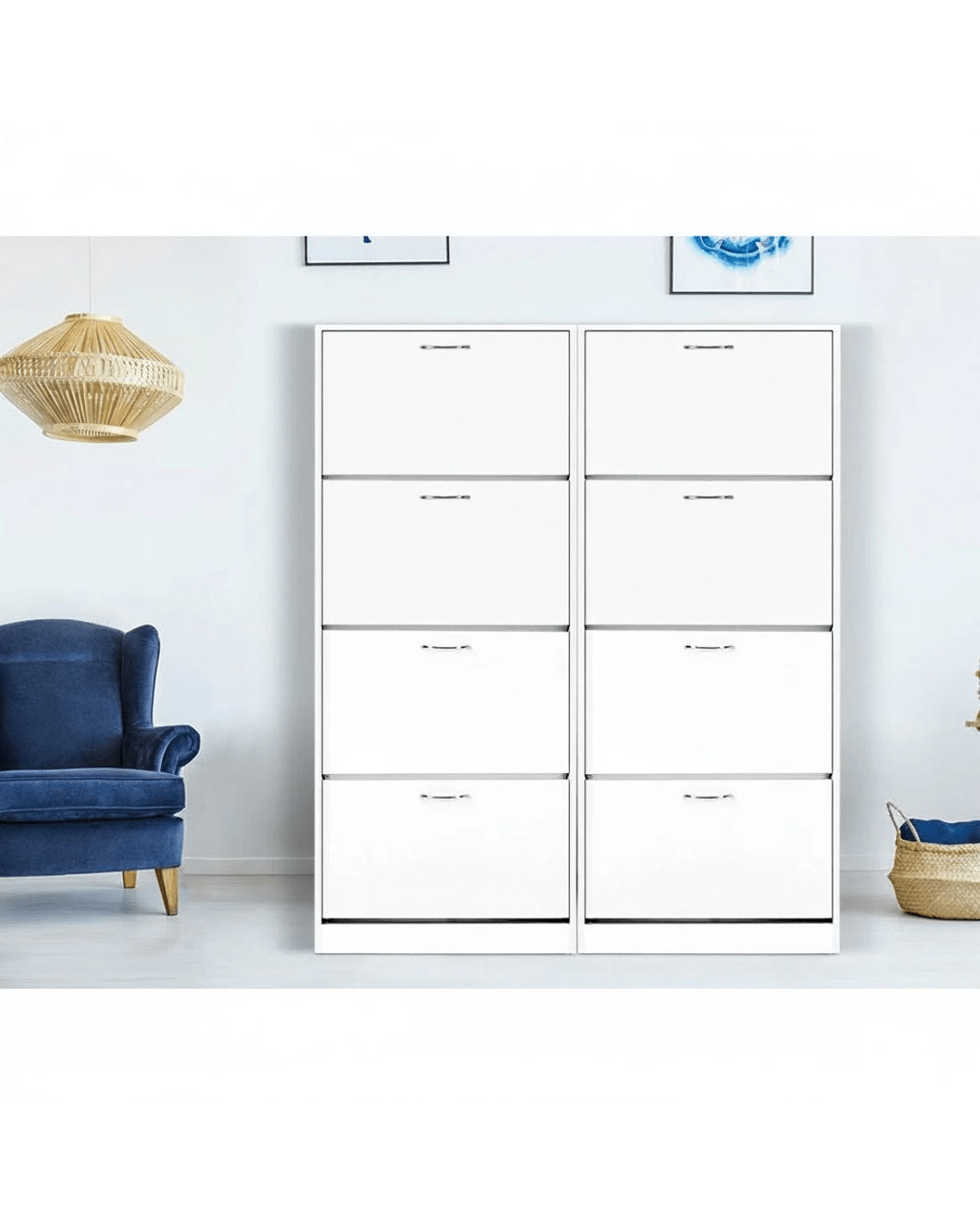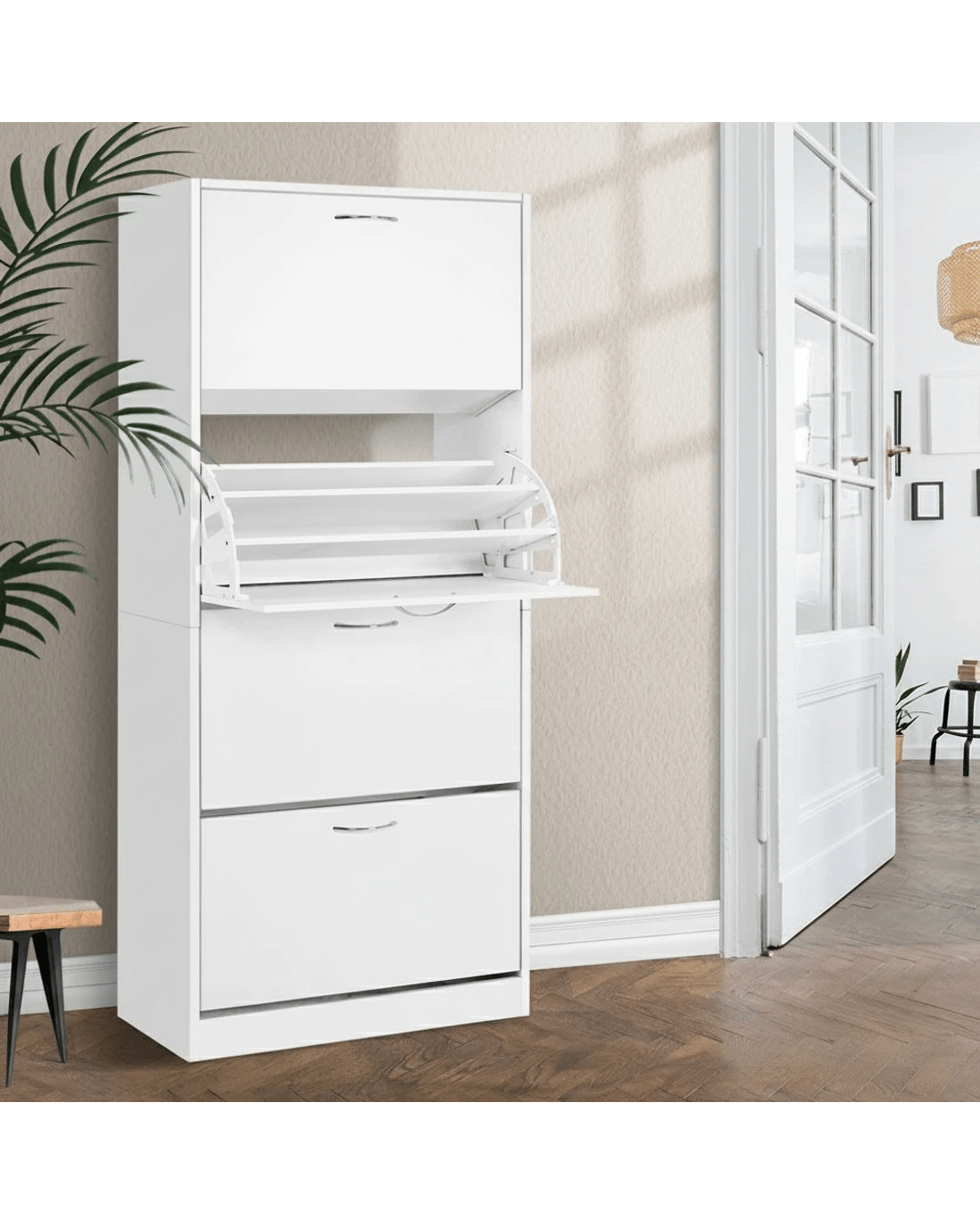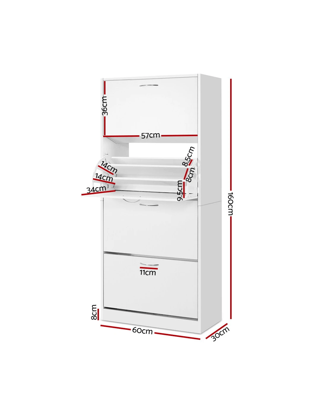 You are shoe proud. That is why you need ample space for all that wonderful footwear. Organise and save your floor space with our contemporary Artiss Shoe Cabinet and have a clutter-free entrance at all times. The four storage compartments are pull-down for easy access and have adjustable shelves so that they can fit different footwear of all shapes and sizes. In fact, up to 60 of your favourite pairs would fit comfortably in it. Made of thick particle board with melamine finish, the shoe cabinet is strong and durable to withstand daily robust use. Not least, the contemporary design with silver powder-coated handles definitely lends a touch of elegance to any home.