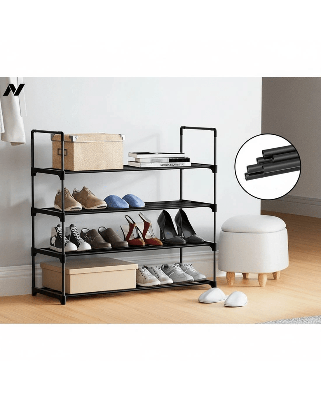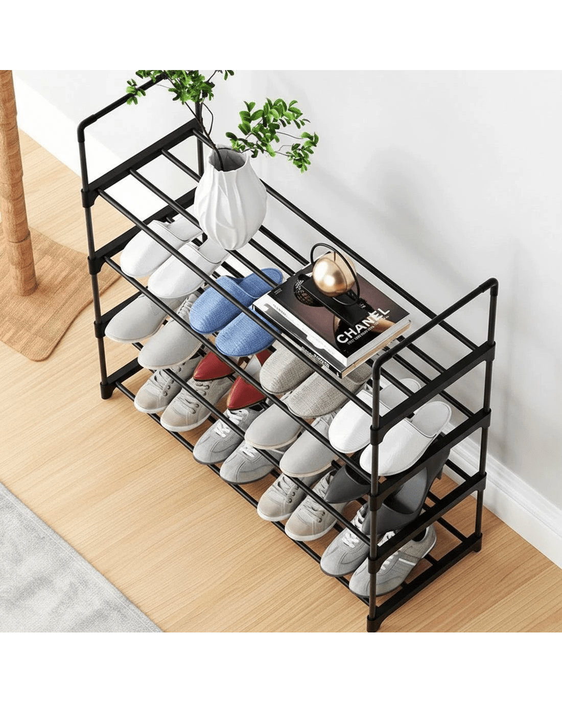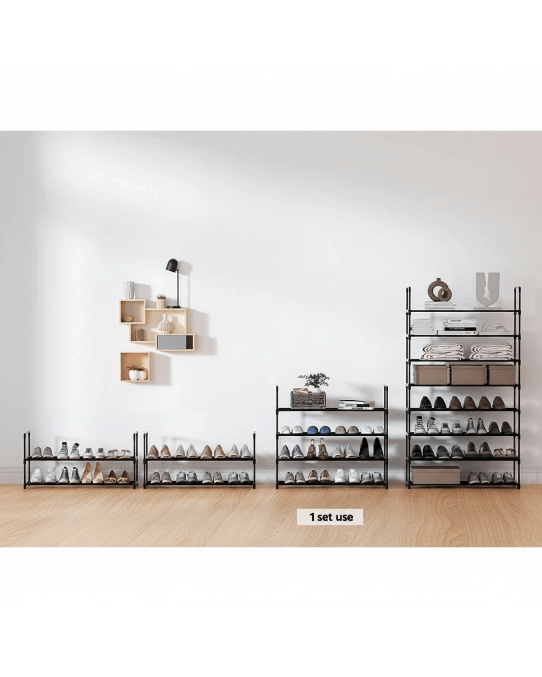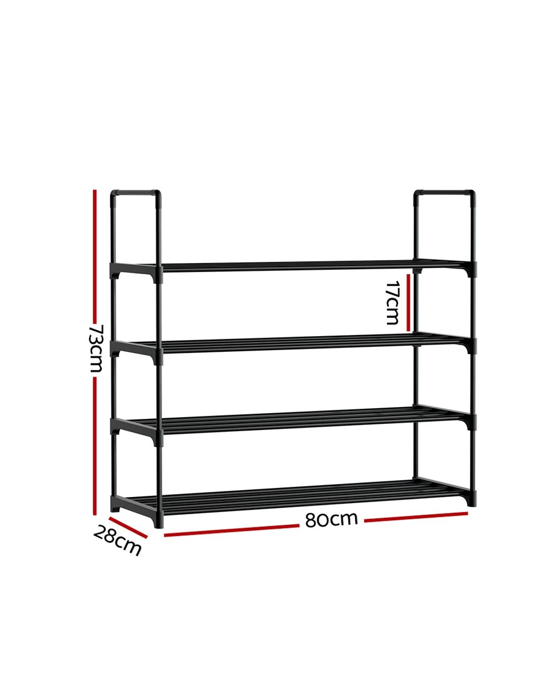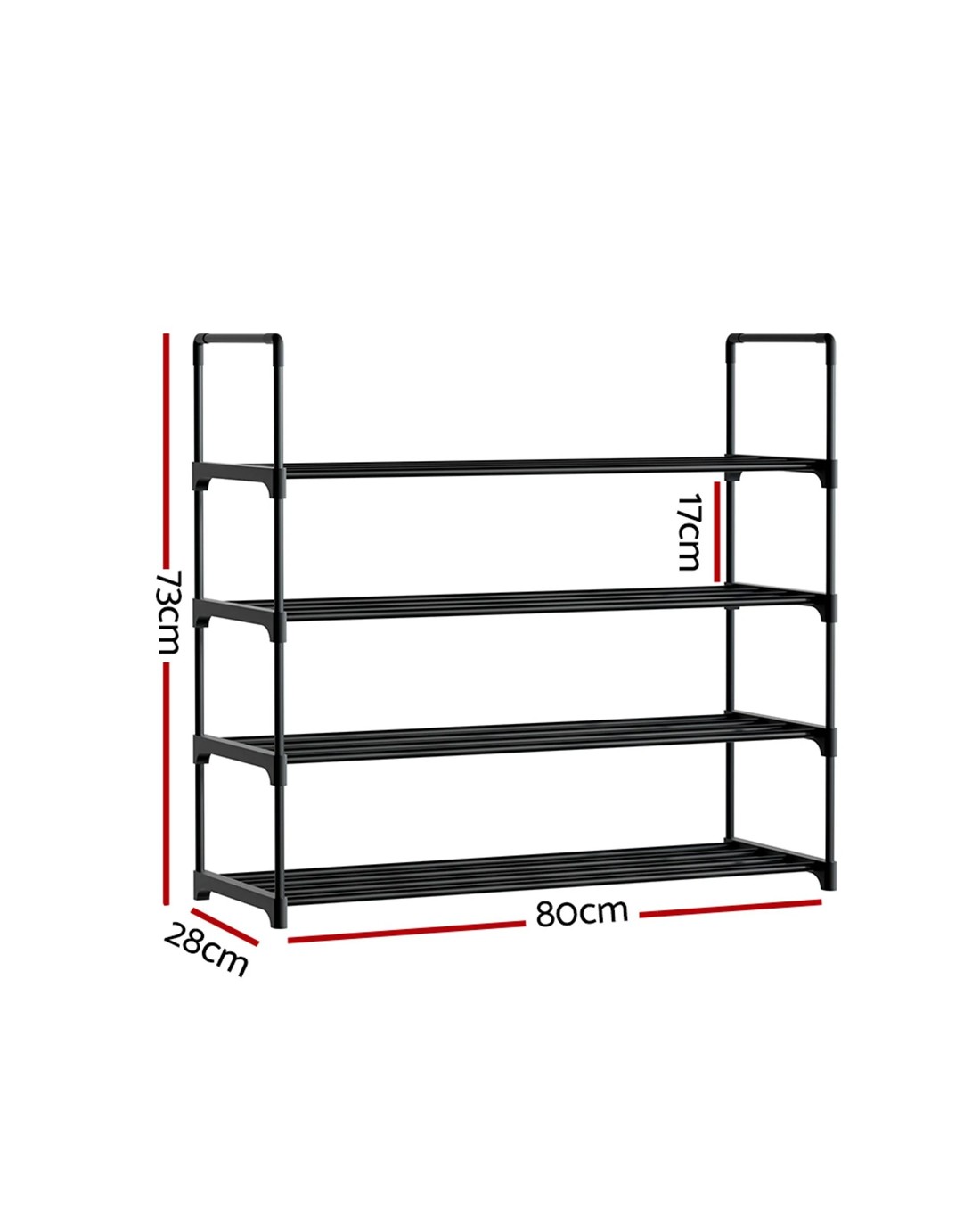 Sneakers, running shoes, flip-flops, boots, high heels, and special-occasion footwear, shoes are never enough! As our shoe collection gets out of hand, your first instinct may be to chuck them on the floor, gradually resulting in a shoe explosion. With our Artiss 80cm DIY shoe rack, you can keep your beloved shoes organised and prevent them from getting scuffed or looking worn. Our four-tier DIY shoe rack features a stackable design that allows you to store your shoes and find them easily. You can use this shoe rack together or separately, considering your shoe size and preferences. Featuring meticulous craftsmanship, our shoe rack boasts a sturdy and durable structure with black powder-coated metal tubes and non-slip foot pads. Each tier has a 10kg weight holding capacity and comes with 17cm each tier height, which makes it suitable for most shoe types. It can fit up to 16 pairs of shoes. Our shoe rack comes in a complete package. Its convenient design makes for hassle-free assembly. Furthermore, you don't require any tools to assemble it. Convenient and versatile, get our Artiss DIY shoe rack today.