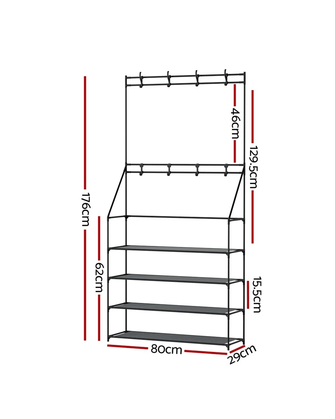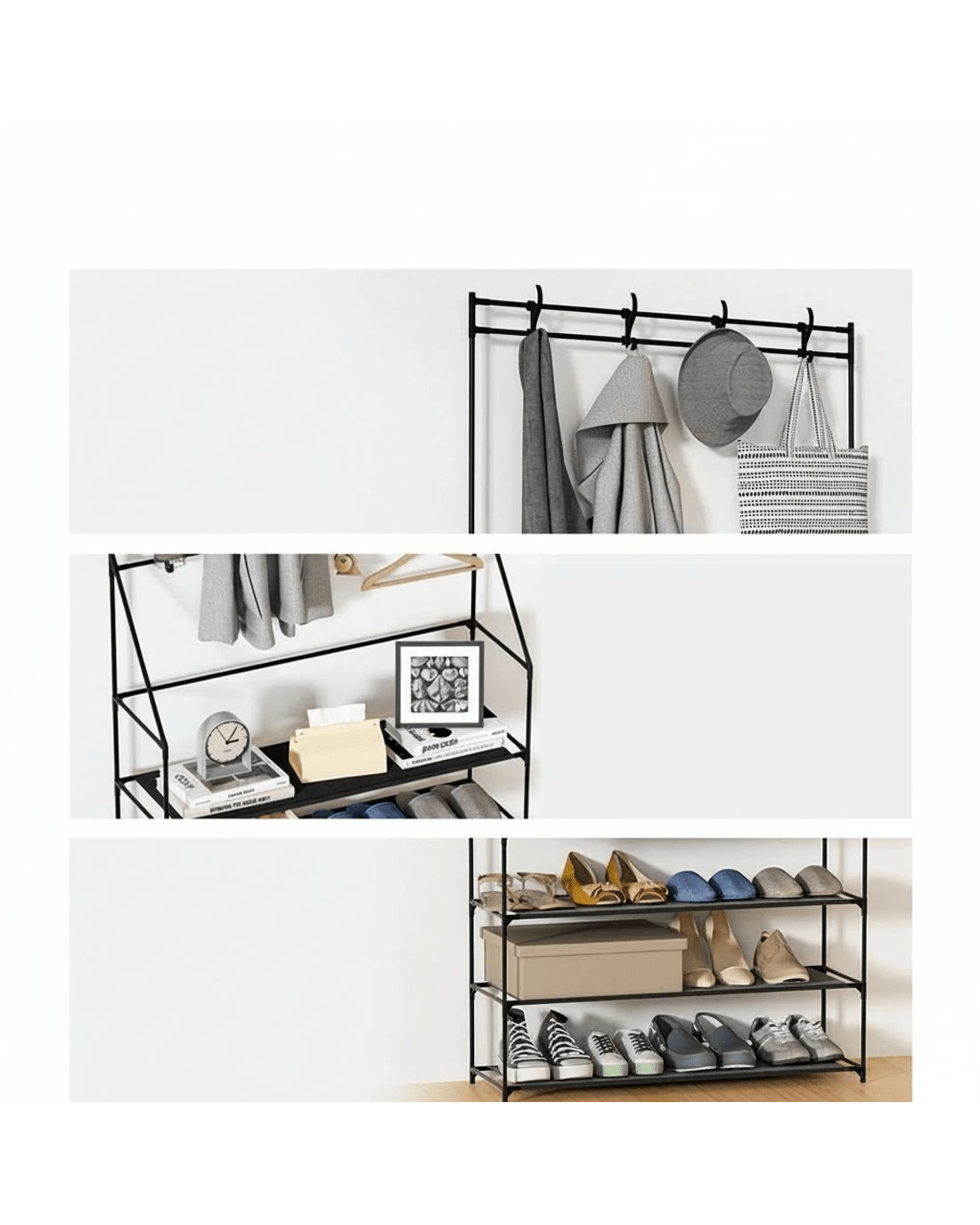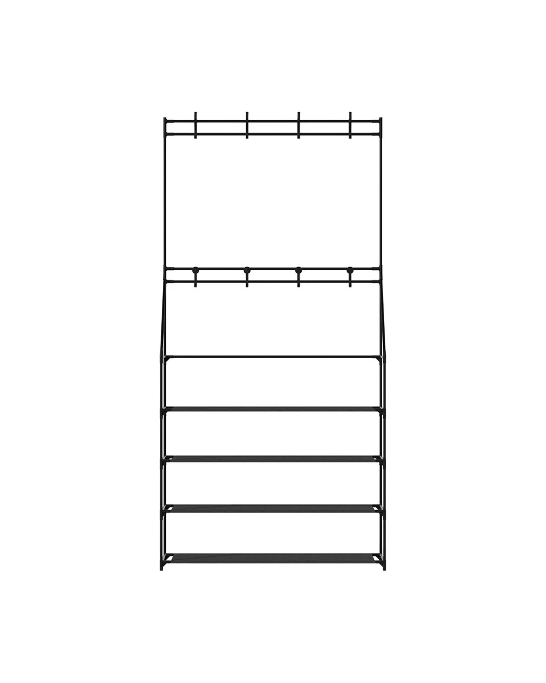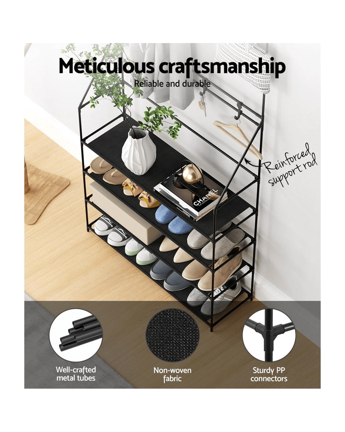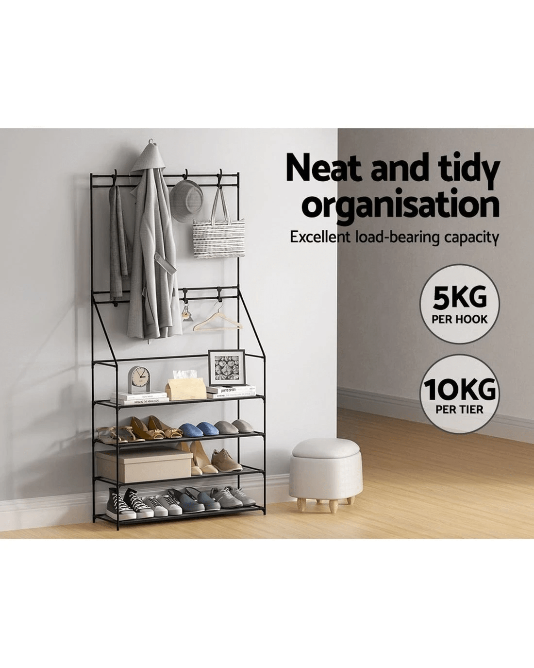 Sneakers, running shoes, flip-flops, boots, high heels, and special-occasion footwear, shoes are never enough! As our shoe collection gets out of hand, your first instinct may be to chuck them on the floor, gradually resulting in a shoe explosion. With our Artiss shoe rack, you can keep your beloved shoes organised and prevent them from getting scuffed or looking worn. It flaunts 3-in-1 design that allows you to hang your coats and jewellery, keep your footwear, and put your beloved purses for display on the non-woven fabric storage rack. Featuring meticulous craftsmanship, our shoe rack boasts a sturdy and durable structure with black powder-coated metal tubes and non-slip foot pads. It has an additional support rod for stability and comes with two sets of wall attachments. Additionally, it's equipped with eight double hooks with 5kg weight holding capacity per hook, and each tier has a 10kg weight holding capacity with 17cm tier height. The shoe storage is suitable for most shoe types and can fit up to 16 pairs of shoes. It comes in a complete package, and the convenient design makes for hassle-free assembly. Furthermore, you don't require any tools to assemble it. Convenient and versatile, get our Artiss 3-in-1 shoe storage rack today.