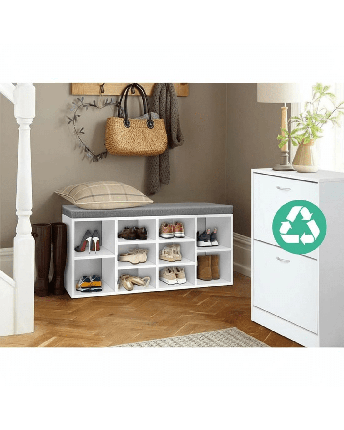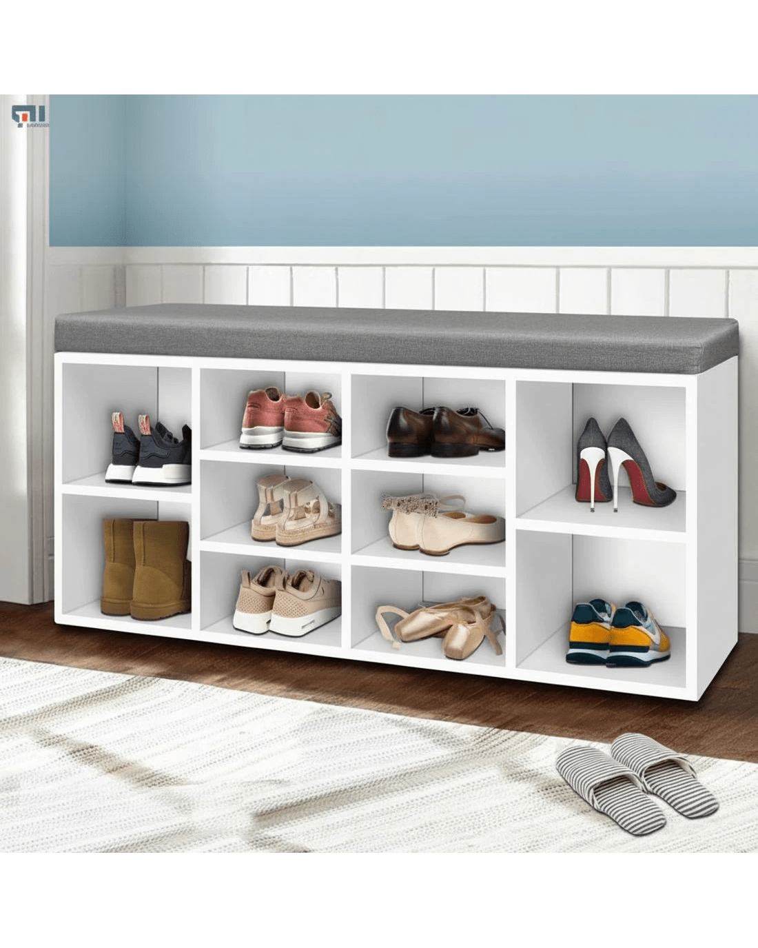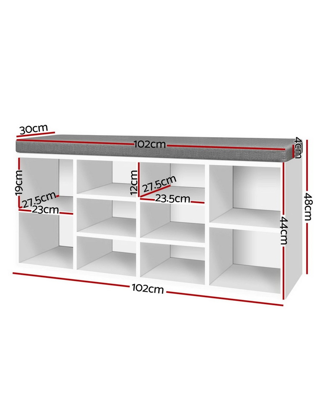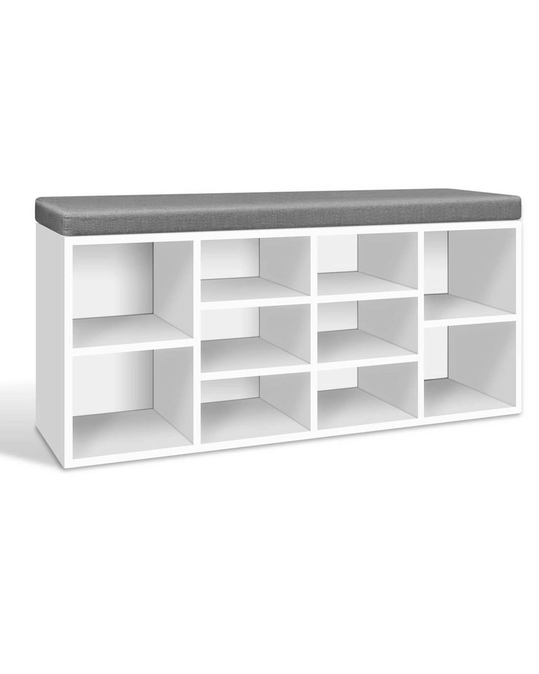 Practical and stylish. Our Shoe Shelf Bench blends two functions into one elegant piece. The shoe shelf features 10 compartments to fit up to 10 pairs of footwear of various shapes and sizes while the fabric bench offers a soft and comfortable rest with its 4cm thick detachable cushioned seat. The entire ensemble is made from particle board for strength and durability. Not least, the two-tone design adds an exquisite touch to this very pragmatic ensemble.
