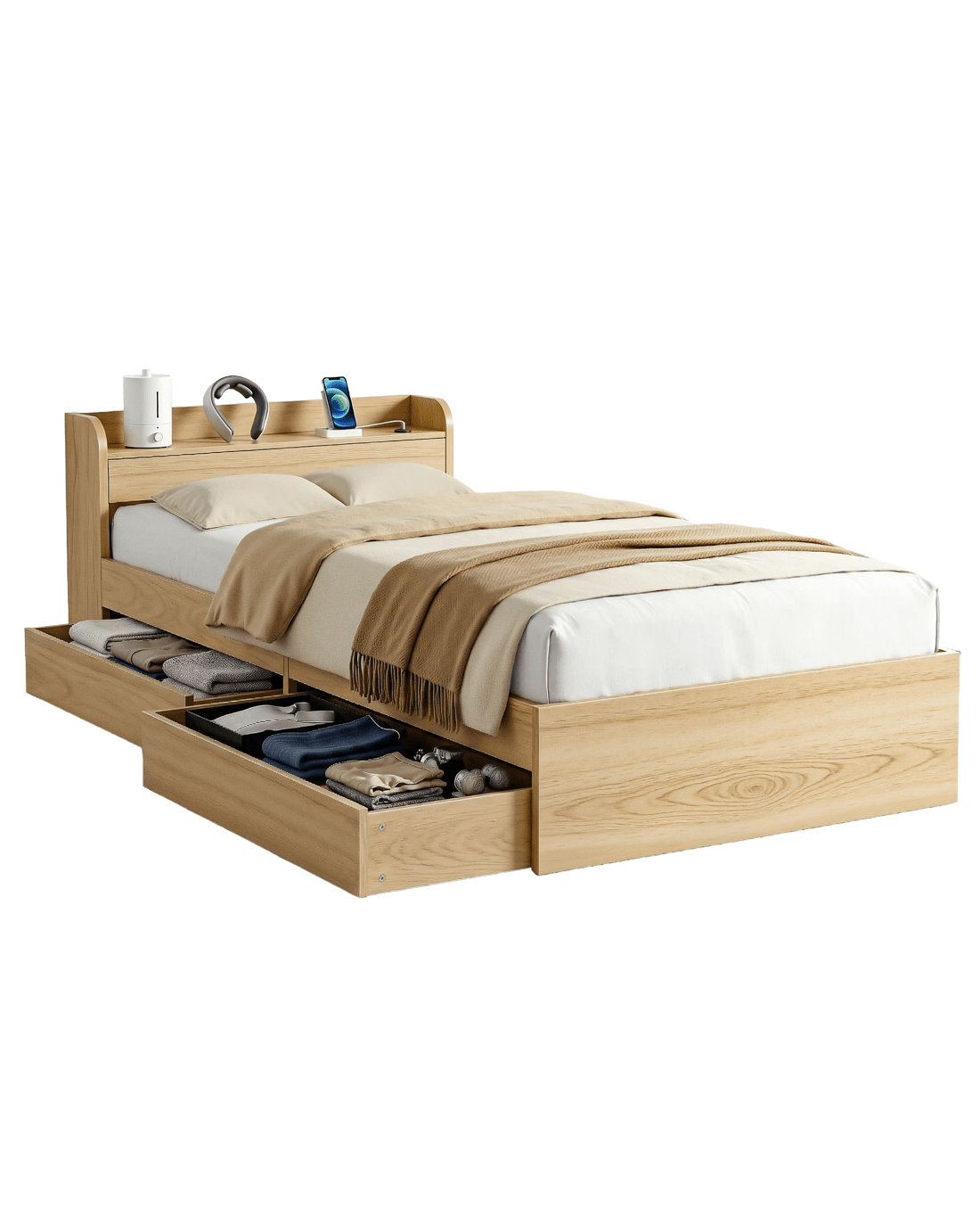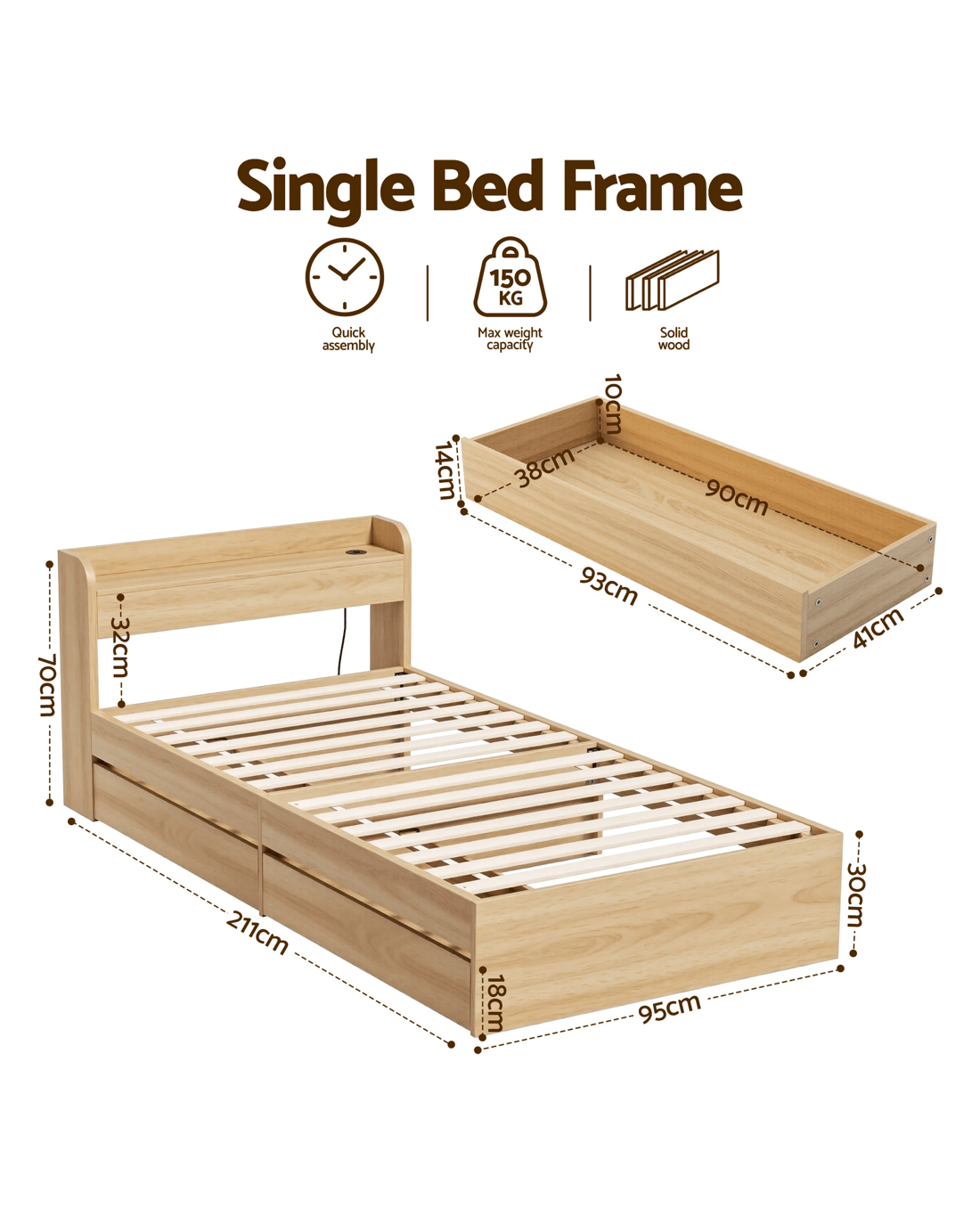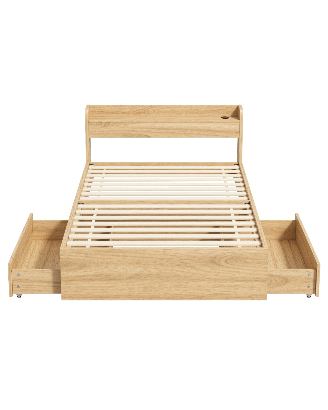 Artiss Single Bed Frame with 2 Storage Drawers Platform Bed Base with USB Ports Sturdy en Slat Support Natural - Black