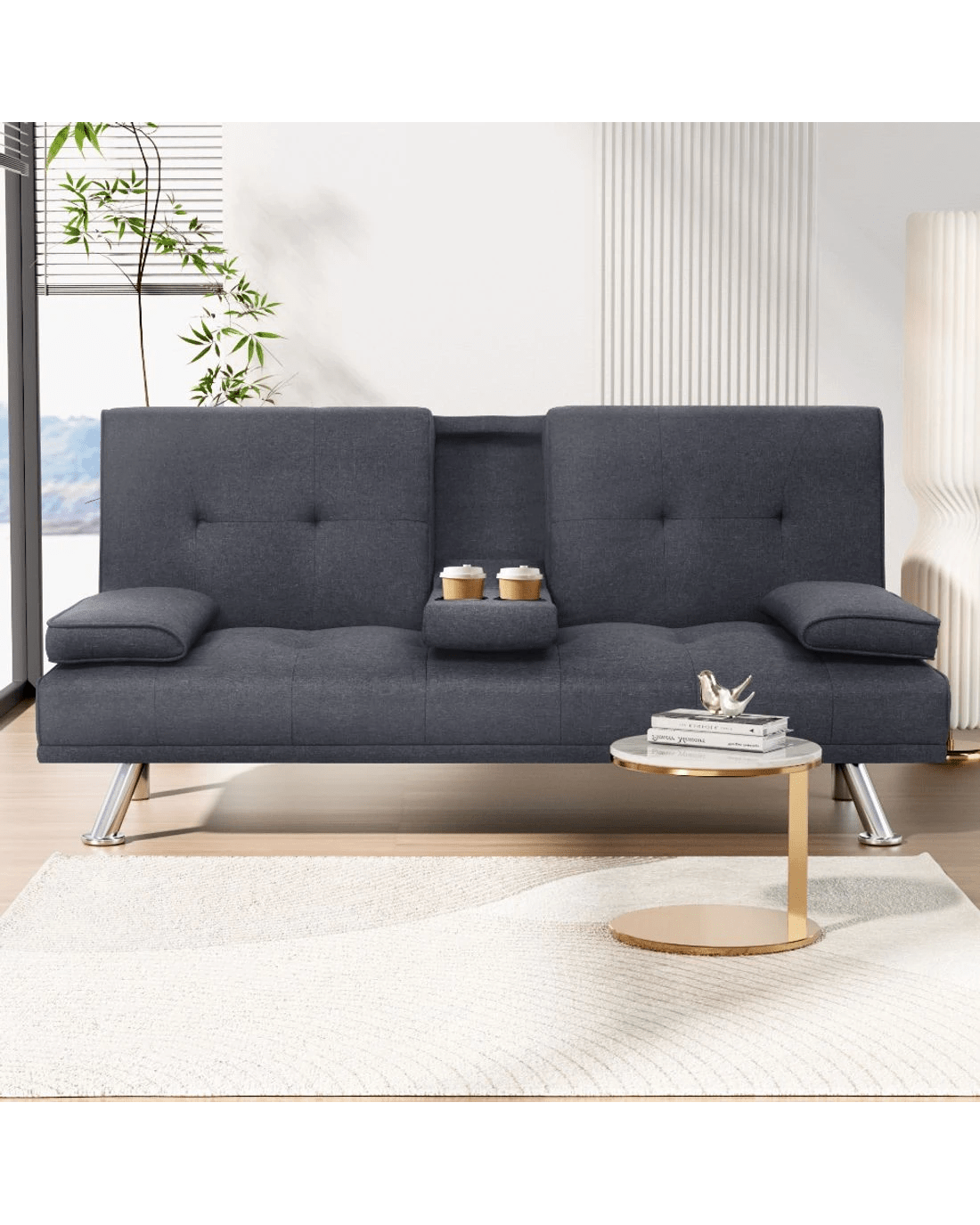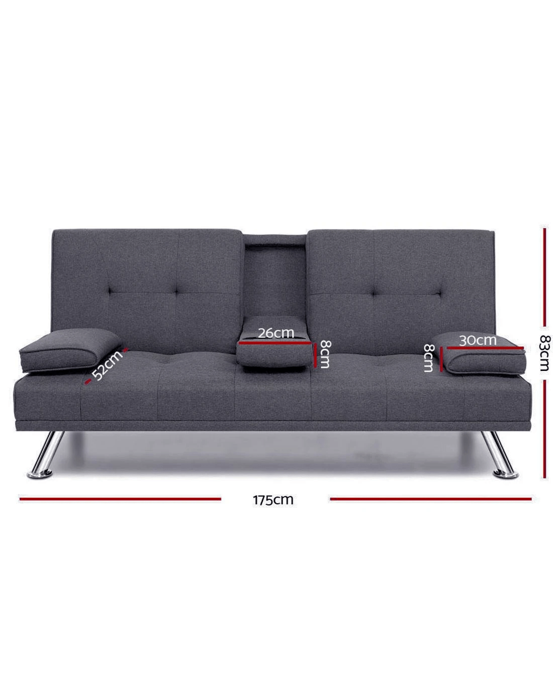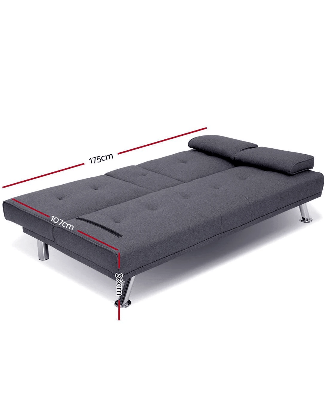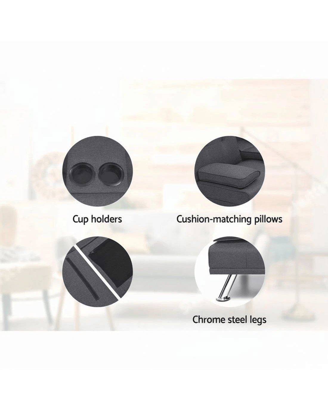 Snuggle up with our Artiss 3-Seater Sofa Bed that functions both as a gold class cinema lounge and as a spare bed for unexpected overnight guests when needed. Constructed with a wooden frame and filled with extra thick foam, our breathable faux linen upholstered sofa bed is sturdy in every way. And the chrome steel legs also add a very modern touch to the entire ensemble. It only takes a few minutes to transform from sofa to bed and three adjustable reclining positions let you enjoy your leisure at your preferred settings. The cushioned armrests are attached to the sofa bed using Velcro and can be moved to be used as pillows. The middle panel folds down to reveal two hidden cup holders so that you always have your drink handy and can enjoy the cinema experience right in your living room. Built to generous proportions, our 3-seater sofa bed can support up to 200kg in weight. Front row seats by day or lovely bed by night. You can have it all with just one sofa.