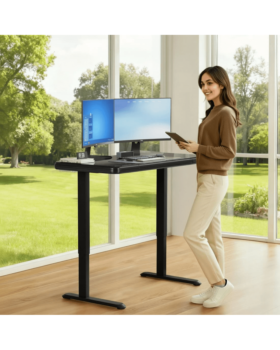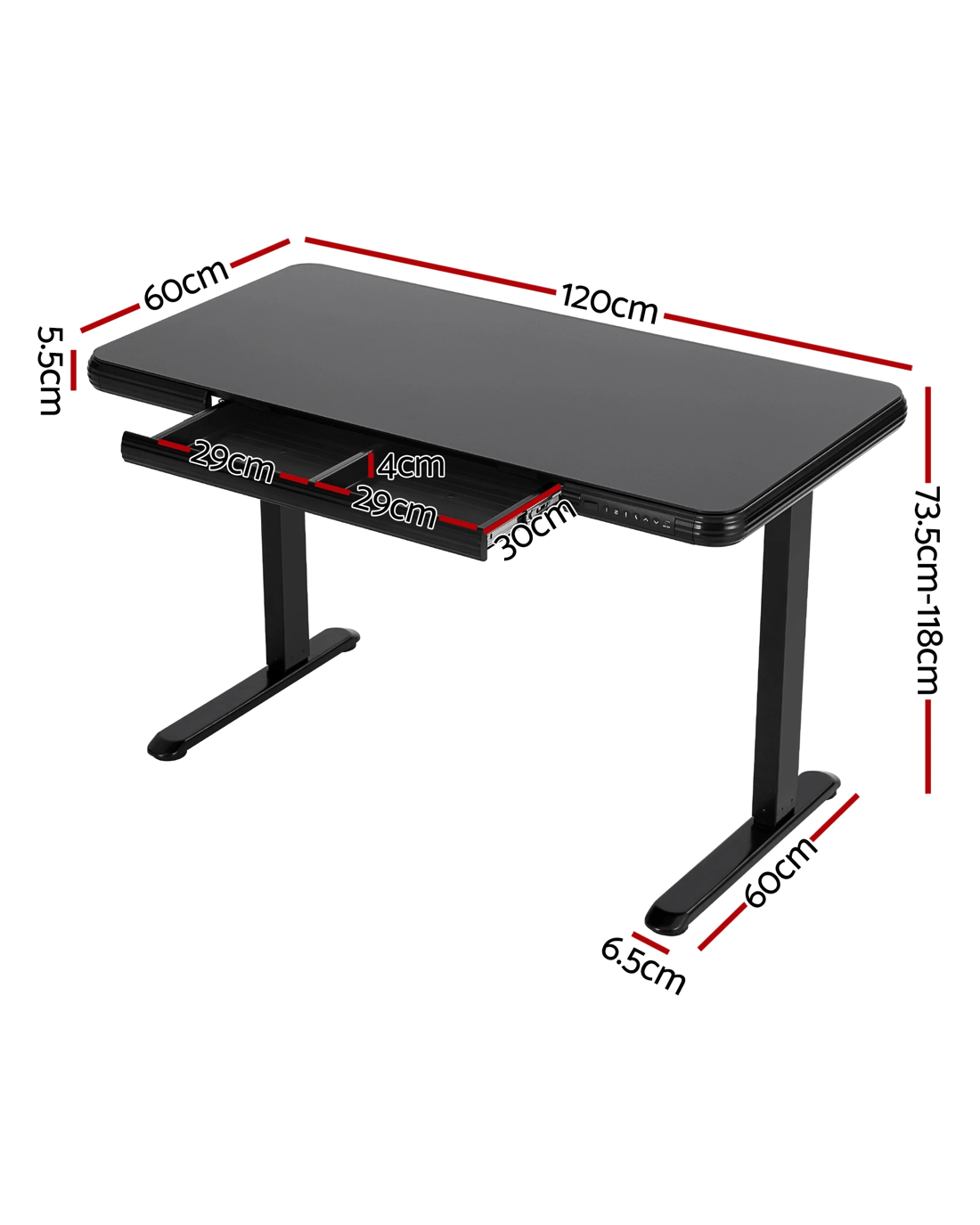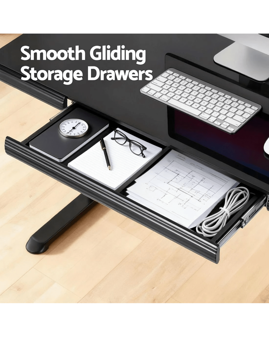 Upgrade your workspace with our premium electric standing desk, designed for modern Australian homes and offices. With effortless height adjustment at the touch of a button, this desk allows you to smoothly transition between sitting and standing, helping you work more comfortably and maintain better posture throughout the day. The memory presets let you instantly recall your preferred heights, making it perfect for shared or multi-user environments. Crafted with a sleek tempered glass top, it not only adds a contemporary touch but also offers ample space for your computer, accessories, and other essentials. The built-in drawer keeps stationery organised, while integrated charging ports help you power devices conveniently. Supported by a sturdy T-shaped base, the desk remains stable and secure even at its highest setting. Ideal for study rooms, offices or remote work, this standing desk combines functionality, elegance and ergonomic support—so you can work smarter and feel great.