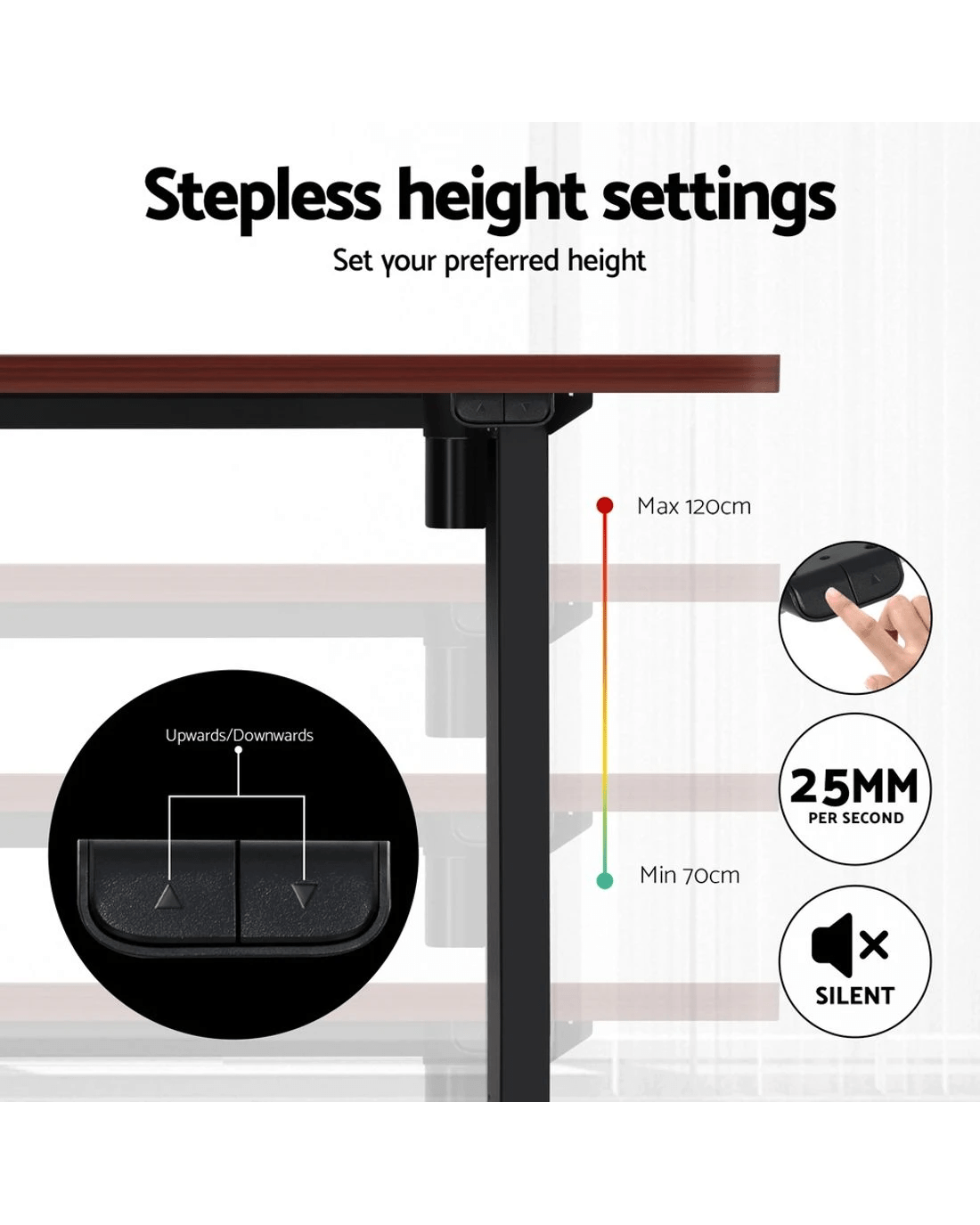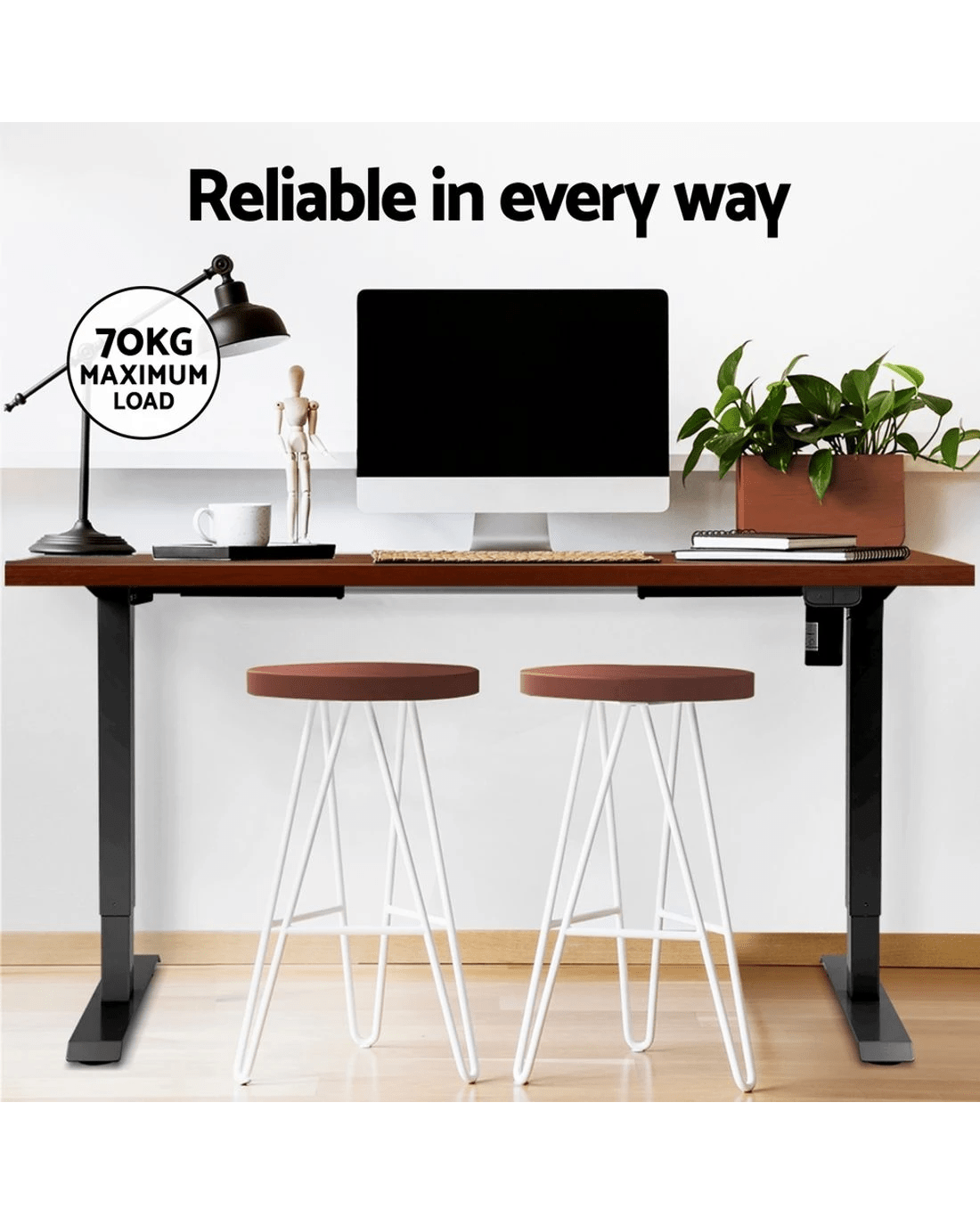 Poor posture and sedentary lifestyles contribute to several health issues. Now keep your health in good shape with the Artiss Motorised Adjustable Desk Frame! Designed to go with our Artiss Desktop, it won't disappoint you either with its quality or aesthetics. With our innovative height-adjustable desk frame, you can stand while working and stretch and engage your muscles to prevent them from weakening. Our desk frame features an easy-to-use digital control panel that enables you to easily adjust the desk to a suitable height and ensure your comfort while working. The smooth motors allow for ultra-quiet operation with low energy consumption. Our high-quality powder-coated desk frame makes cleaning and maintenance easy and ensures ultimate sturdiness. It also comes with adjustable rubber foot pads that offer extra stability and keep your floors safe. As for the desktop, it comes with pre-drilled holes for easy installation. It is made from eco-friendly particleboard and comes with a natural wood grain or contemporary matte finish to create a smooth surface and a beautiful aesthetic. The desktop is scratch resistant and perfect for all your working needs. Get yourself Artiss Motorised Adjustable Desk Frame and Desktop to prevent fatigue and improve productivity.