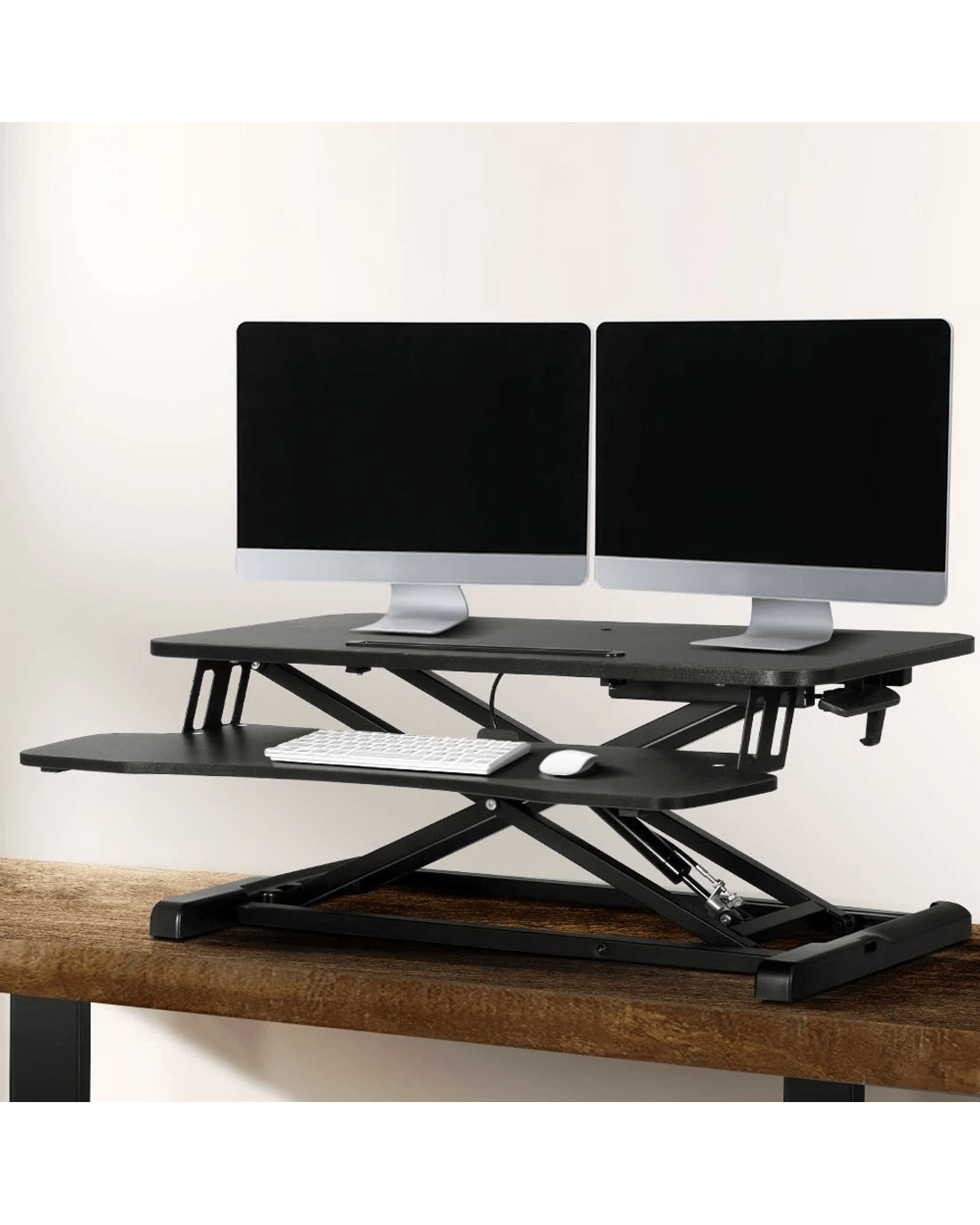 Having an efficient working space is a key to improving productivity and the ability to focus. If you're looking to improve your workspace, bring home our Artiss adjustable desk riser. It makes an ideal purchase for any home office set up or even study room. Our desk riser is the epitome of utmost simplicity combined with maximum functionality. It's meticulously crafted with a sturdy MDF board and solid metal frame to ensure long-lasting and robust use. It features a 2-tier design with a wide surface that provides ample space to work on, and the double X-shaped base design with anti-skid pads keeps the desk riser stable. The removable arc design keyboard tray allows convenient typing without an abdomen touch, and the stepless height settings enable you to set it to your preferred height. Our desk riser also has a counter-balance gas lifting mechanism that enables smooth and quick transitions. It comes with a tablet/phone slot, matt finish tabletop, and smooth rounded edges for your convenience and ease of use. A piece designed with total efficiency and practicality in mind, you are sure to fall in love with our Artiss adjustable desk riser.