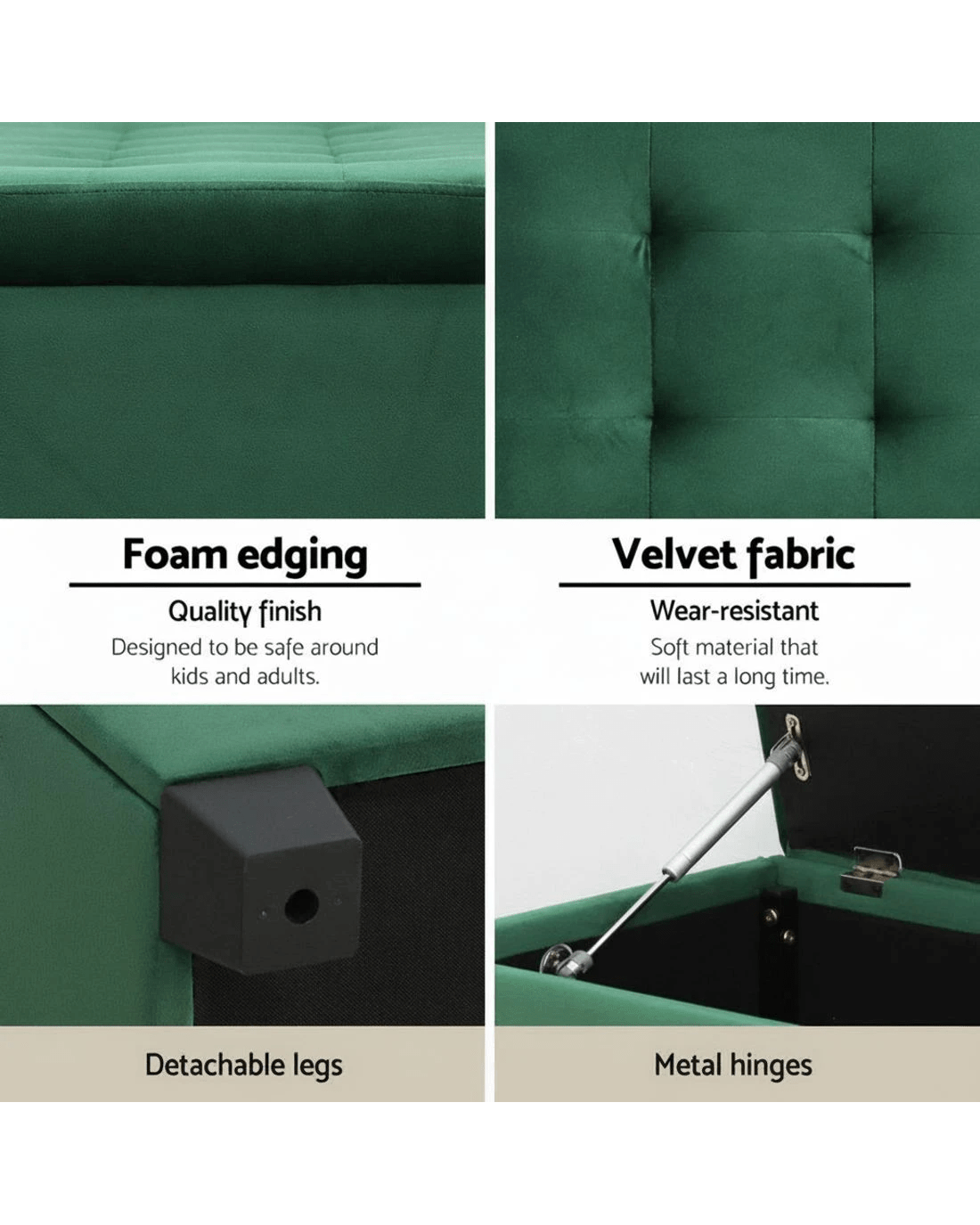Looking for a storage solution with more taste? Look no further than our Artiss Storage Ottoman. With an elegant tufted seat and upholstered in skin-soft velvet, our ottoman is simply luxurious to rest on and adds a plush touch to any home. But more than that, it also provides a neat storage space for your home essentials. Blankets, throws, pillows, magazines and even toys can be stowed away in a discreet, easy-to-access manner. Made of quality material, the ottoman is strong and sturdy and stands up to durable use. The lift-up top enables easy access while its robust hinges ensure that it will stay open and not falter easily. Not least, the ottoman has detachable legs that enable it to be more versatile in use. So whether you are using the ottoman as extra lounge seating, bedroom décor or your favourite footrest, our multifunctional and versatile ottoman matches form with function perfectly and elegantly.