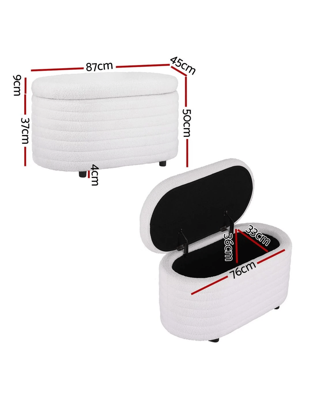Storage space dimensions: 76cm x 33cm x 36cm