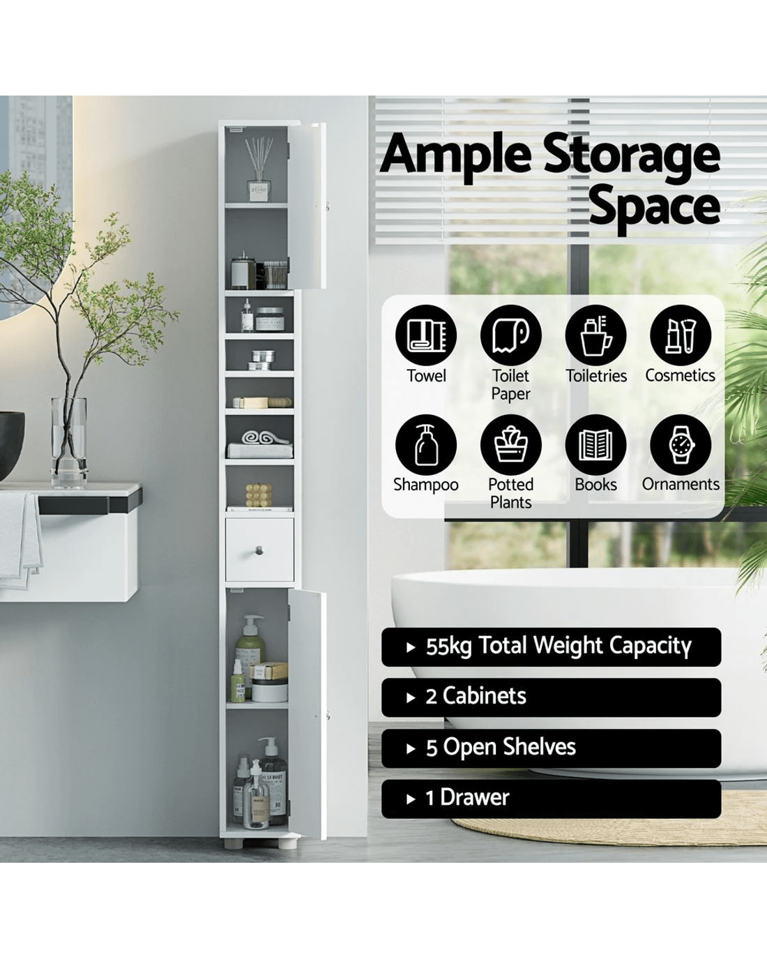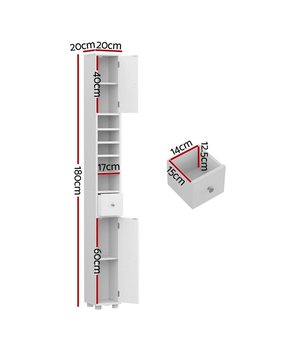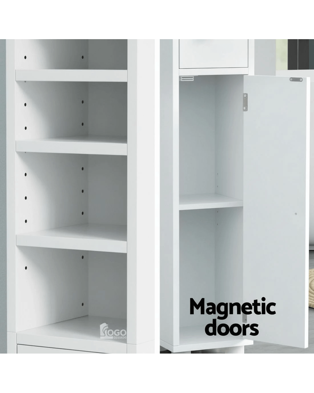 Artiss Tall Bathroom Storage Cabinet 180cm Slim Linen Tower Adjustable Shelves Durable Space Saving Organizer - white