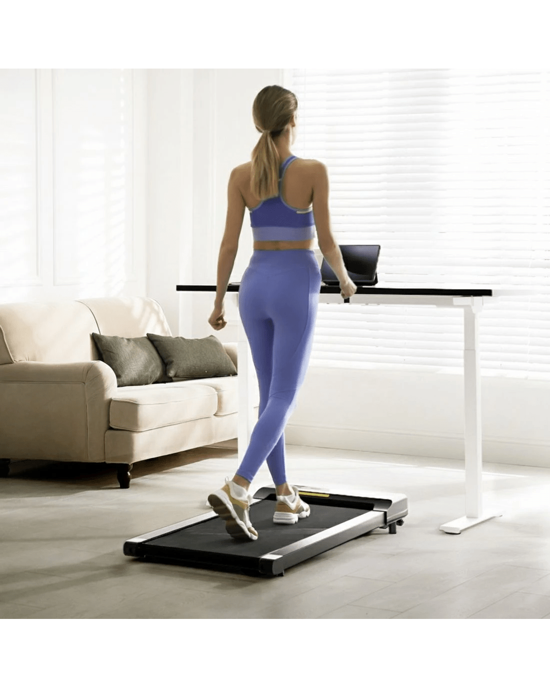 The electric standing desk with integrated treadmill and walking pad offers a versatile workspace solution, allowing users to alternate between standing, walking, or sitting, promoting productivity and health.