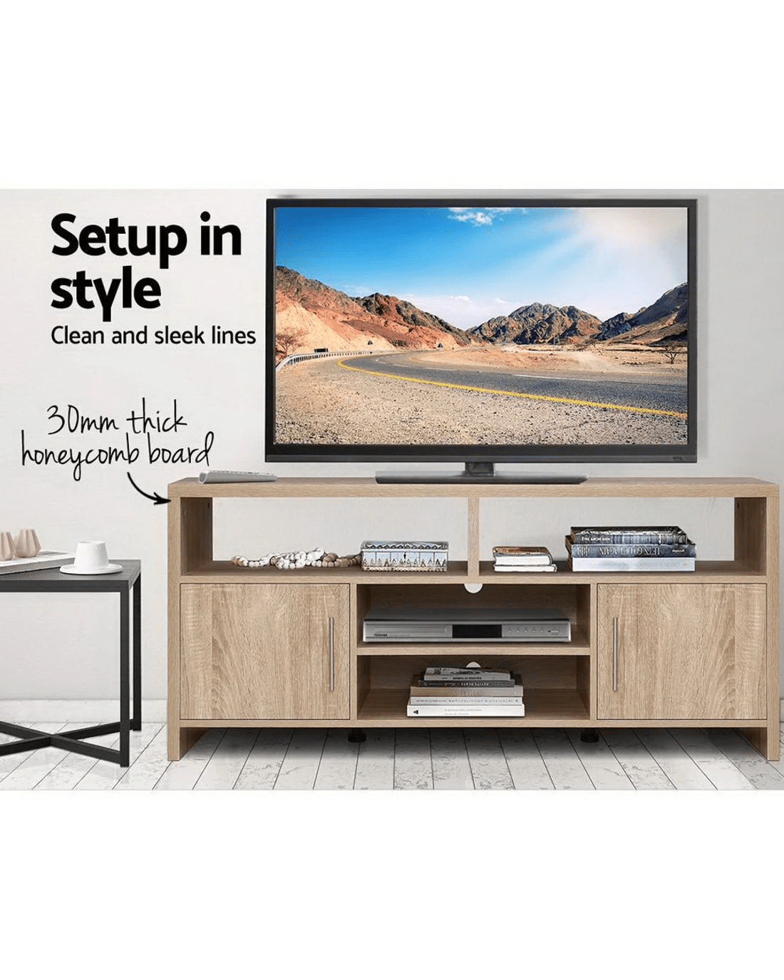 Your treasured home entertainment system deserves the best cabinet for it. And that is why our Artiss Entertainment Unit is the ideal choice for you. Incorporating a contemporary design and presented with durable and strong 30mm thick honeycomb board and 15mm thick particle board, our entertainment unit displays great craftsmanship with equally fine hardware to ensure trouble-free use every time. The melamine finish is flawless and smooth to the touch, making the unit easy to clean and maintain. And it offers ample storage space with four open shelves and two deep cabinets with magnetic door catches for all your entertainment essentials. Better still, the ensemble features aluminium handles for a sleek appearance and pre-drilled holes to keep all your cables tidy.