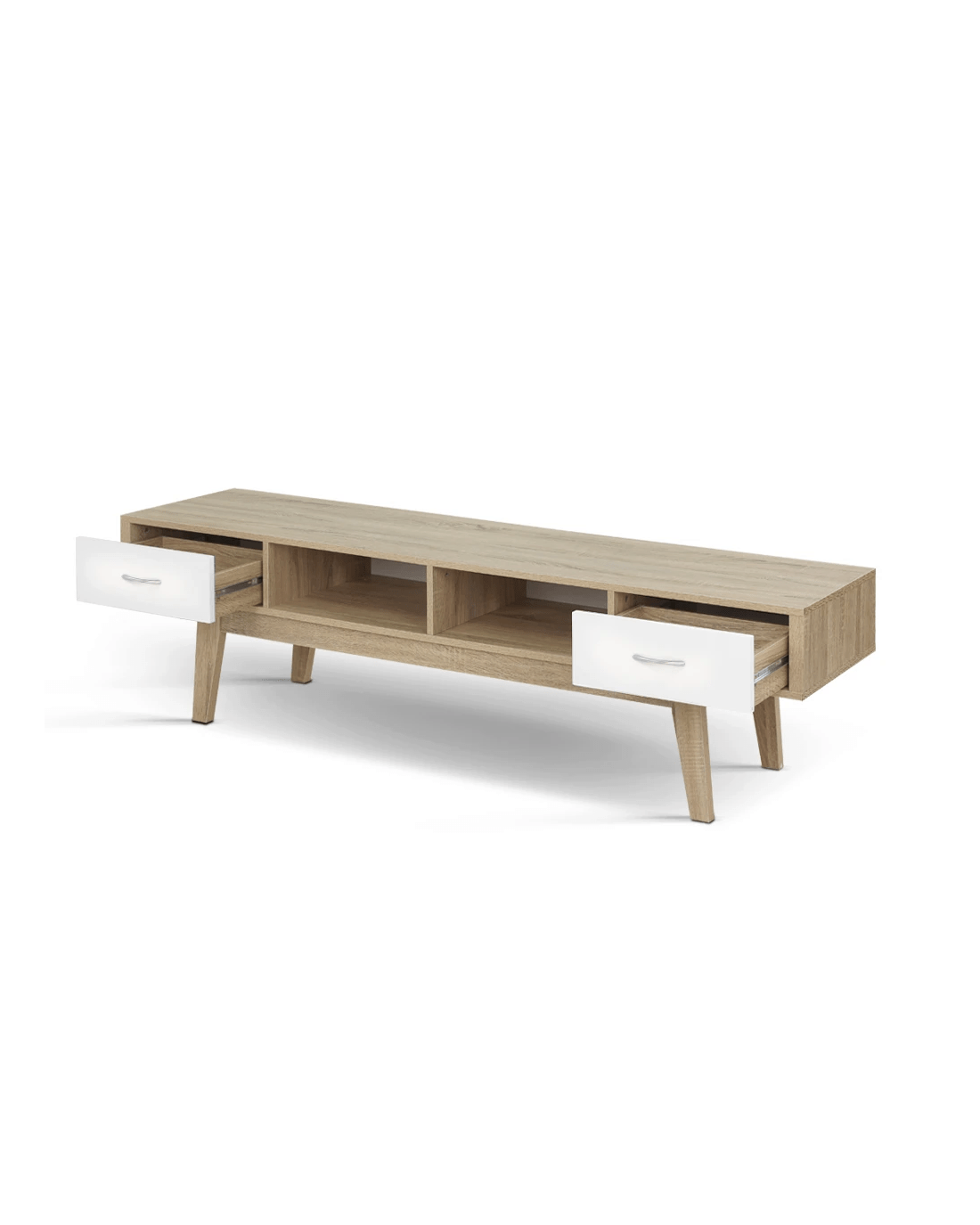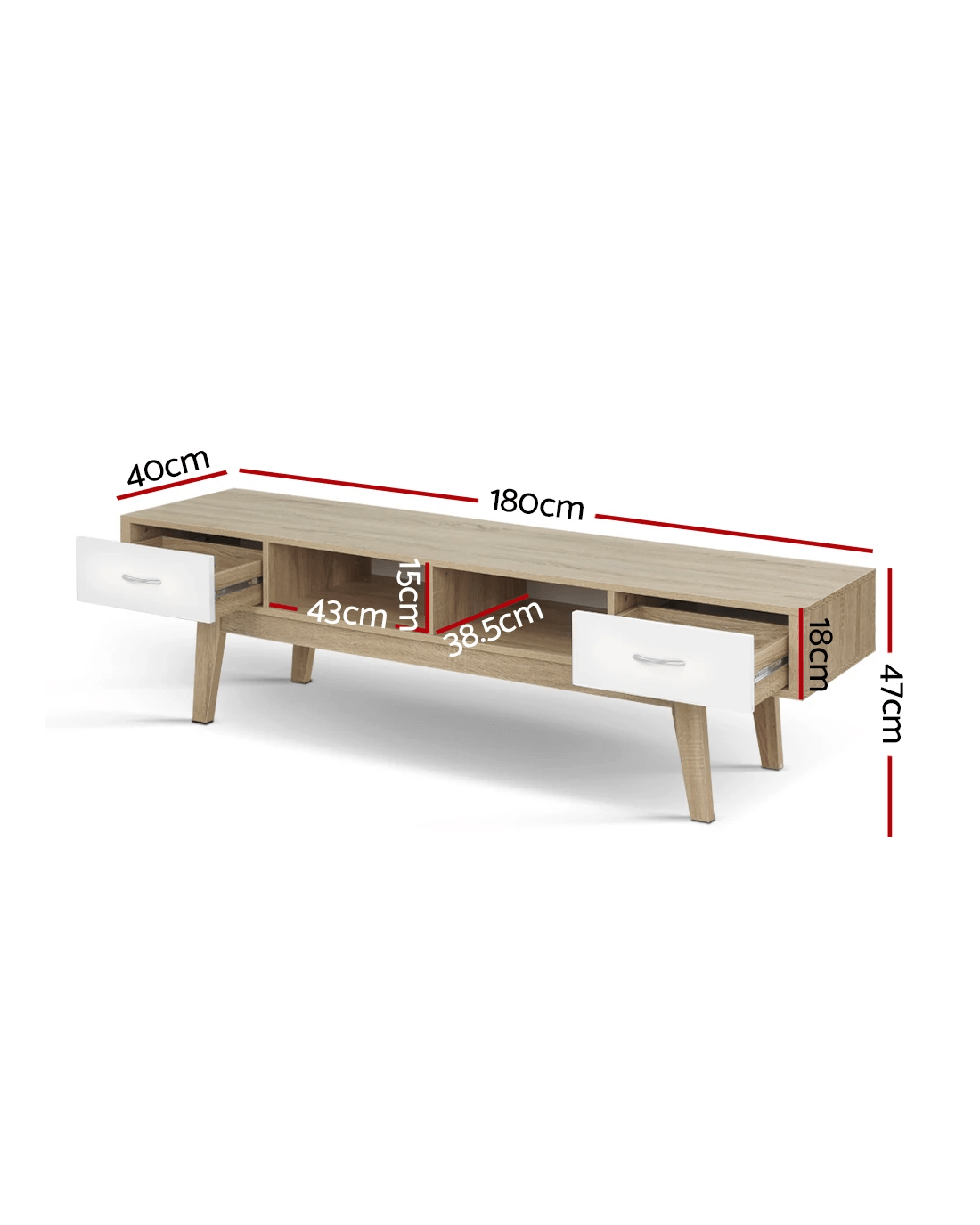 With its elegant Scandinavian-inspired design, our Artiss Entertainment Unit simply looks great in any modern living room. The 180cm length unit has ample space for any large screen TV as well as more room for other entertainment paraphernalia or displays. You will also find plenty of room for home and personal essentials with the two spacious drawers and shelves. The two-tone colour scheme makes for a beautiful match with any decoration while the splayed legs add a touch of artistic flair and stability to the entire ensemble. Not least, there are also two pre-drilled holes at the back for easy cabling through the unit for a neat, uncluttered look. Indulge in practical sophistication captured in fine style with our Nordic-influenced entertainment unit.