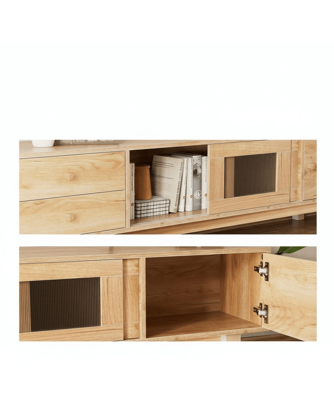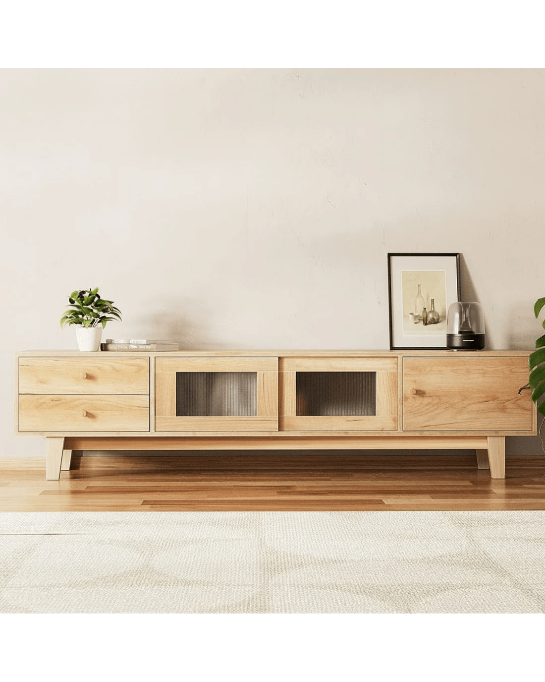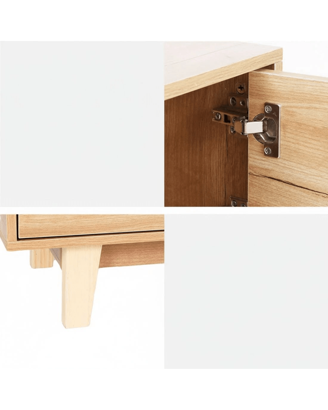 Constructed from melamine-finished particle board, this Artiss entertainment unit features durable metal hinges, a cable management hole, and sturdy rubber wood legs. It boasts a high weight capacity, low-maintenance cleaning, and simple assembly for added convenience.