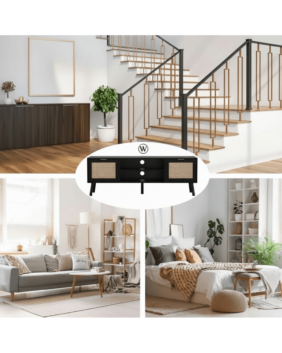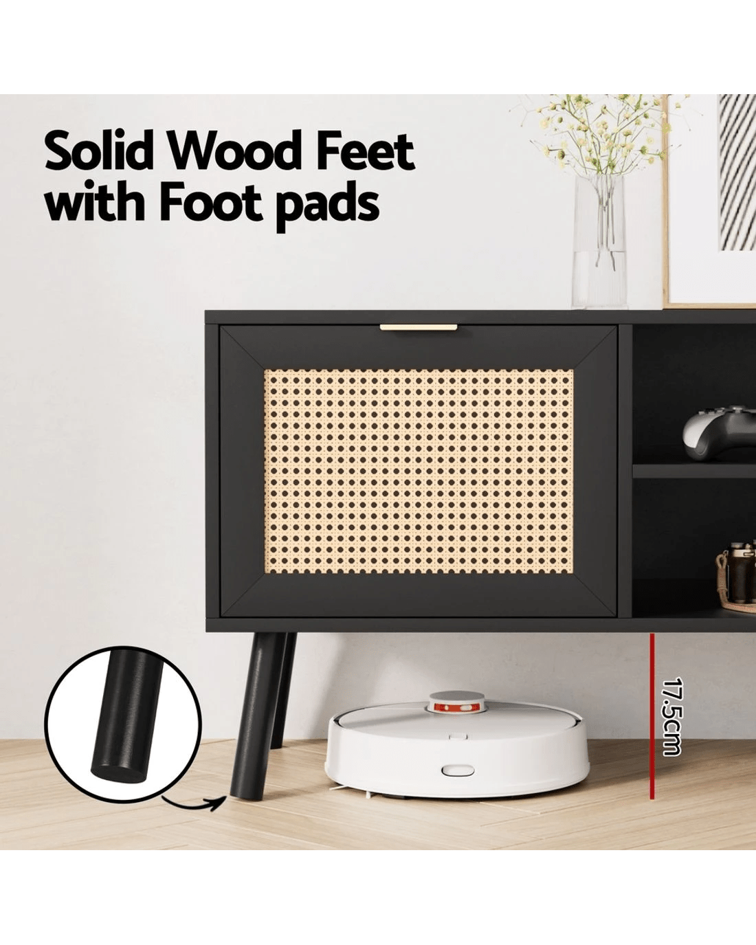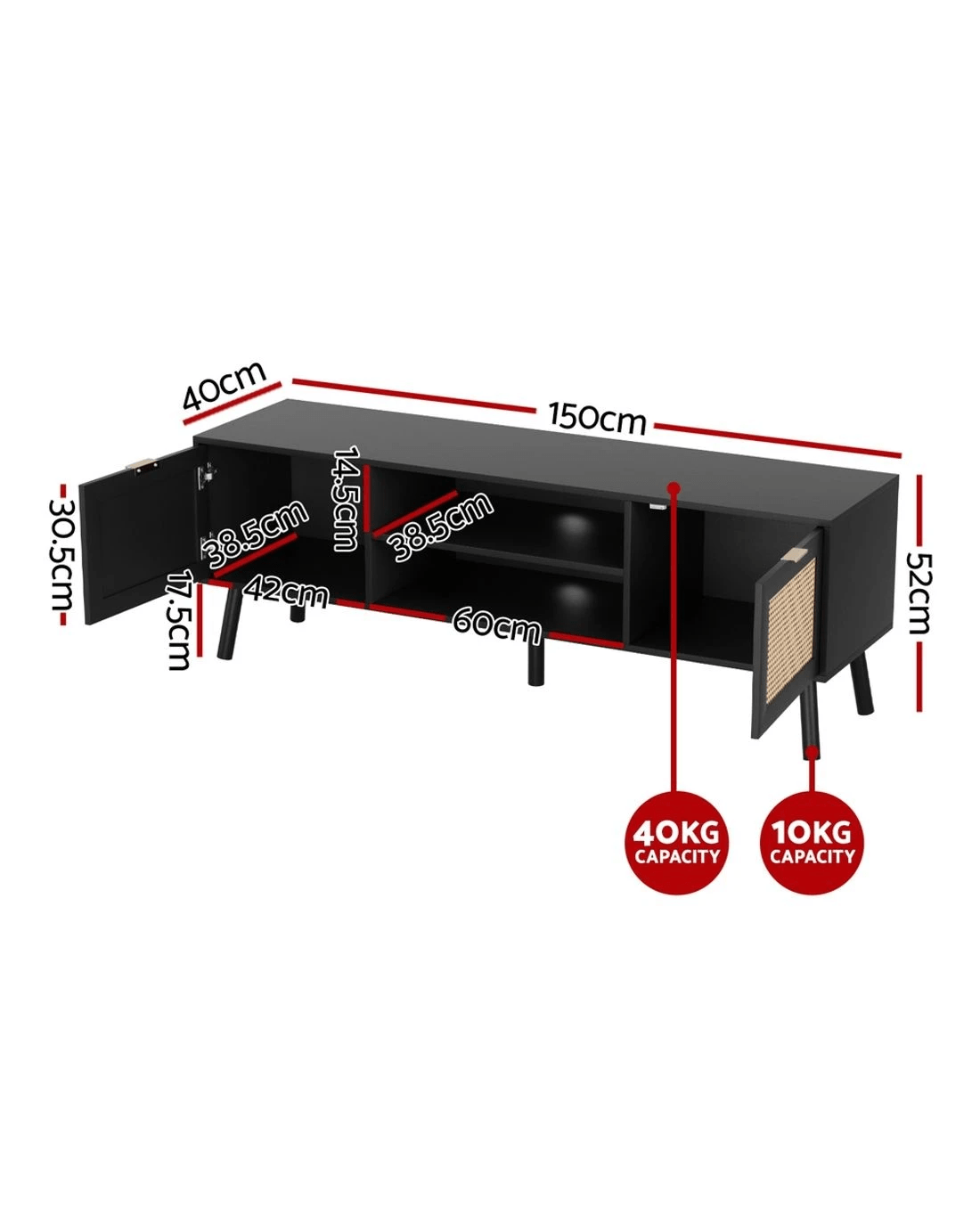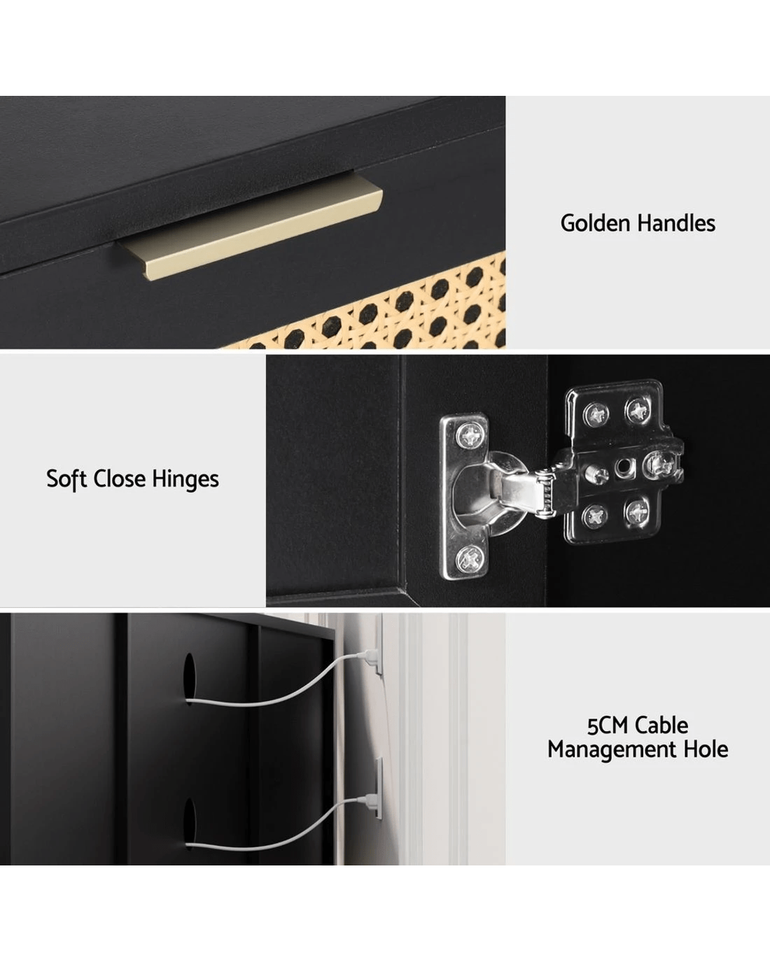 Artiss premium TV unit combines 2 side cabinets with 2-tier middle shelves, featuring golden metal handles and soft-close hinges. Crafted from E1-grade 15mm particle board with paper veneer finish, this sturdy black unit (150Lx40Dx52H/cm) supports 40kg tabletop capacity. Includes anti-tip kits, cable management holes, and solid wood feet with pads. Effortless assembly and wipe-clean surfaces ideal for living room entertainment setups.