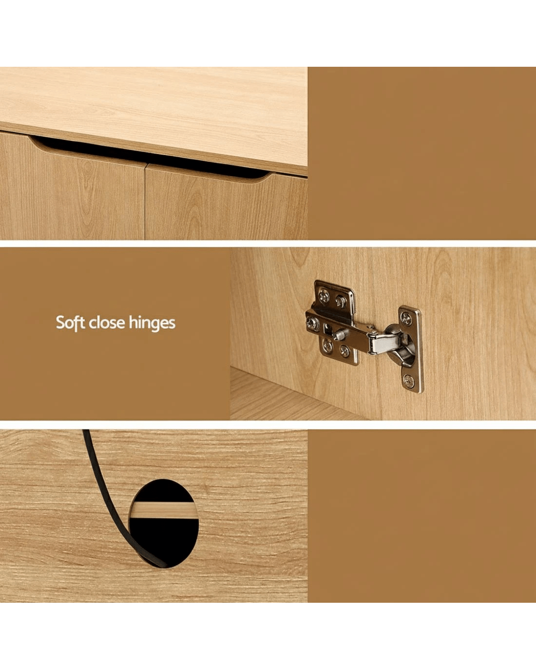 Signature air gap handles create sculptural shadows while enabling fluid push-open access to twin deep storage cabinets. Customise space freely with adjustable shelves (10kg capacity), accommodating soundbars, media kits, or treasured displays. The full-base frame and 80kg tabletop (E1 15mm PB) provide unwavering stability for large screens. Experience refined operation through soft-close hinges and dual cable ports that maintain clean sightlines. Clad in warm pine paper veneer, the surface renews its lustre with a quick wipe-down. Thoughtfully crafted with hassle-free hardware for straightforward assembly (two packages).