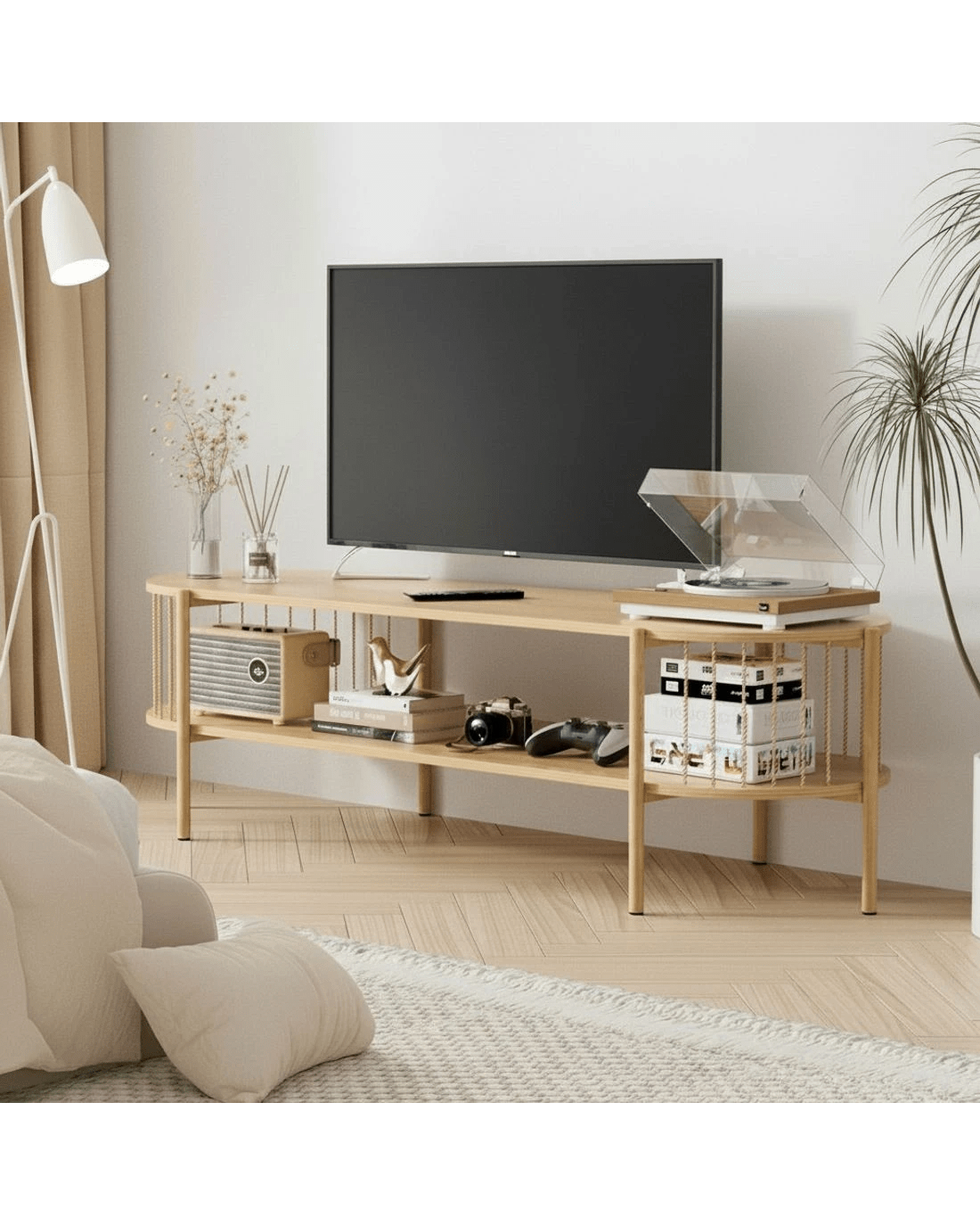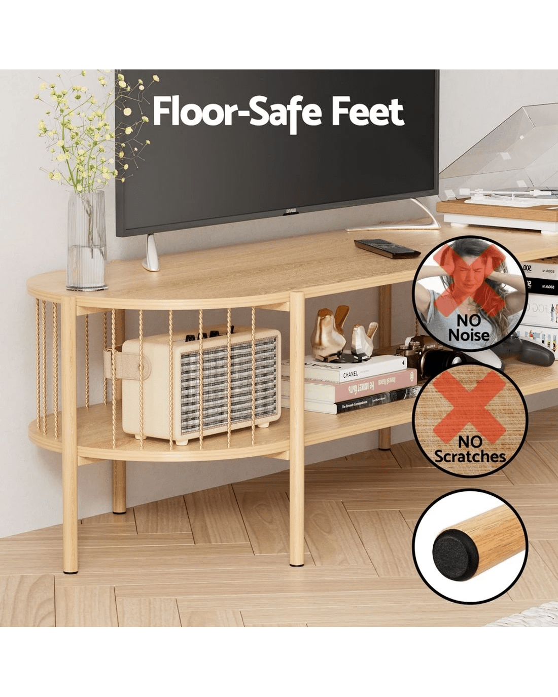 Crafted with sturdy construction using reinforced particleboard and rope-profile metal bars, this TV unit delivers high weight capacity (supports 60kg+) for large screens. Features a storage open shelf for media devices, radiused safety edges for child-friendly homes, and floor-saving foot pads to protect floors. Easy assembly (under 30 mins) with no tools required. Wipe-clean surfaces and scratch-resistant finishes ensure easy to clean and maintain—ideal for busy Aussie households. Compact yet spacious, its minimalist design suits coastal or urban lounges. Your perfect blend of durability, safety & smart storage.