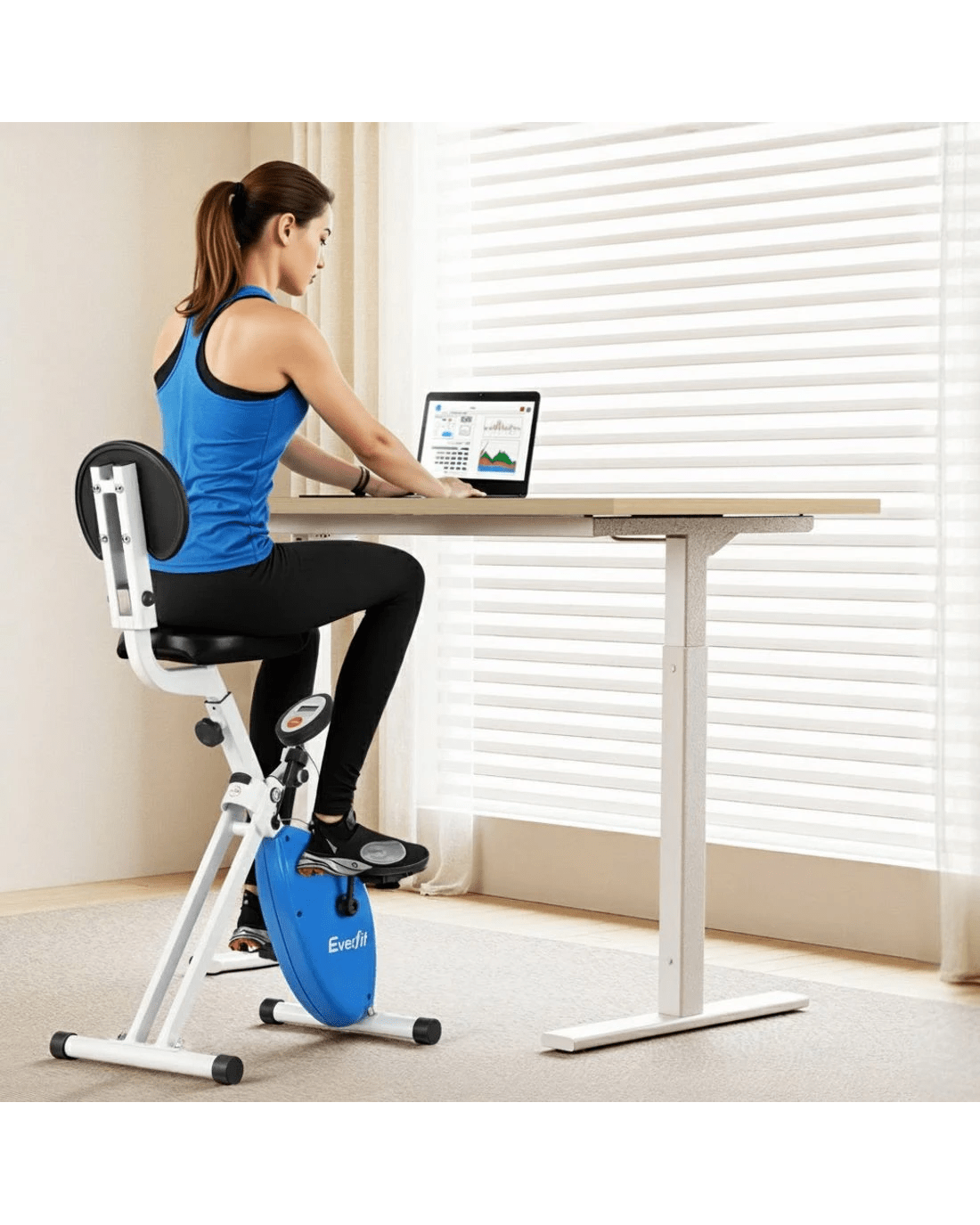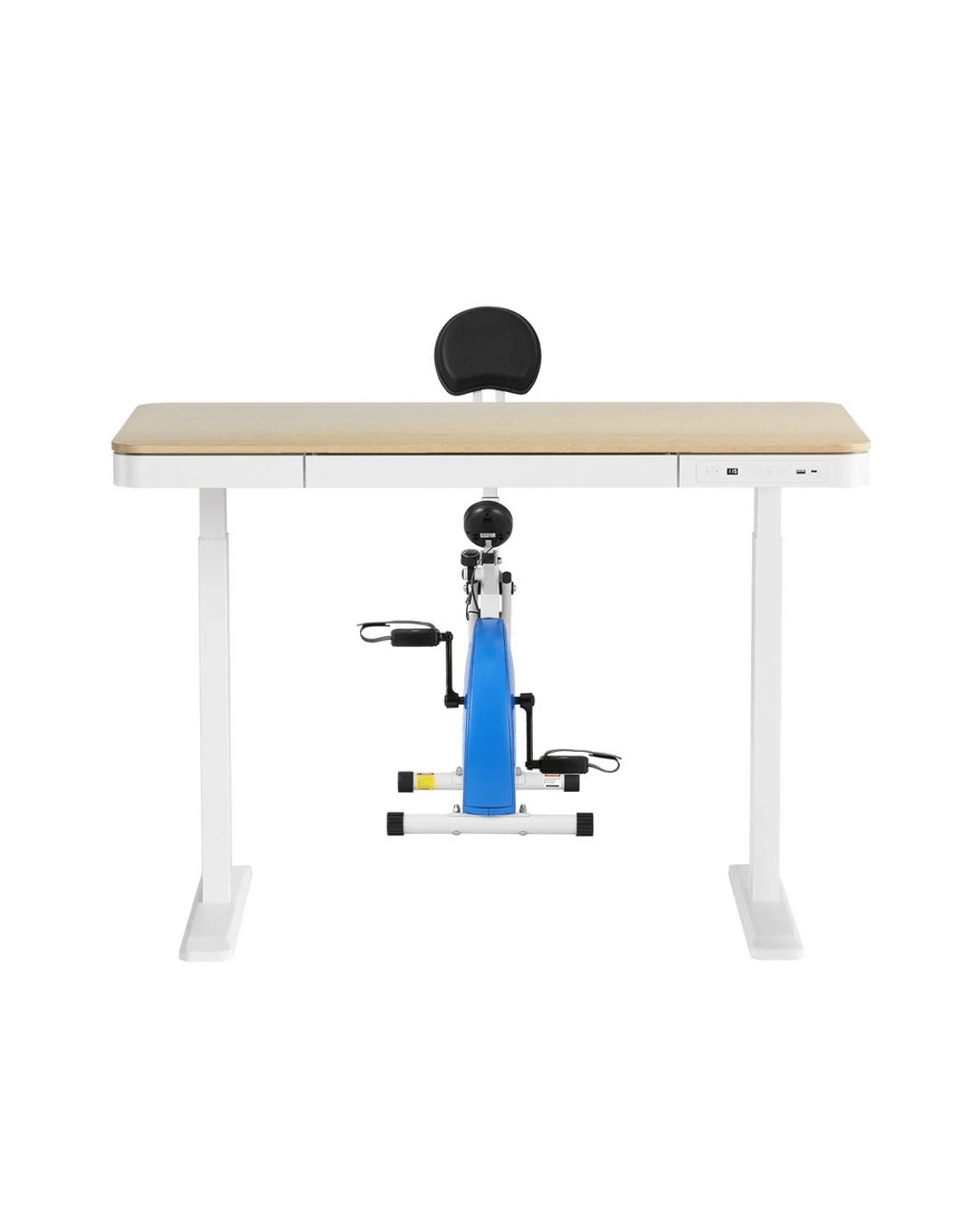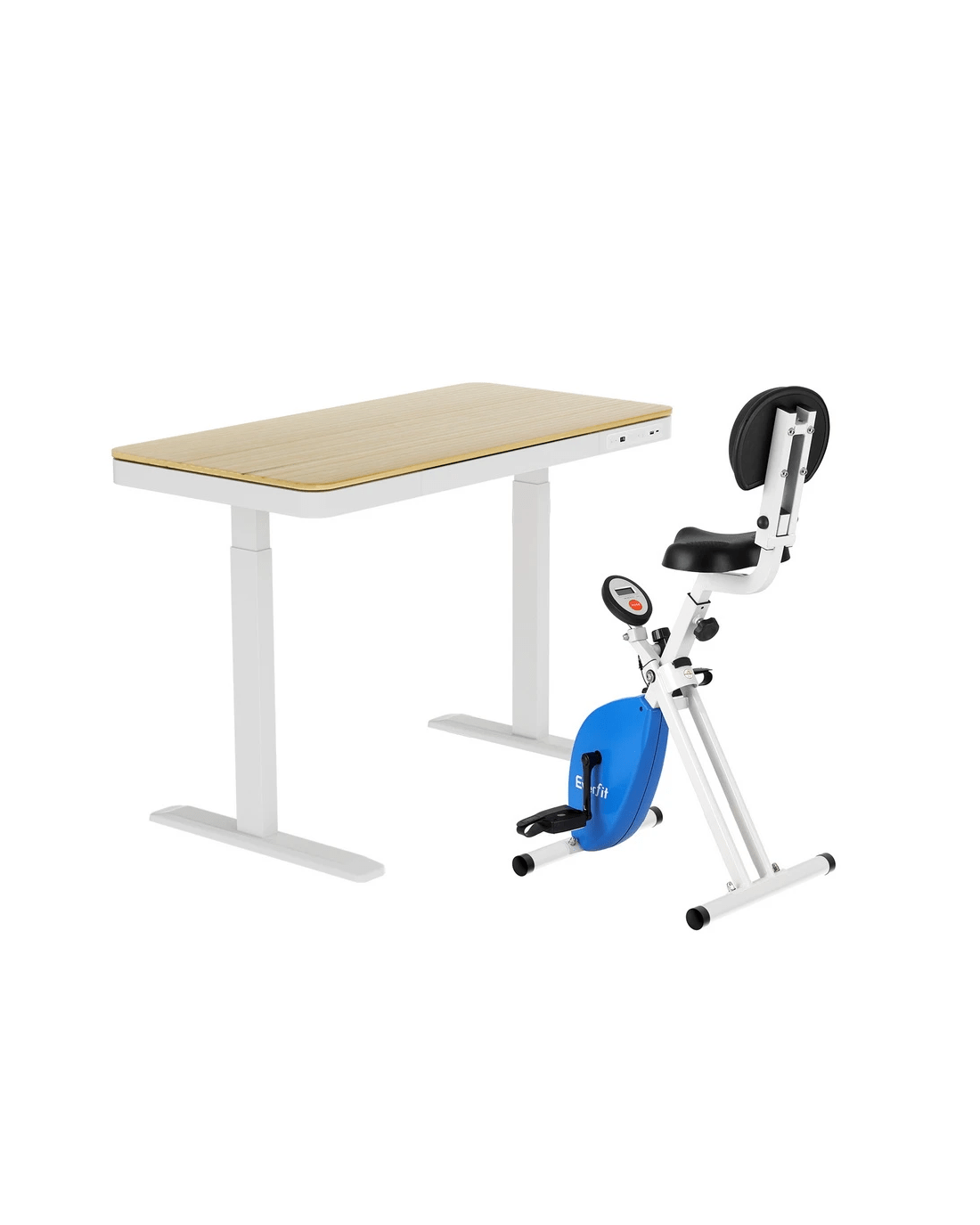 The electric standing desk with integrated under desk exercise bike offers a versatile workspace solution, allowing users to alternate between standing and sitting, promoting productivity and health, delivering efficient cardio workouts while you work or relax.