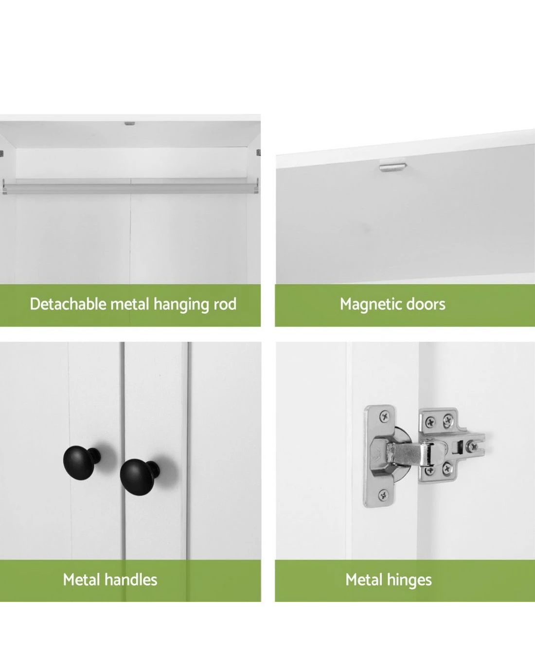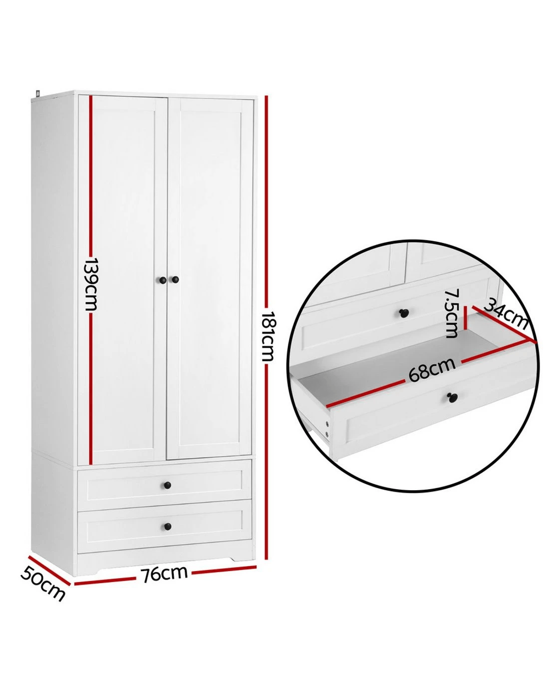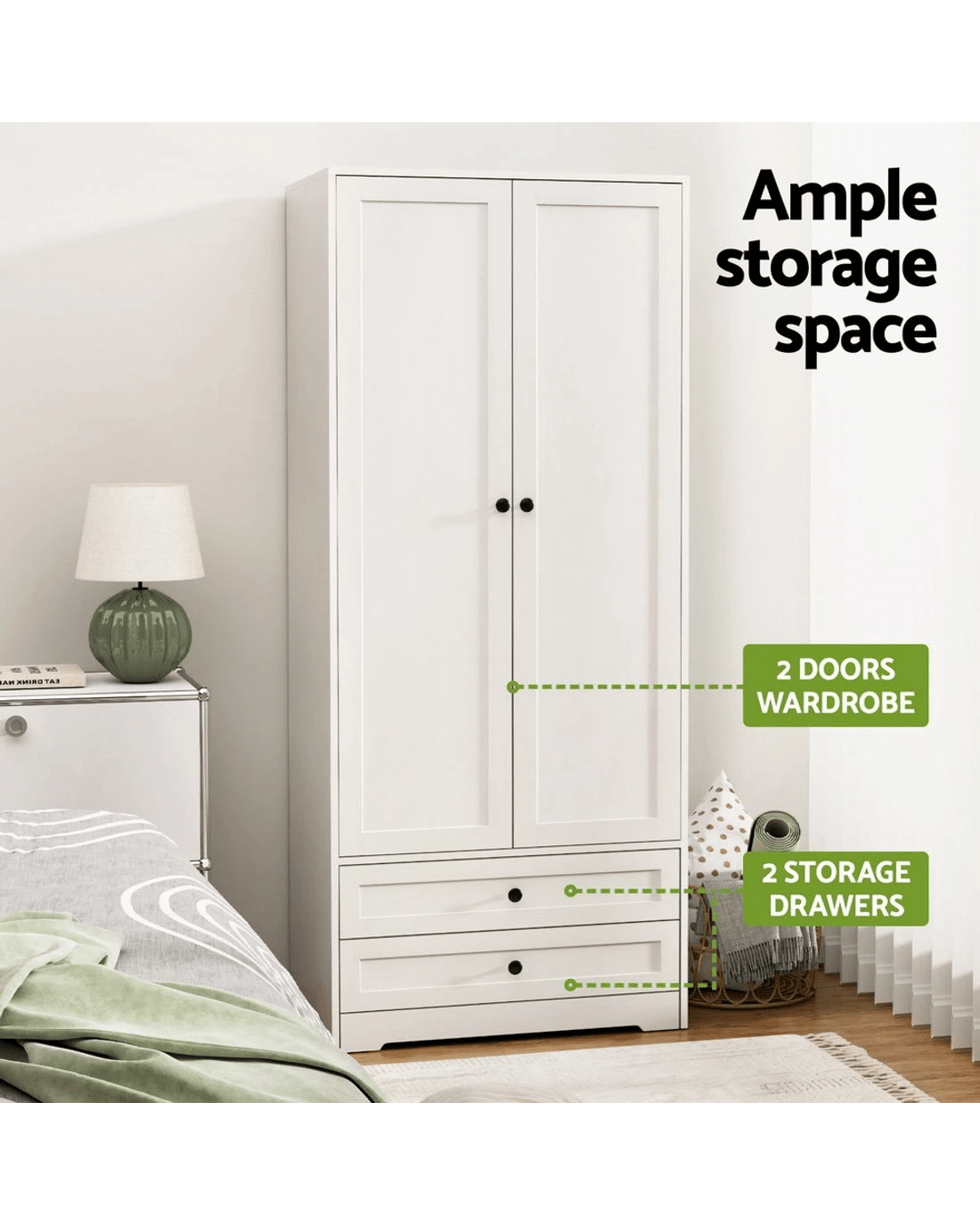 Artiss wardrobe combines 2 storage drawers and 2 magnetic doors for versatile clothes storage, featuring metal handles, hinges, and a detachable hanging rod for lasting use. Designed for Aussie homes, it includes smooth sliding runners, wall attachment kit, and high weight capacity to secure heavy loads. Easy assembly and easy-clean surfaces simplify maintenance, while its compact build suits tight spaces. Ideal for organised, fuss-free living.