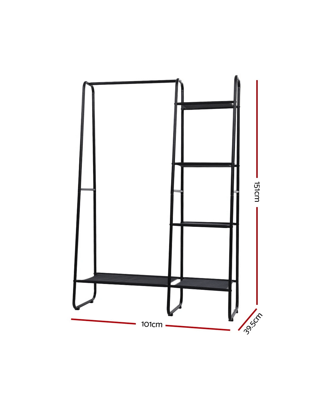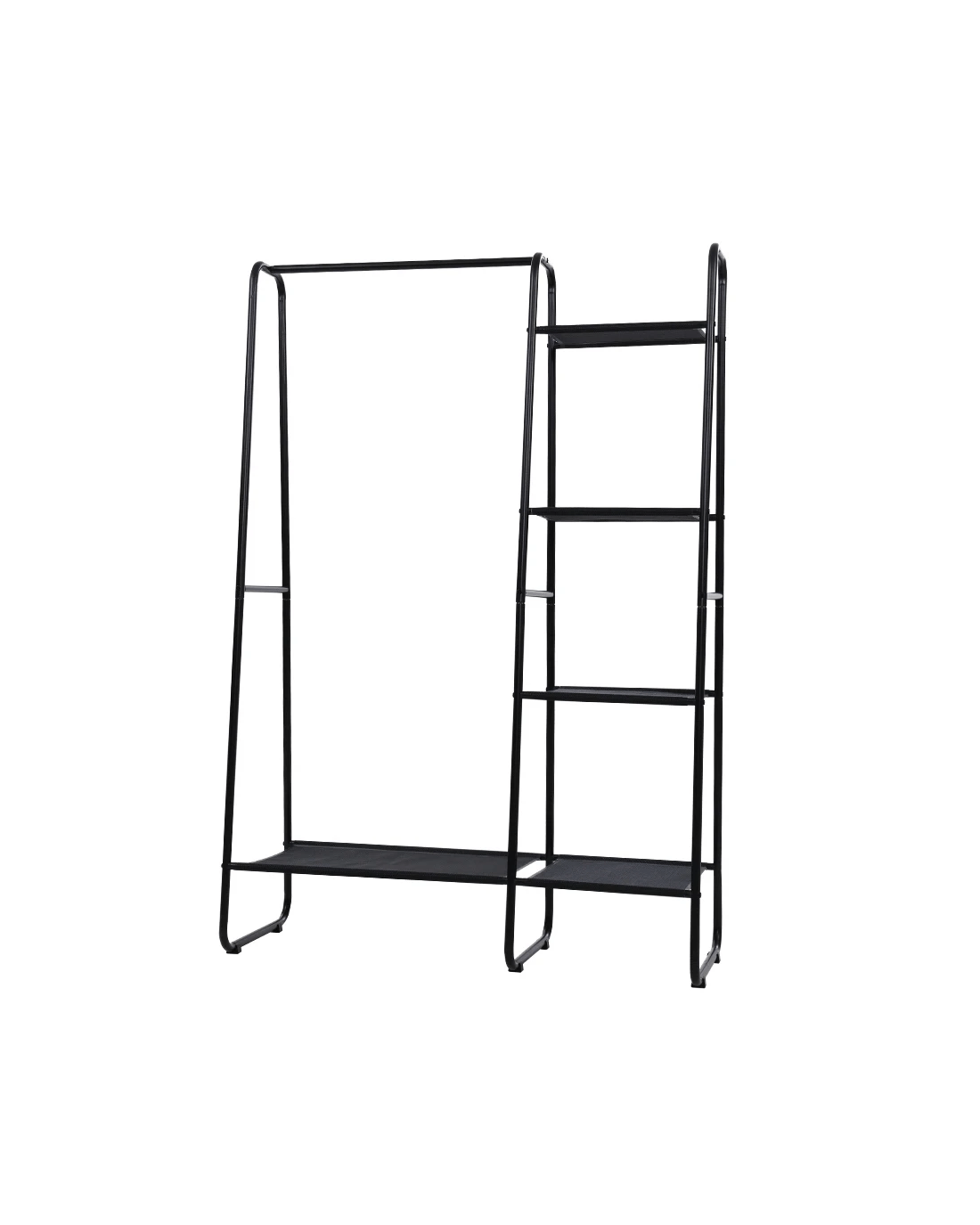 Need more clothing storage? Want a fast and easy option? Then look no further than our Metal Clothes Rack. The frame is made of sturdy powder-coated metal that can safely hold up your clothing and withstand robust use. The clothes rack has an anti-slip hanging bar and U-shaped base for extra stability so that your clothes do not end up on the floor. There are also five plastic storage shelves perfect for storing shoes, hats, folded clothes or other fashion items. The neutral black tone means the clothes rack will fit in with any décor and will look stylish even when left out in the open.