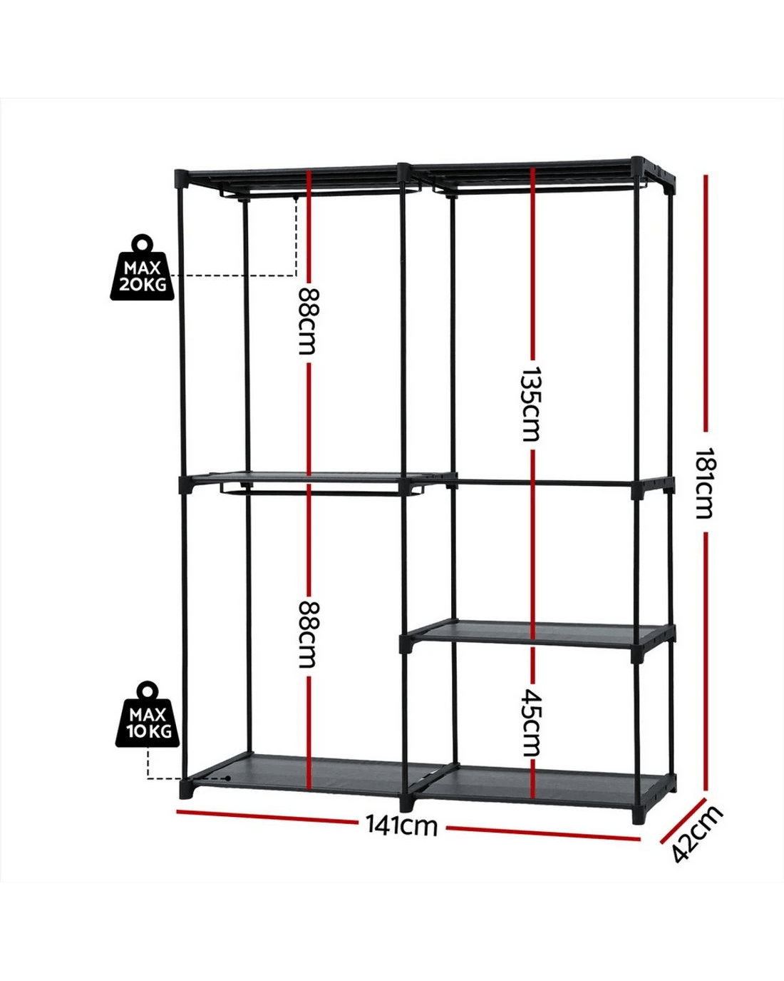 Each hanging rod weight capacity: 20 kg