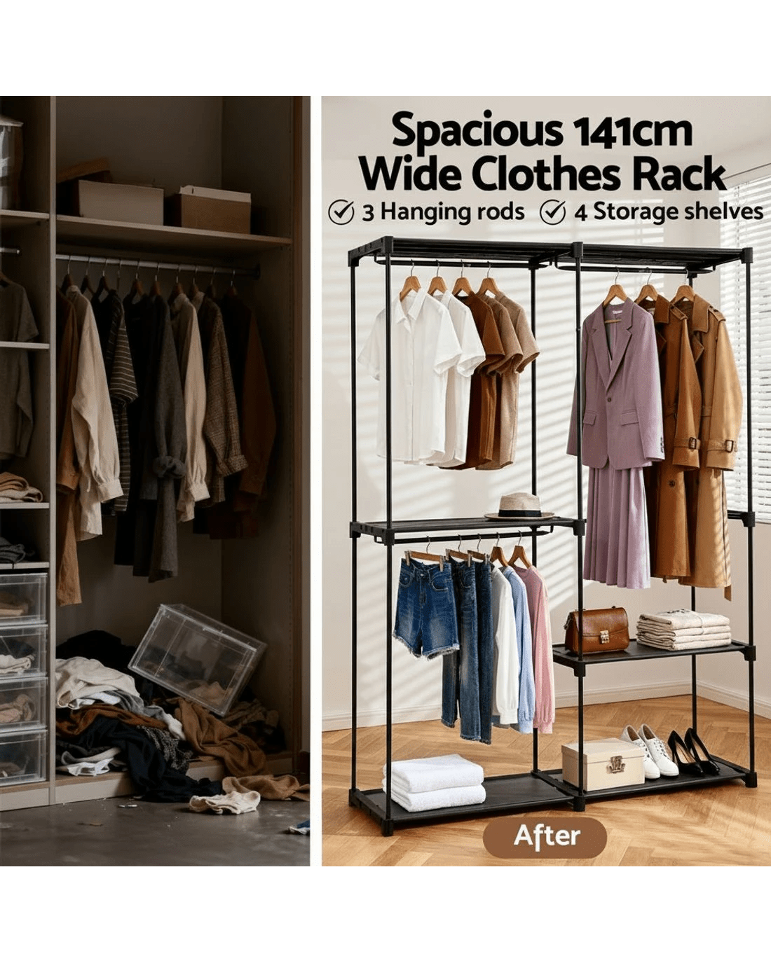 Upgrade your home or professional space with the Artiss Clothes Rack — a sturdy, space-saving and versatile solution for all your garment storage and drying needs. Designed with a sturdy metal frame, this free-standing clothes rack features three hanging rods and four spacious storage shelves, offering ample space to hang, dry or display a variety of garments, shoes and hats.