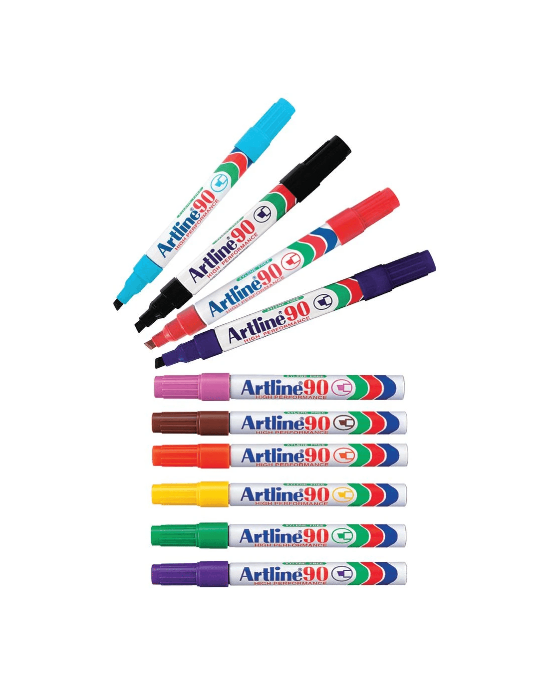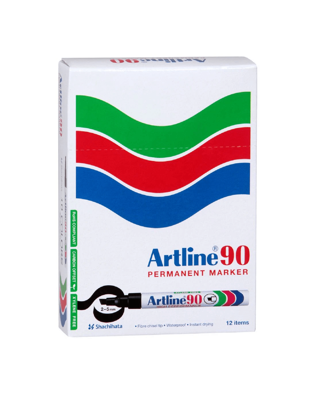 The Artline 90 Permanent Marker has a chisel tip that can mark both thin and thick lines permanently. It is suitable for a variety of porous and non-porous surfaces including cardboard, wood, steel and glass.