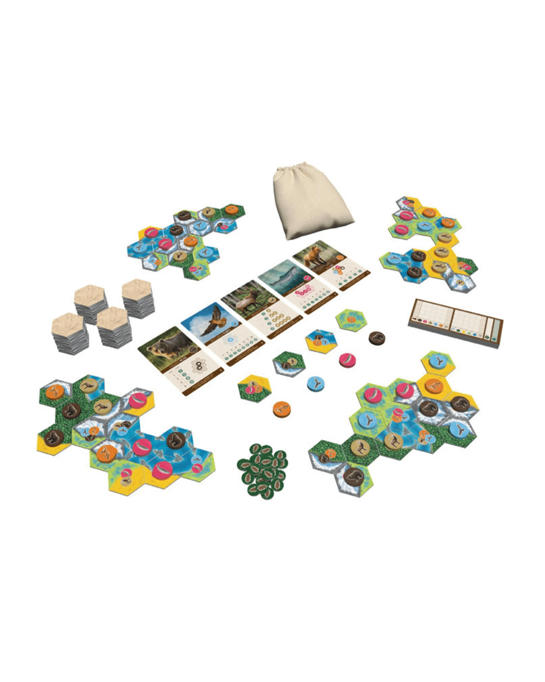 Cascadia is a puzzly tile-laying and token-drafting game featuring the habitats and wildlife of the Pacific Northwest. Players take turns building out their own terrain area and populating it with wildlife. Players must create a diverse and harmonious ecosystem as each animal species has a different spatial preference, and each habitat must be placed to reduce fragmentation and create wildlife corridors. Cascadia involves a unique dual-layer puzzle that progresses over time as more habitats and wildlife are added to each player's individual ecosystem. Players score points by creating the most harmonious spatial arrangements of wildlife, and also by creating the largest contiguous habitat corridors. Ages: 10 + | Players: 1 - 4
