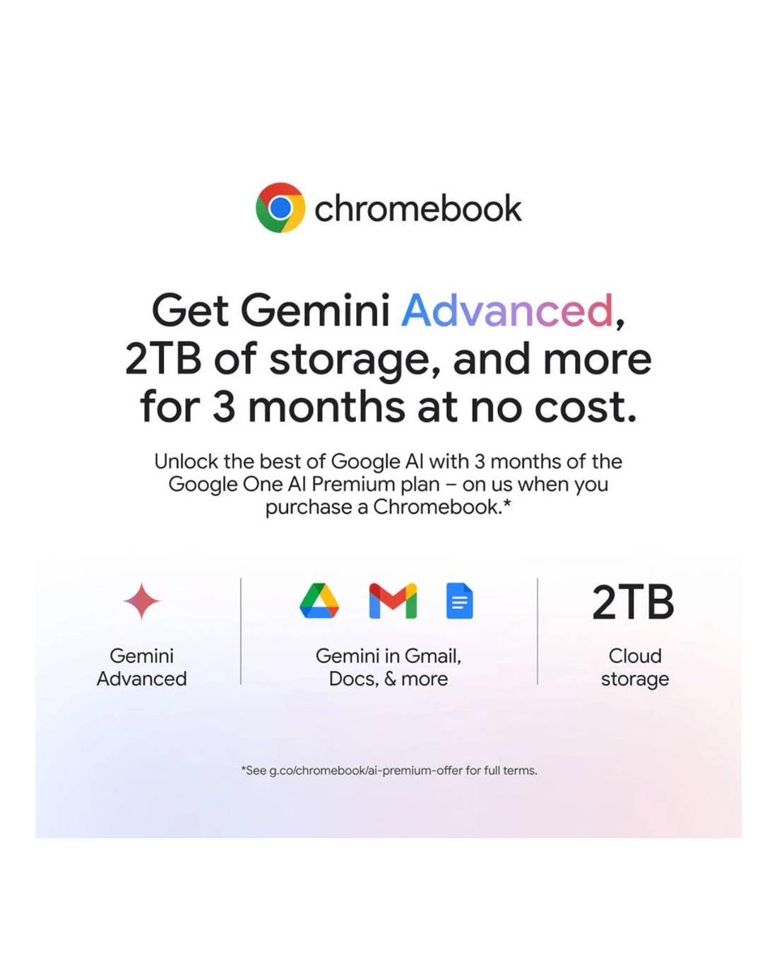 - This Chromebook runs ChromeOS, giving you access to built-in Google apps like Gmail, Docs, Photos, YouTube and Gemini.