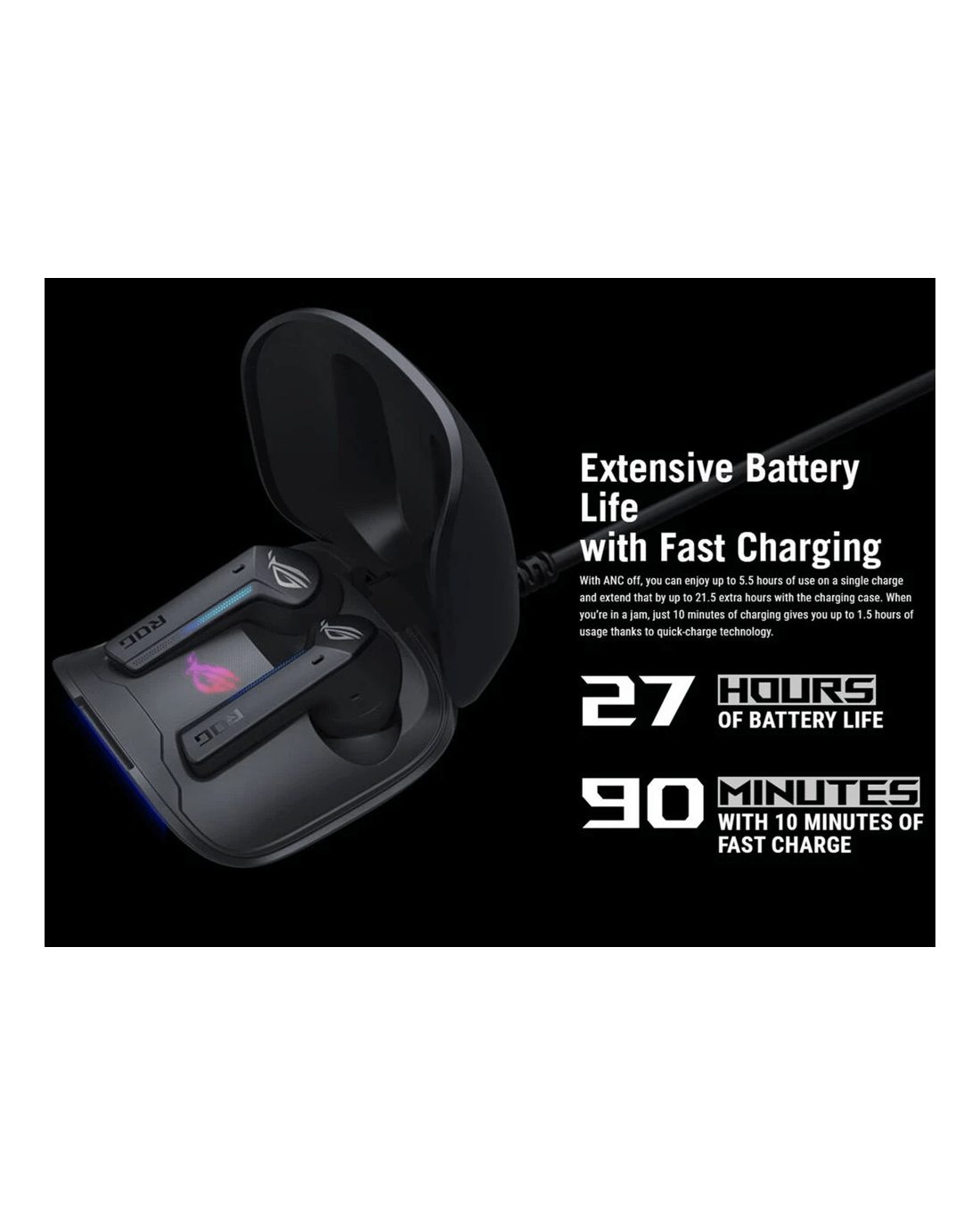 Enjoy highly detailed sound in a highly portable manner with these ASUS ROG Cetra True Wireless Gaming Earbuds. They have active noise cancellation, so you can fully immerse in your media without disruptions. They provide a battery life of up to 27 hours per full charge, so you can enjoy for long durations.