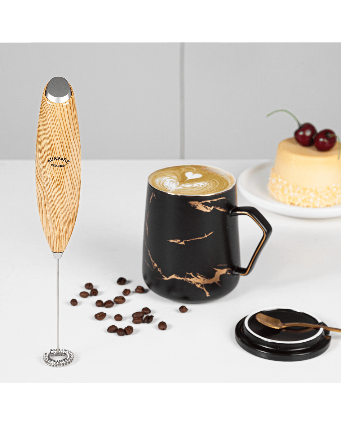 Auspure Milk Frother Handheld Electric Whisk Brown Wood