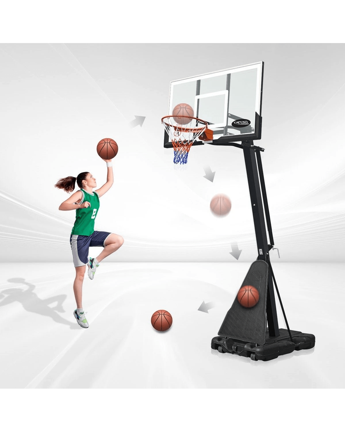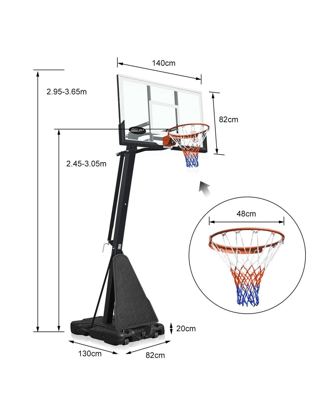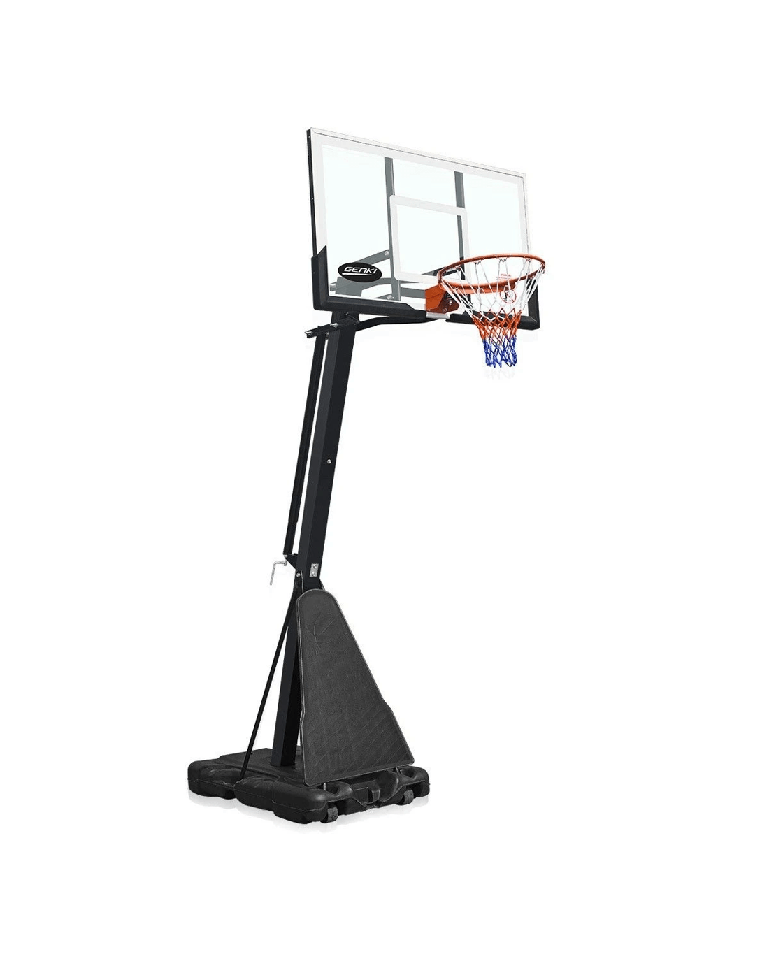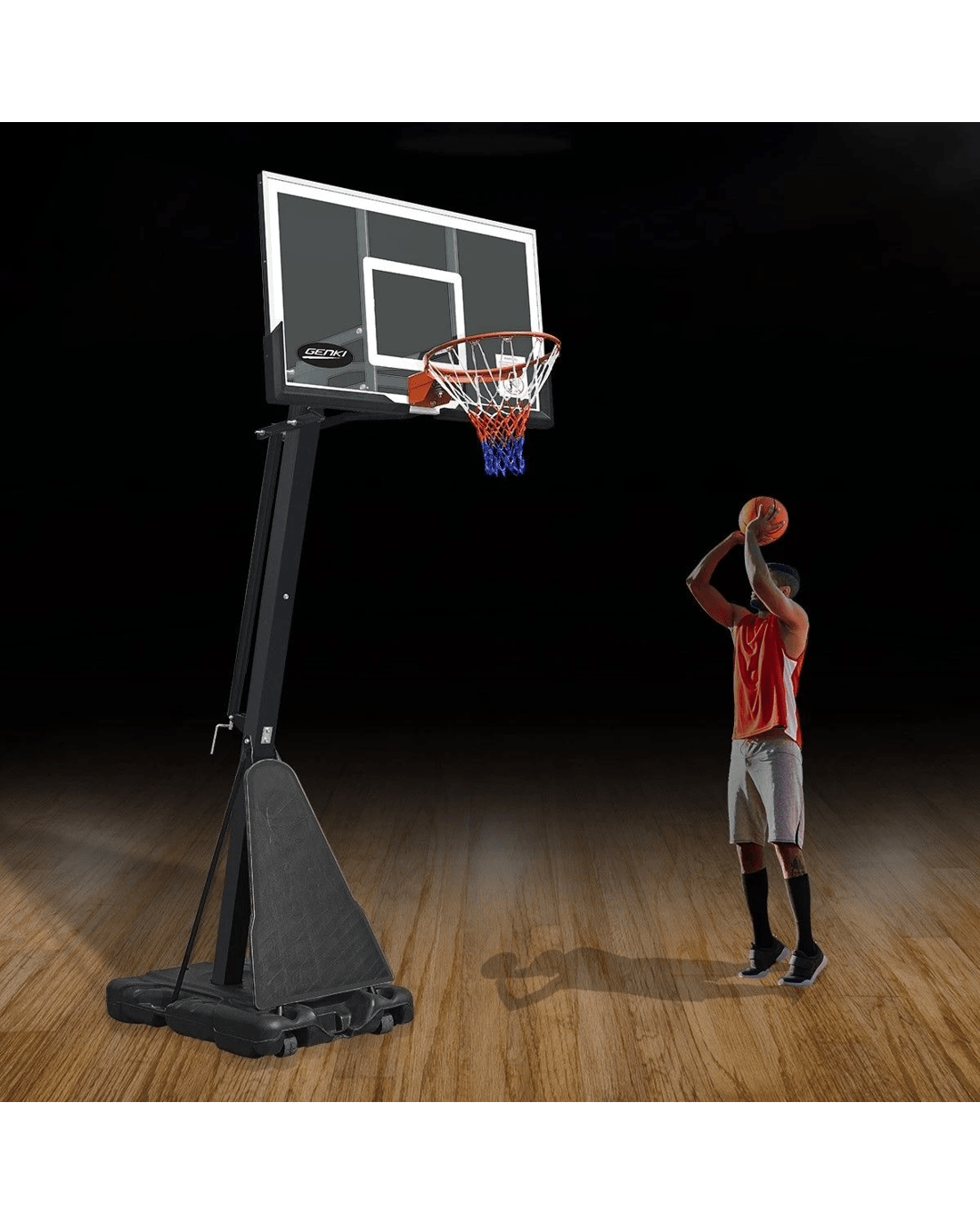 Do you love playing basketball? Are you hunting for a perfect gift to surprise your kids and friends who love playing basketball? This Genki Adjustable Indoor Outdoor Portable Basketball Hoop System Stands w/Wheels & Scoreboard will suit your needs. Thanks to its quality and large PC backboard, high intensity steel tube pole, blow molding durable PE base, steel ring and weather proof nylon net, this basketball system will provide you a realistic and secure playing experience for you and your kids. The transparent, shatterproof PC with PE padded rebound backboard and reflective stickers make it unbreakable and colorful. The portable basketball stand height ranging from 2.45m to 3.05m allows to adjust at the preferred level, making it ideal for both kids and adults to slam dunk. Featuring powder coating finishes, this outdoor basketball stand can keep from rain and rust. This adjustable basketball hoop remains stable as the molded base can be filled with 160kg of water. The pole pad will deliver superior ball response and protect the players simultaneously. Moreover, with 2 smooth wheels under the base, this portable basketball hoop system can be easily moved around. Order this basketball stand to play like professional basketball player or your favourite player with bonus scoreboard now. Note: Slam dunk is suitable for the weight under 80kg.