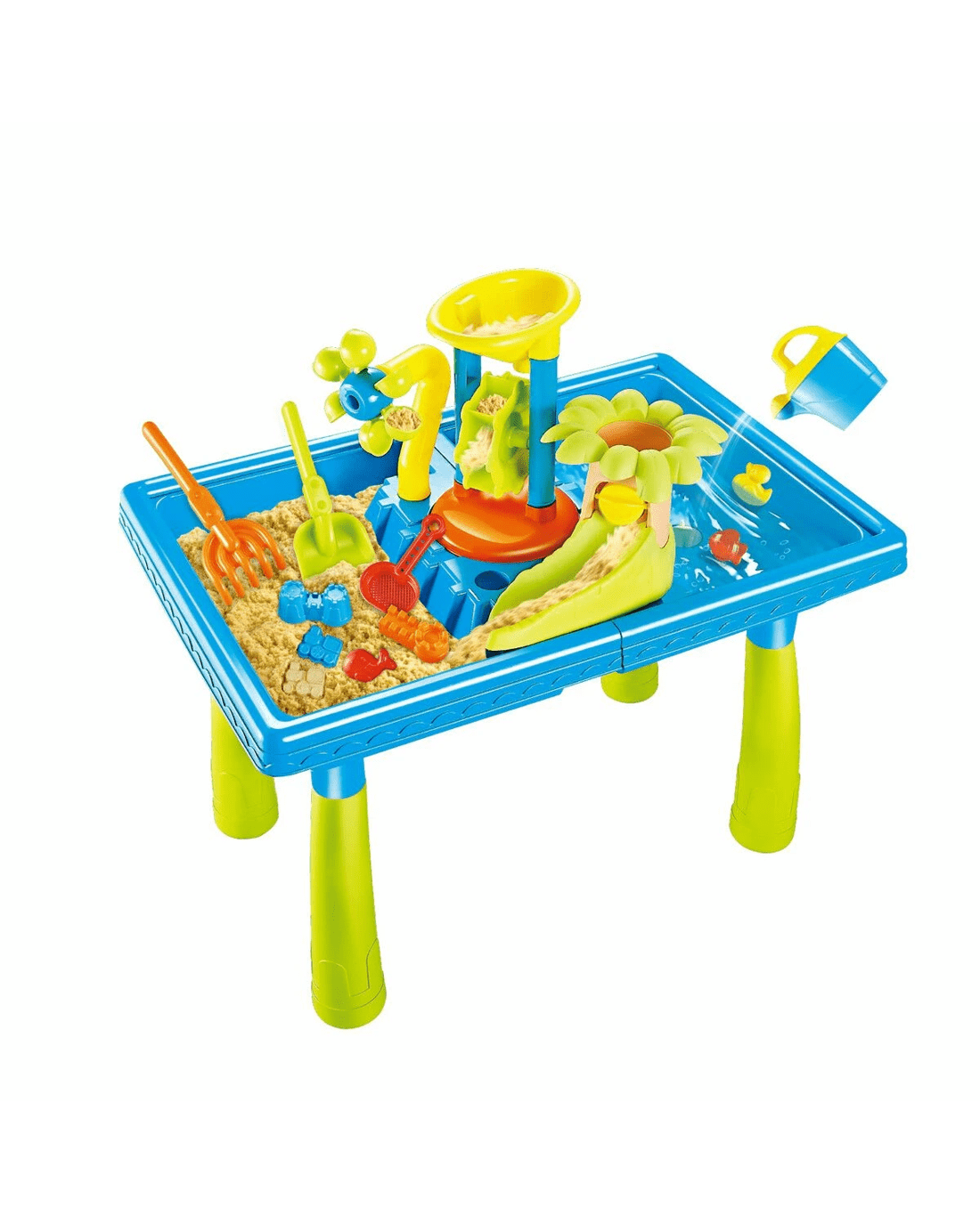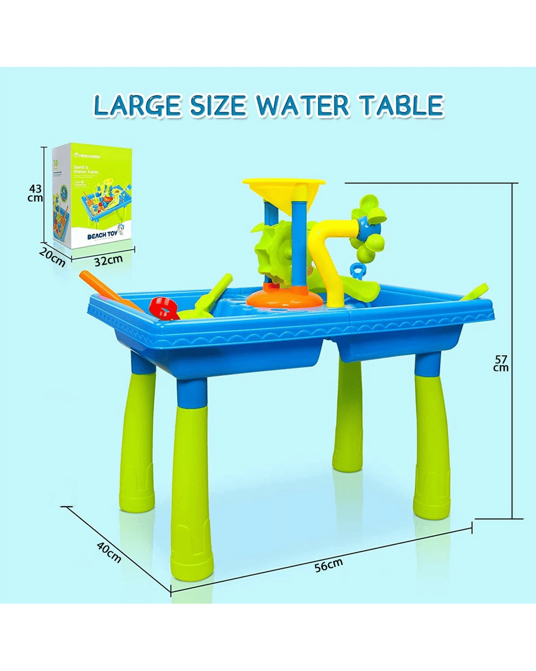 - 39PCS sand and water toy accessories: This sand water table comes with a water windmill, water slide, watering can, shovel, rake, sieve, crab, car, aeroplane, ice cream and fish-shaped moulds and more. The colour water table accessories have smooth edges so that children can play them fun safely.