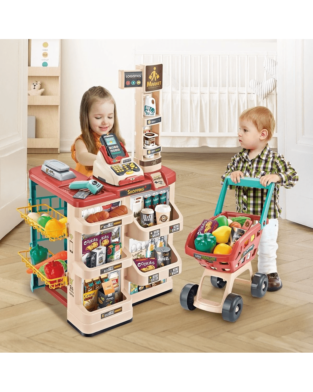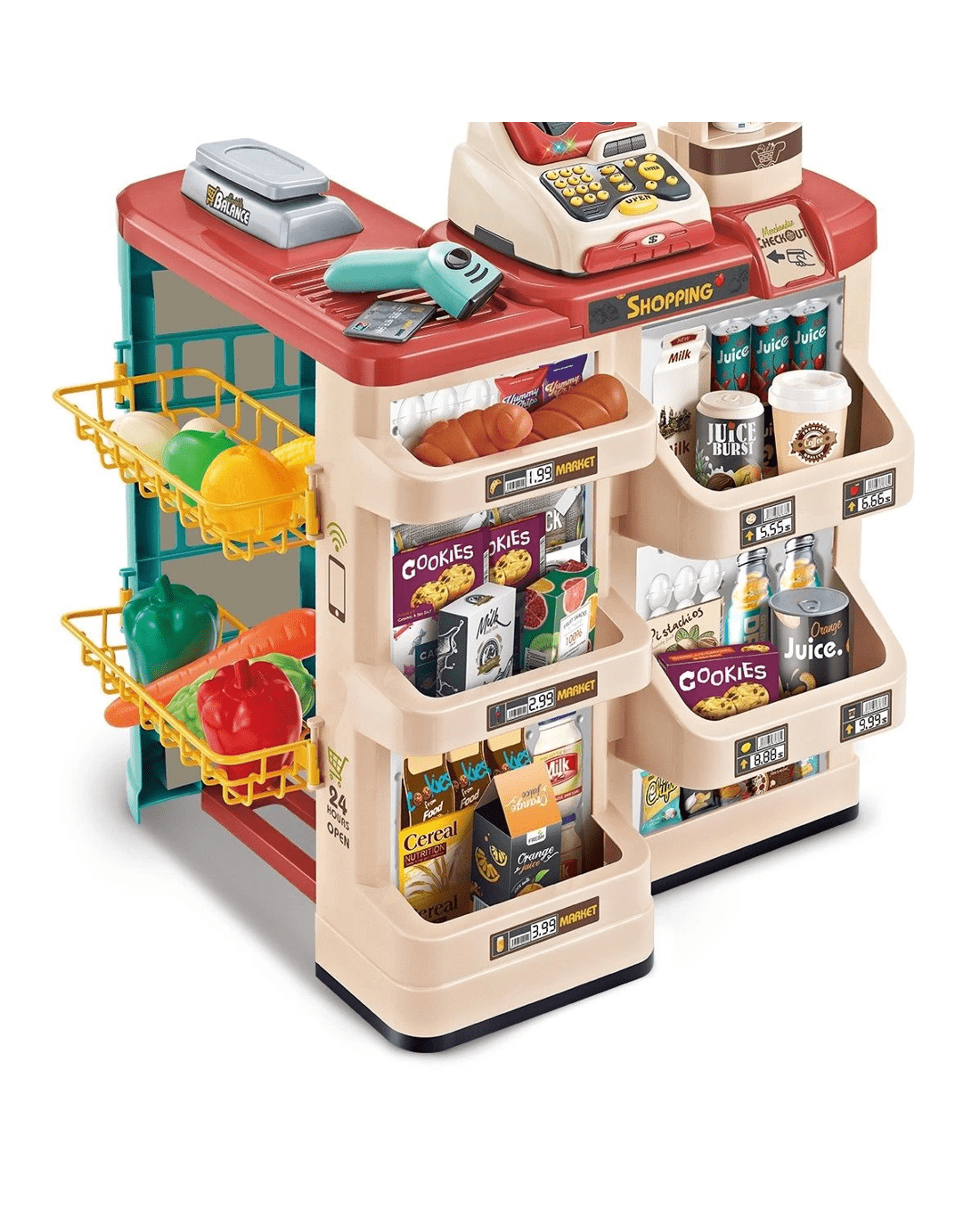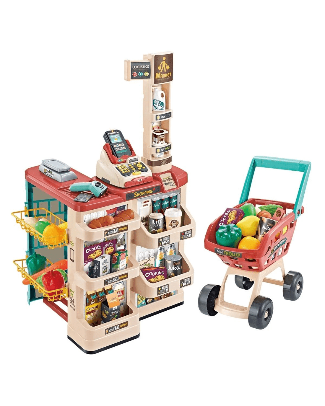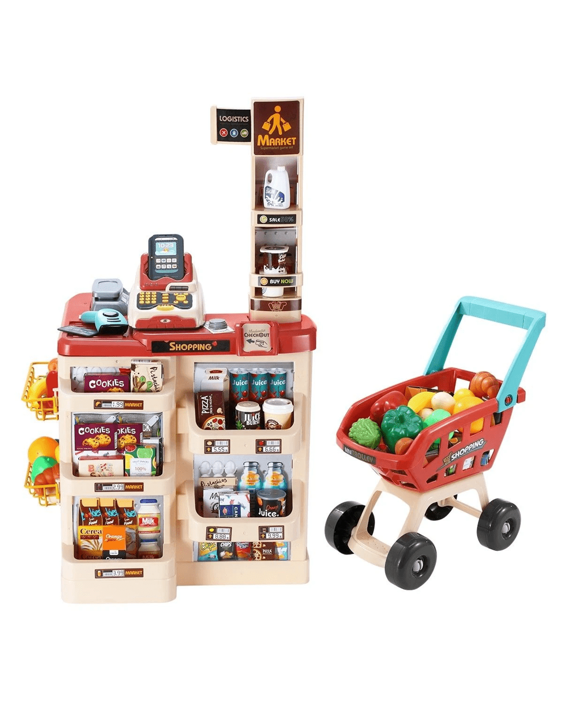 This 48 pieces kid's toy supermarket pretend play set combines recreation and education in one for your preschool children, which allows them to enjoy hours of fun playing as sellers or buyers. It comes with a variety of accessories such as groceries, goods, a trolley, a beeping scanner, a calculator, a pos machine, a cash drawer and many other realistic items. Featured with vivid patterns, interesting sound and light effects, this kid's role play toy can easily spark your child's imagination and creativity. It is safe for child use, made from environmentally friendly and non-toxic materials. Check out the educational toys to unleash your little one's brilliant potentials right now.