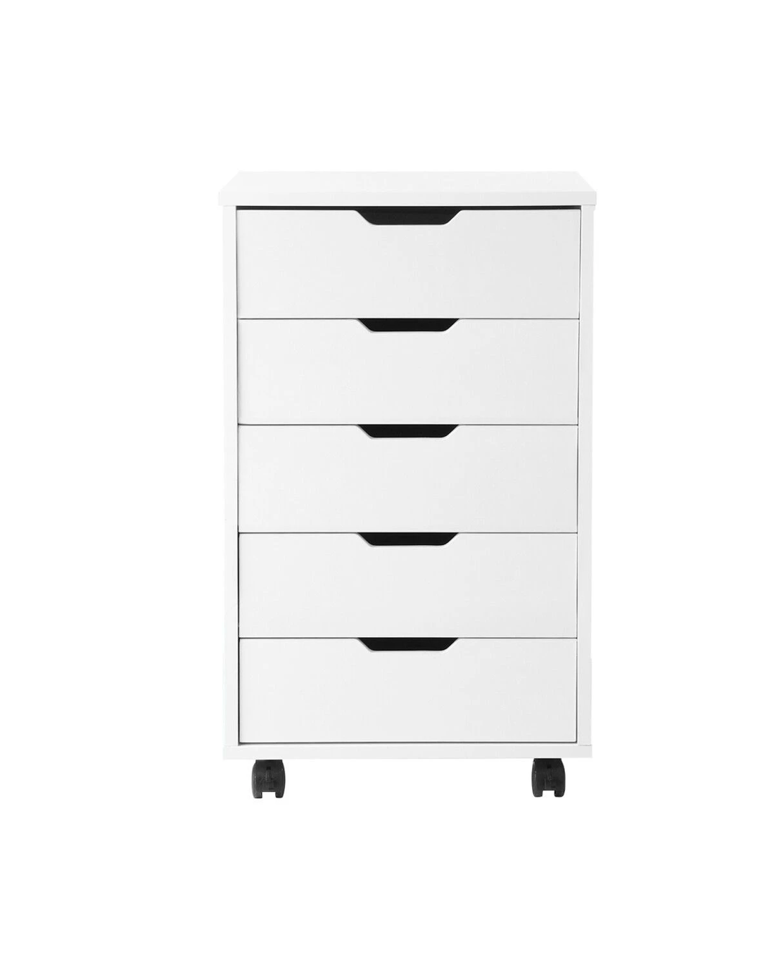 Organise your workspace and improve productivity and efficiency using this Mobile Filing Cabinet. Ideal for any modern home or office, it blends functionality perfectly with elegance. Keep your workspace or room organised and clutter-free by collecting various essentials in one place. The tabletop surface offers roomy space for printers, desk lamps, or telephones, and five spacious drawers provide versatile storage for documents and other office supplies. Effortlessly move it around your space with four lockable universal wheels. Plus, the high-quality construction ensures durability and reliability, while the waterproof surface makes it easy to clean and maintain.
