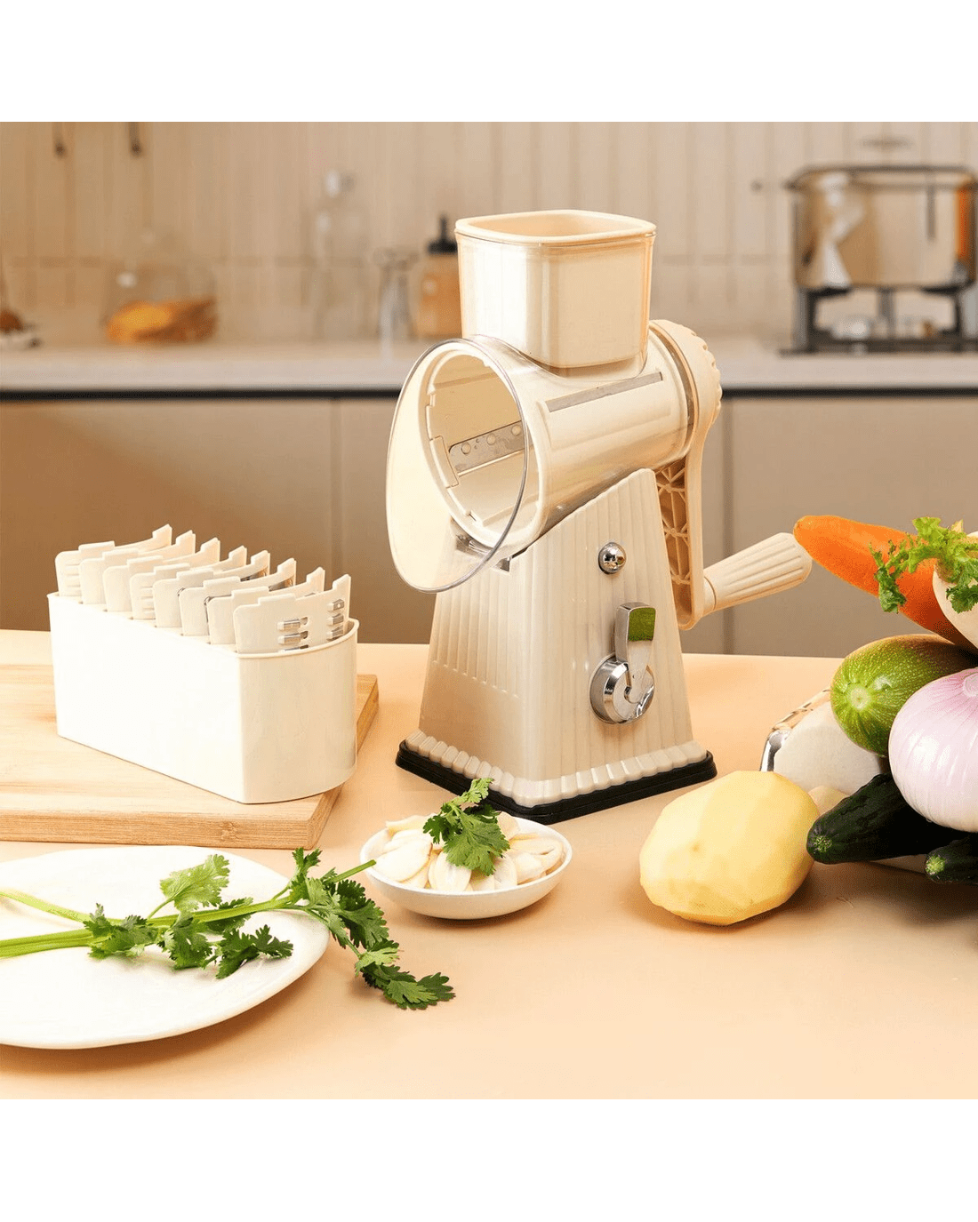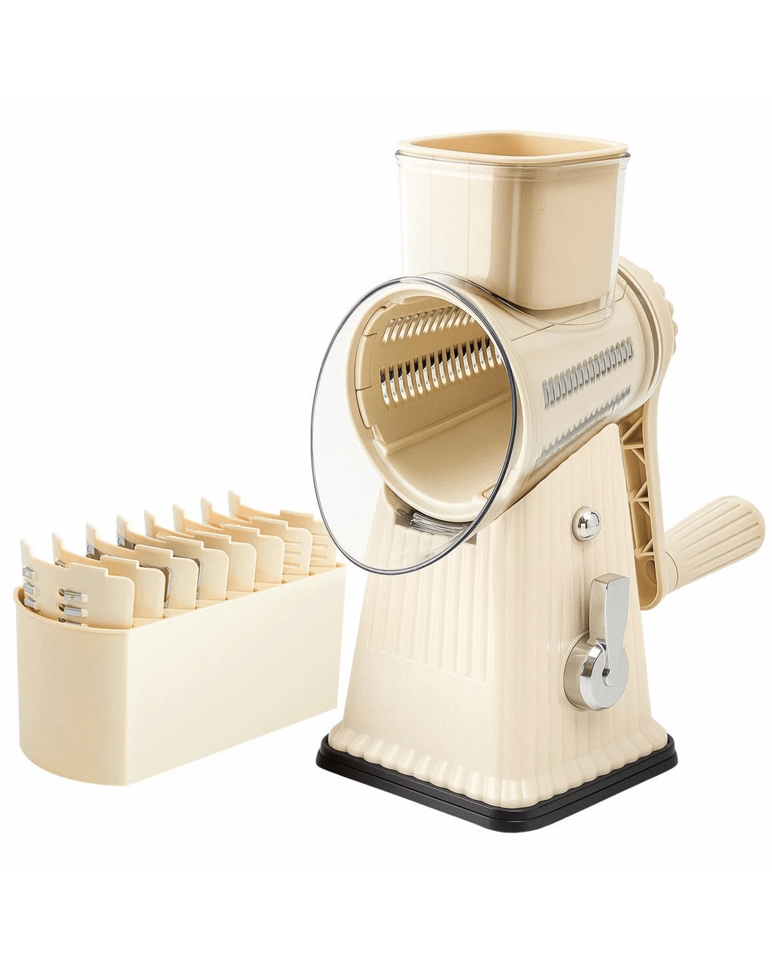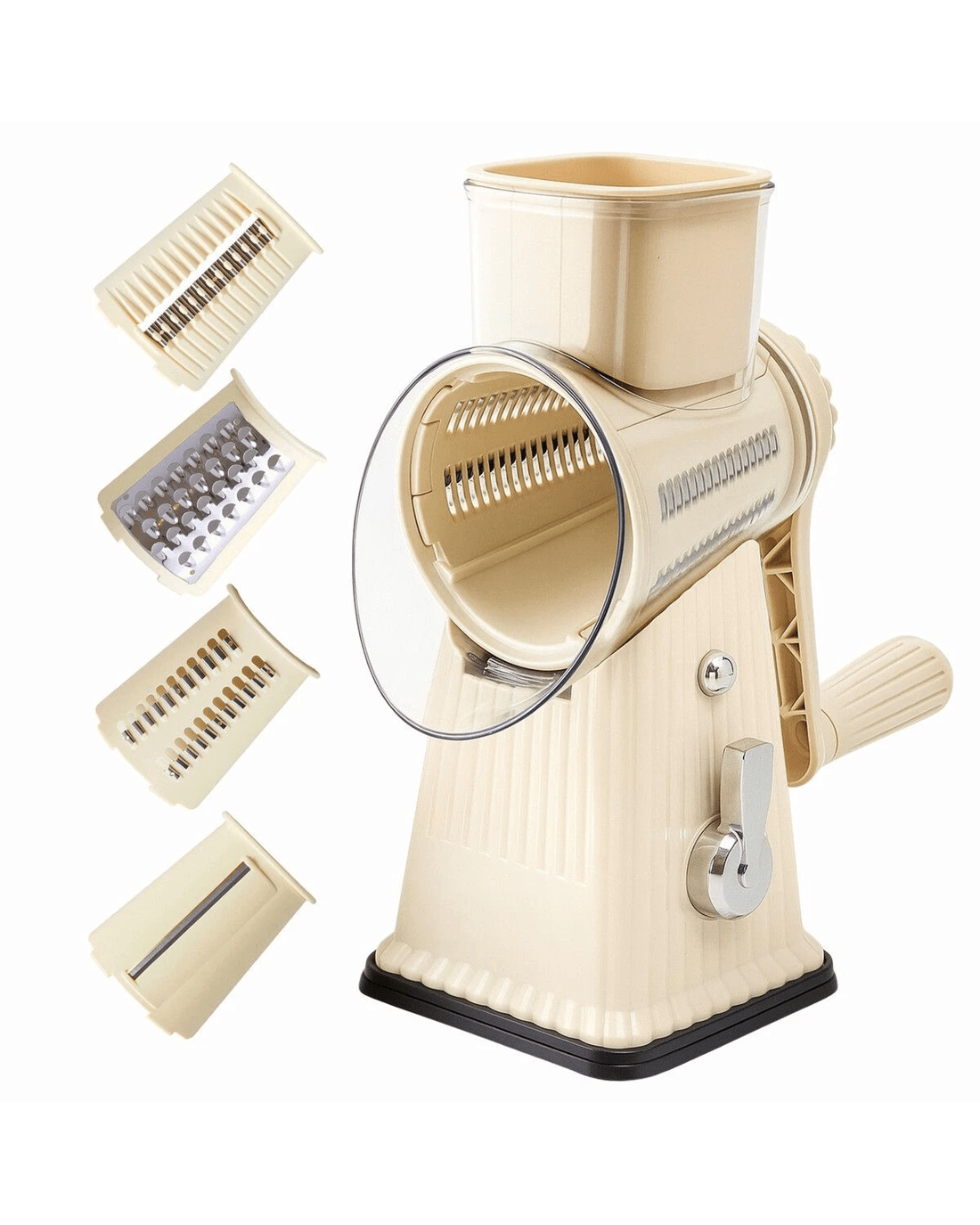 Make food prep and cooking faster and easier without sacrificing taste or flavour with our multipurpose rotary vegetable slicer, shredder and grater. Finely crafted in food-grade stainless steel, this rotary grater offers excellent sturdiness and durability, with a sleek design that complements modern and traditional kitchens. With 10 interchangeable blades, you can effortlessly cut ingredients into a variety of shapes to suit any recipe or cooking need. And its large opening and handy pusher make it simple to slice cheese, cookies, potatoes, carrots, cucumbers, onions, and more, while keeping your hands safely away from sharp edges for added peace of mind. Thanks to a built-in suction cup, the potato slicer firmly grips smooth, clean countertops like marble, preventing slips and ensuring safe operation. Hand-cranked for easy use, it’s perfect for everyday cooking at home or on the go. Cleanup is quick and simple, making maintenance hassle-free after every meal. Simplify your food preparation and enjoy a more pleasant cooking experience with this versatile 5-in-1 handheld cheese grater.