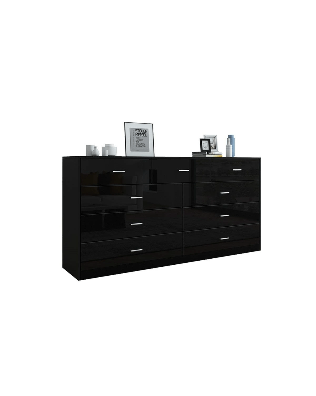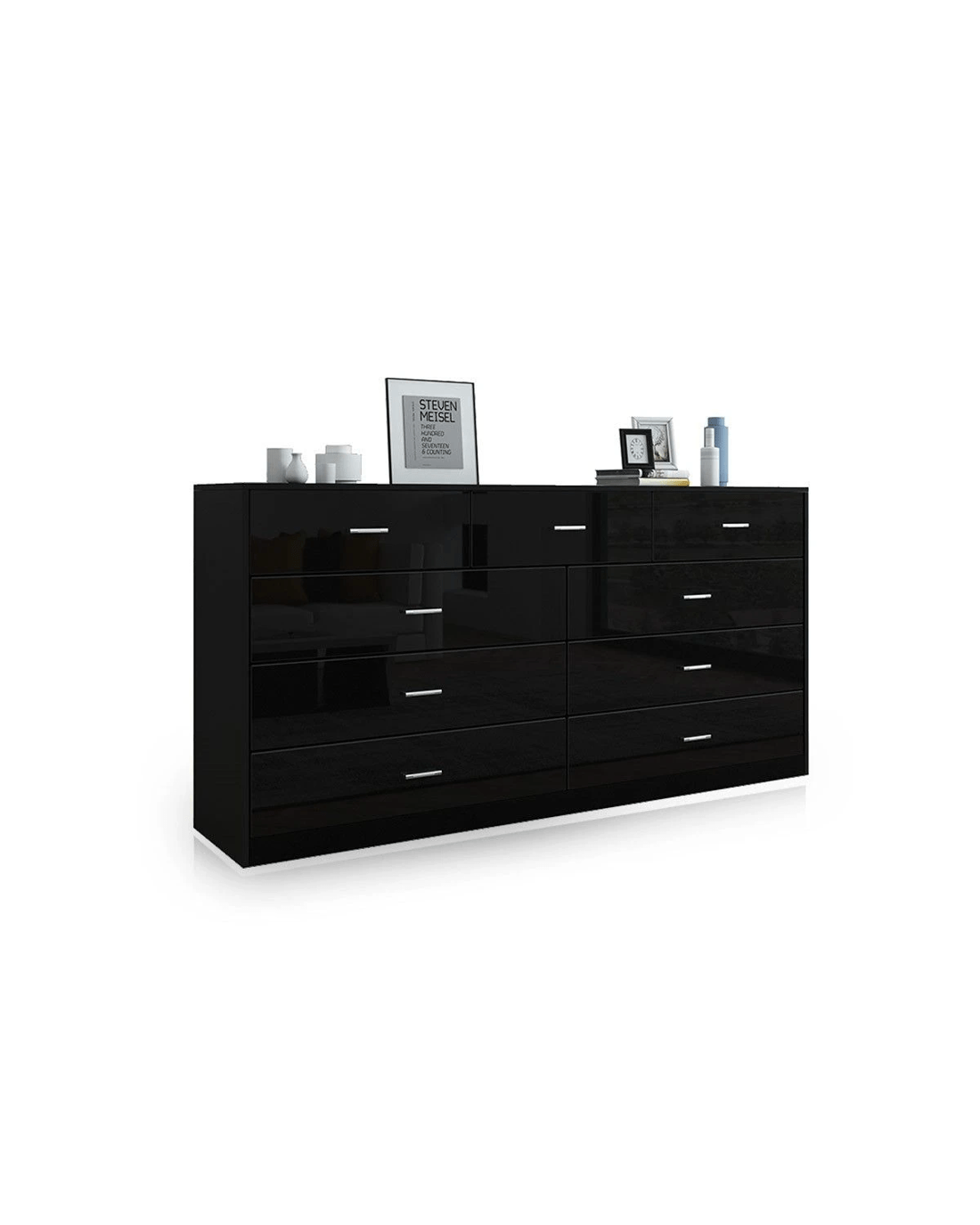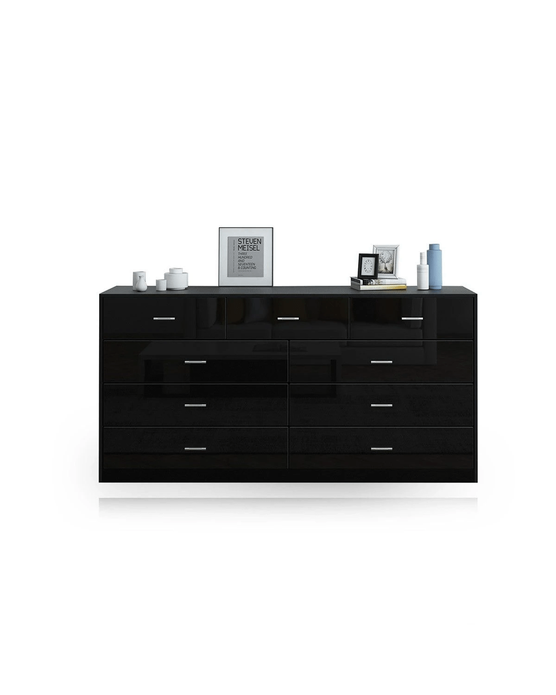 Get back to the simple and get what you need the most with this Black 9-Drawer Cabinet. The classic piece accommodates 9 drawers' worth of your clothing in the bedroom or tools and objects in the living room. Huge storage potential offers great chances for you to spruce up your interior space and keep it ever clean and tidy. Just remember to put something back to the assigned drawer whenever you have finished using it. It is a great choice for those who fancy contemporary furniture, which can also coordinate with other space-saving pieces to create a pleasing living space for you. More detailed about its quality can be seen on the sturdy construction from high-quality MDF, high-gloss front, smooth drawer glides, and more.