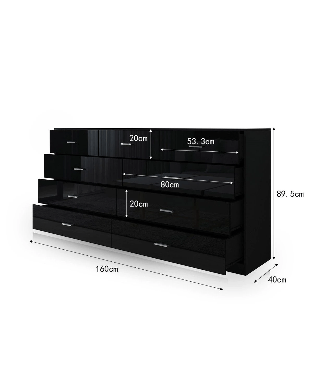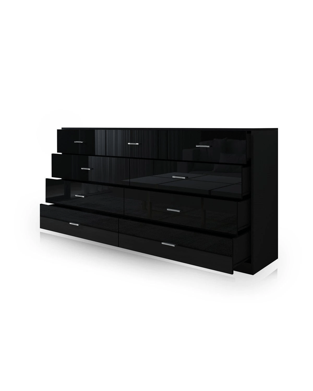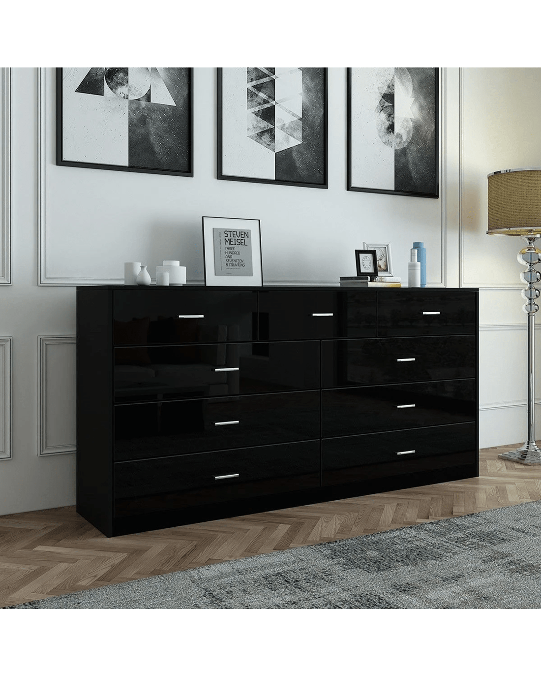 Get back to the simple and get what you need the most with this Black 9-Drawer Cabinet. The classic piece accommodates 9 drawers' worth of your clothing in the bedroom or tools and objects in the living room. Huge storage potential offers great chances for you to spruce up your interior space and keep it ever clean and tidy. Just remember to put something back to the assigned drawer whenever you have finished using it. It is a great choice for those who fancy contemporary furniture, which can also coordinate with other space-saving pieces to create a pleasing living space for you. More detailed about its quality can be seen on the sturdy construction from high-quality MDF, high-gloss front, smooth drawer glides, and more.