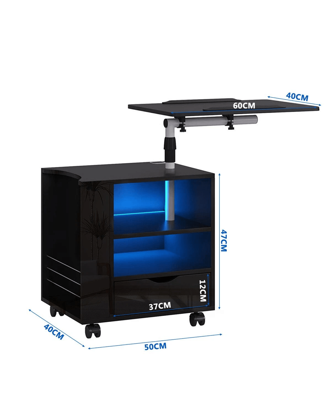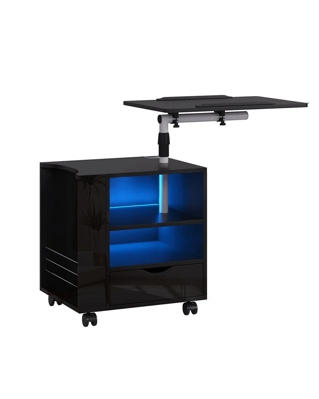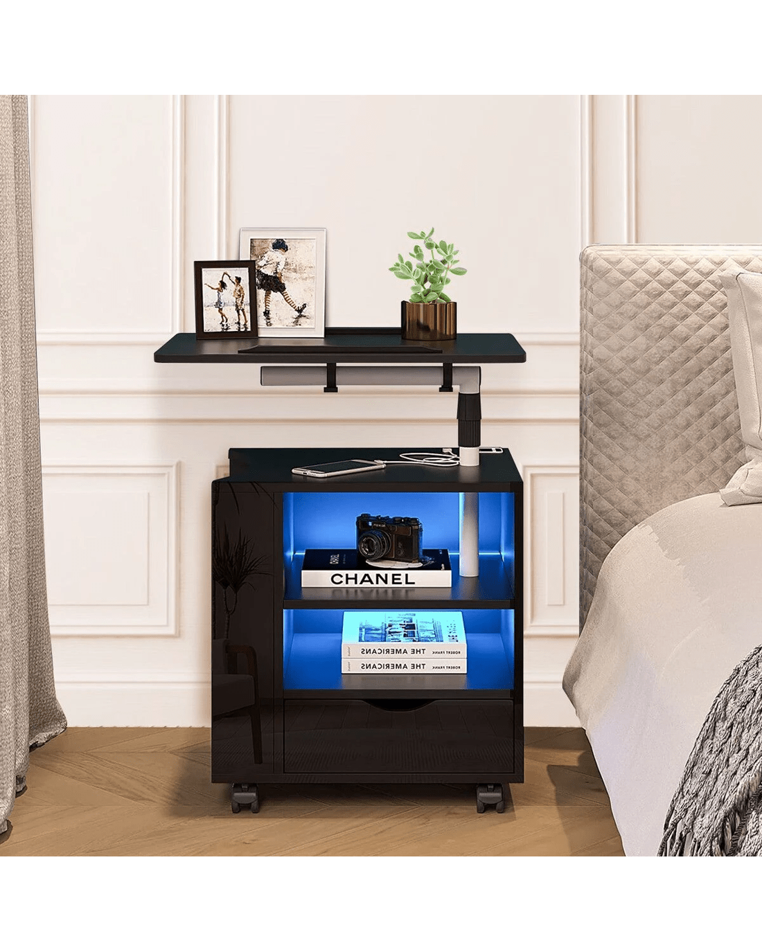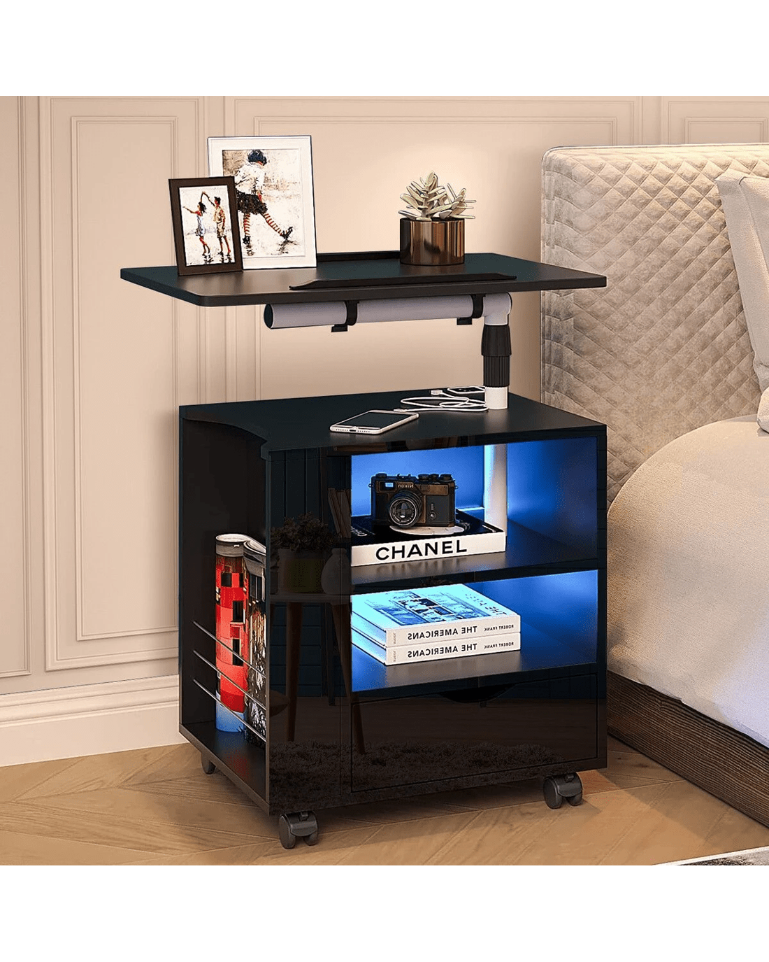 Upgrade your bedroom and facilitate access to your items with this black bedside table. Thanks to the intelligent human body induction technology, the light will automatically turn on when you are close to the nightstand within a range of three to four metres and turn off when you go away. With the tri-colour dimming light, you can enjoy blue, warm, or cool lighting depending on your mood. It can add an amazing ambience to your space and set the tone for a peaceful sleep. Featuring two USB ports, the bedside table can charge electronics at your disposal, like phones, tablets, and computers. Moreover, the adjustable height and angle of our cabinet are ideal for working or reading a book on the bed or sofa. Designed with a drawer, a rack, two shelves, and a top, this nightstand has ample space for books, alarm clocks, lamps, and other nighttime essentials. With a full high-gloss surface, the bedside cabinet highlights a contemporary appeal and fits well with any decor.
