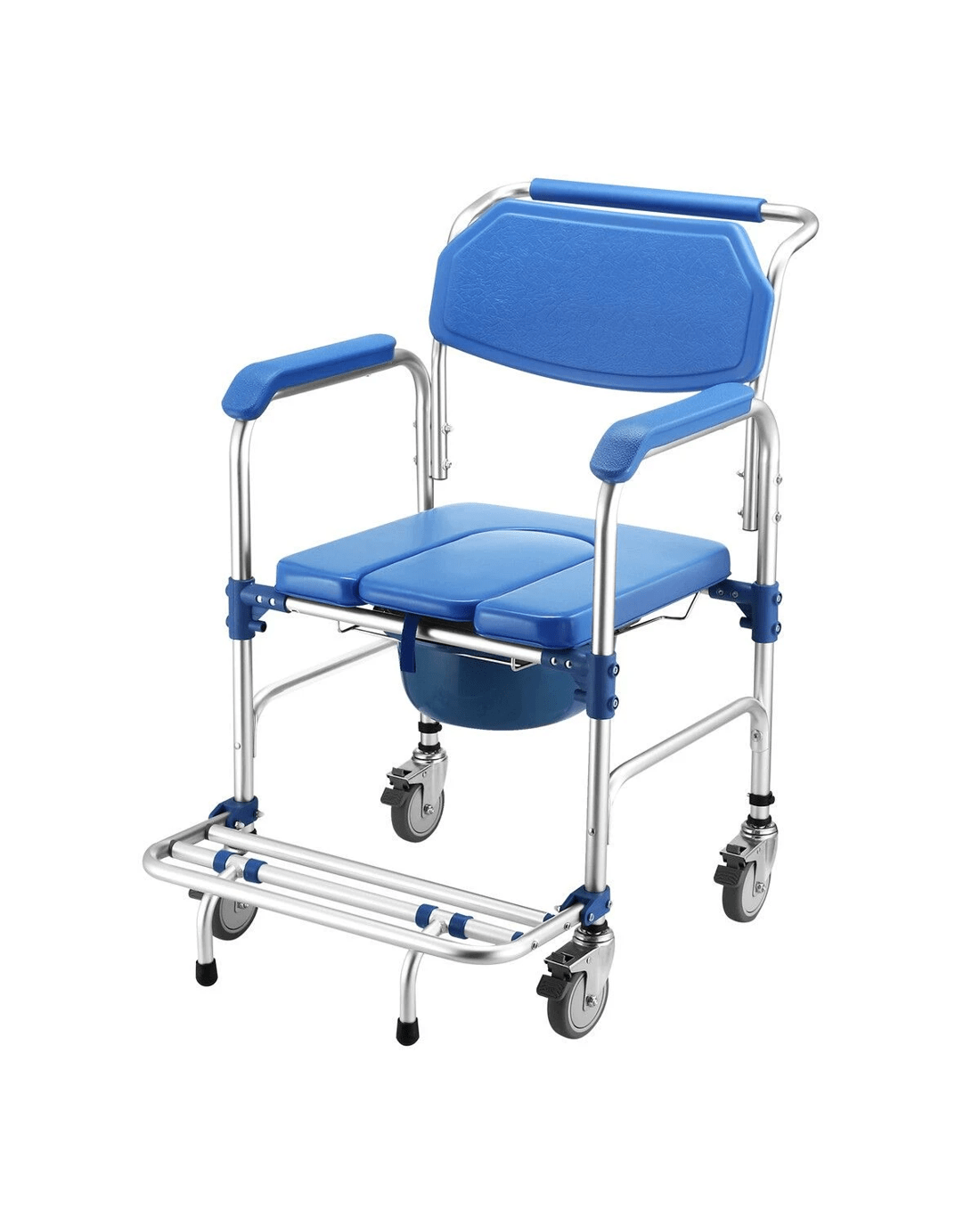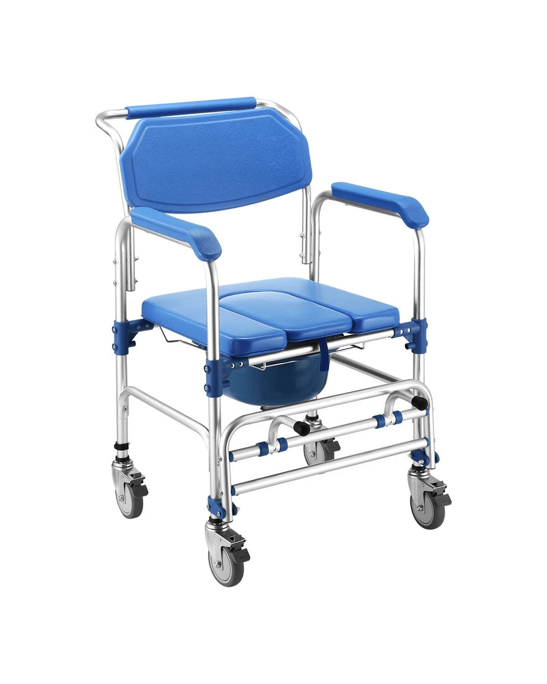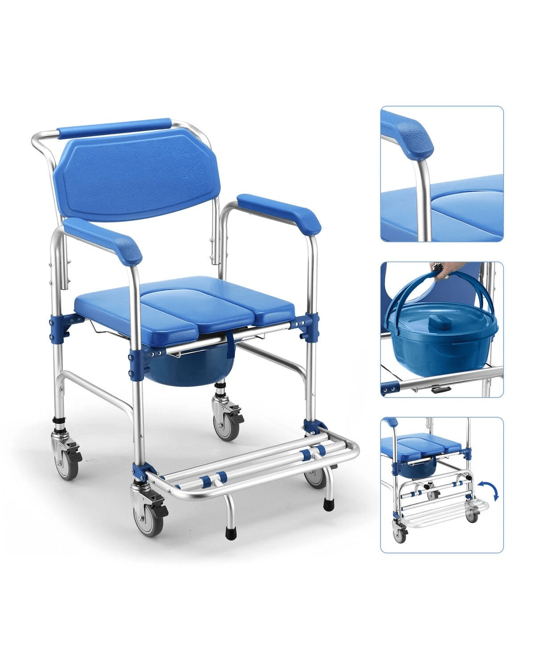 - The 3-in-1 commode chair can be used as a bedside commode with a removable bucket and lid, a commode chair with wheels for transferring into the shower, and a raised toilet seat for better general support.