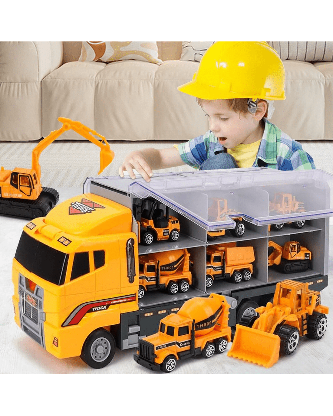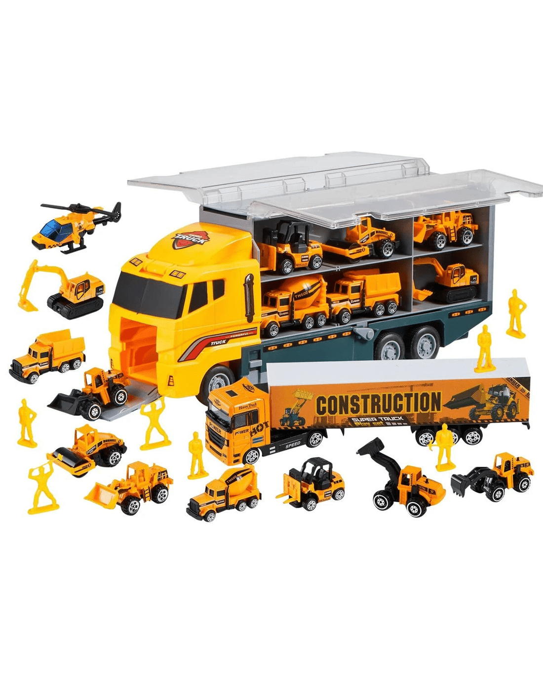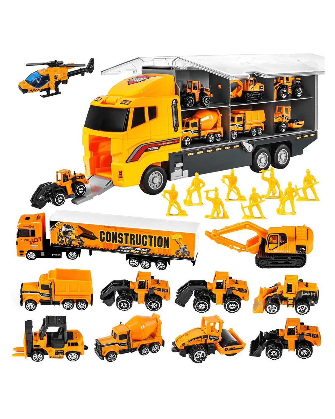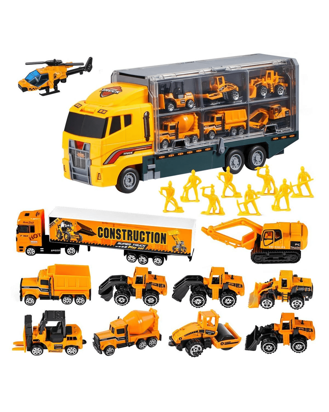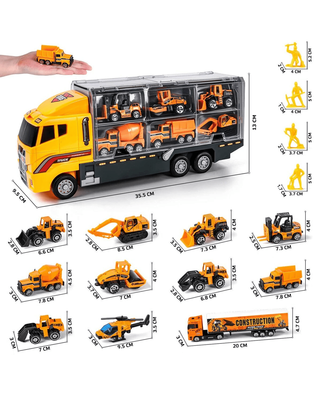 Support independent play and exercise their imagination with this construction vehicle toy set. A large truck carrier loads 10 mini construction truck toys and eight action figures that capture the essence of real-life construction machinery, offering hours of engaging and educational playtime. Plus, from wheel loaders and bulldozers to excavators and forklifts, all the car toys are perfectly sized for little hands, fostering hand-eye coordination and fine motor skills. In addition, designed with kids' safety in mind, our engineering vehicle set is crafted from sturdy and non-toxic materials with smooth edges, allowing kids to explore, play and learn without any concerns. Gift these toy cars to your little builders on their birthday, Christmas or other special occasions.