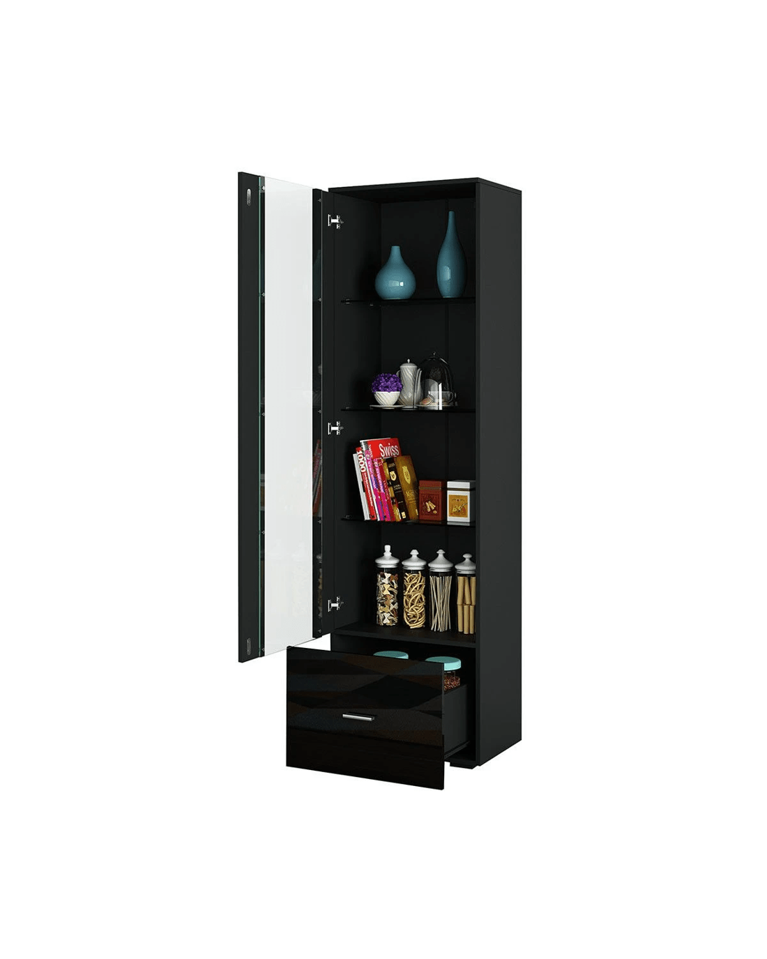 Provide a clear view of your stylish display with this tower cabinet. This black side cabinet will add a definite wow factor to your living room, dining room, bathroom or kitchen. The 190cm height cabinet integrates high glossy front panels for a modern look. The high-strength unit is built from premium particleboard for enhanced durability. It can reliably meet your various needs for a long time. The display cabinet has four shelves behind the door and one drawer at the bottom which enables you to store and organise a wide range of belongings.