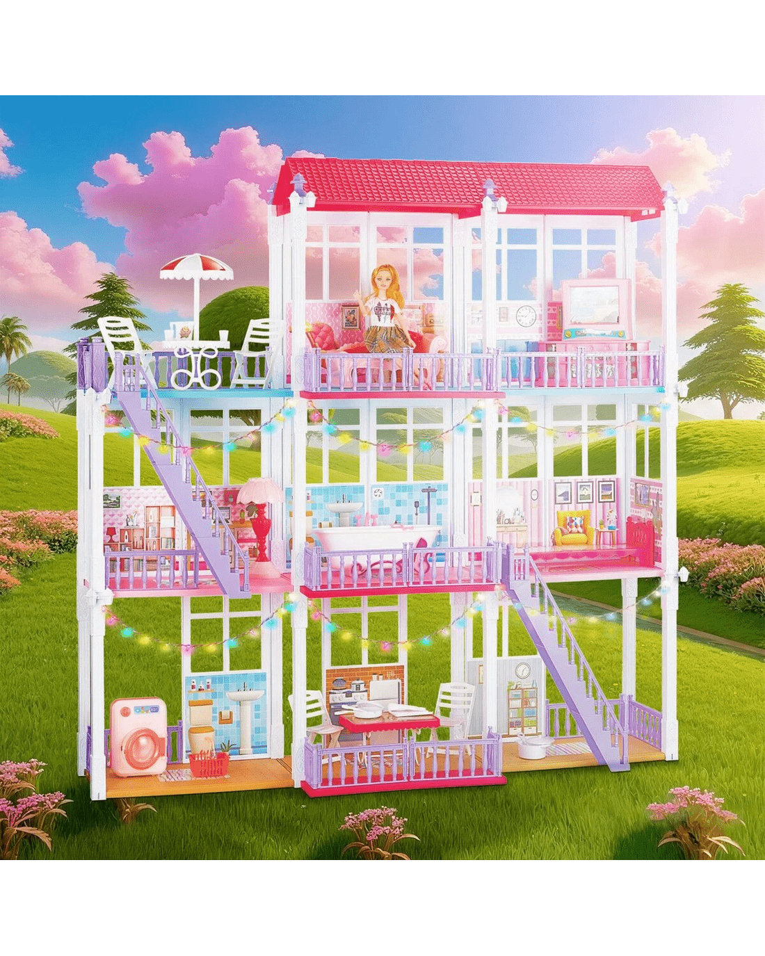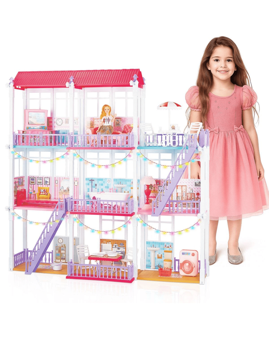Offer your preschooler hours of enjoyment through independent play with this Kids Pretend Play Doll House Dream Furniture Toys Set. Our 3-level dollhouse features eight spacious rooms, including a family bathroom, sitting room, dining area, and more. This playset comes complete with realistic home furnishings and appliances such as a lounge sofa and washing machine, creating the perfect dream home experience. Your child can assemble the dollhouse in different layouts and freely arrange furniture and accessories, sparking creativity and encouraging innovative thinking. From relaxing in a cosy bedroom to sliding into the pool from the sunny balcony, kids can explore endless role-play scenarios. Moreover, a long string of colourful lights adds a magical touch, making playtime even more enchanting. Produced from BPA-free, non-toxic plastic, this dream house is both safe and durable for years of interactive play. Its bright, vibrant colours are sure to capture children's attention, making it an amazing gift choice for birthdays, parties, Christmas, and other special occasions.